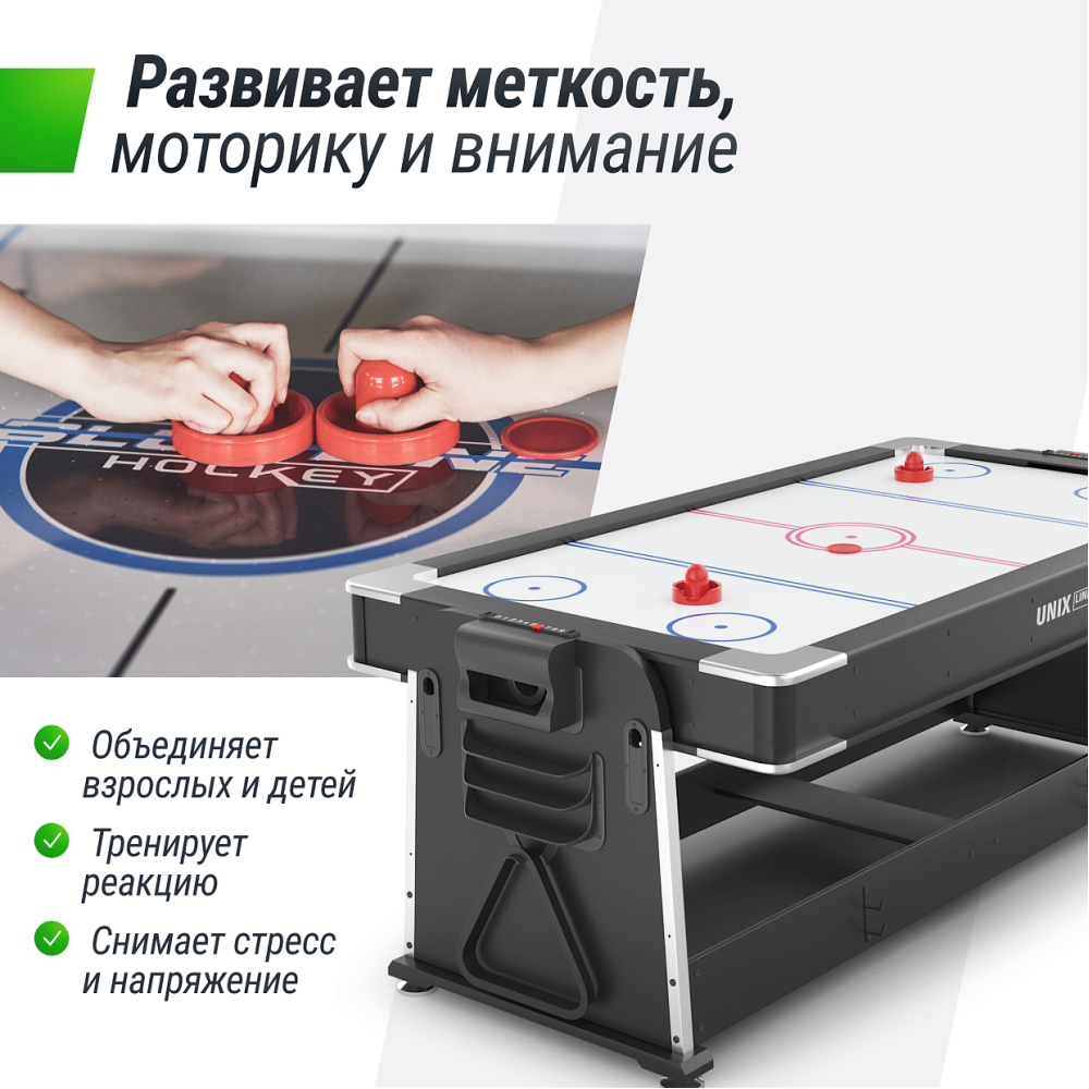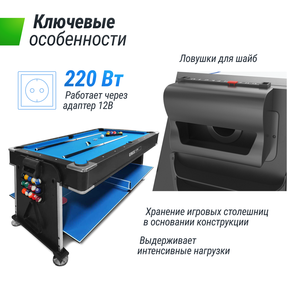 Многофункциональный игровой стол UNIX Line Трансформер 4 в 1 204х112 cм станет настоящим украшением вашего дома или офиса! Уникальный стол объединяет три популярных игры — бильярд, аэрохоккей и настольный теннис — в одном устройстве, предоставляя бесконечные часы веселья и развлечений! Особенность этого стола заключается в дополнительной столешнице, которую вы можете использовать в свободное от игр время, как обеденную зону или рабочее пространство.. Стол позволяет вам наслаждаться тремя различными играми без необходимости приобретать отдельные устройства. Переключайтесь между бильярдом, аэрохоккеем и настольным теннисом всего за несколько минут . Выполненный из МДФ повышенной прочности, игровой стол гарантирует долговечность и устойчивость к интенсивным играм. Прочные поверхности, надежные механизмы и качественная отделка обеспечивают долгий срок службы и сохранение отличных игровых характеристик. . Стол трансформер предлагает вам насладиться игрой в аэрохоккей – динамичная игра, требующая мгновенной реакции и быстрых движений. Также на столе можно играть в настольный мини бильярд, он не только развлекает, но и развивает навыки стратегического мышления, точности и координации движений. Также стол может использоваться для игры в пинг-понг. Настольный теннис - это игра, которая развивает координацию, реакцию и концентрацию . Специально разработанная система вращения стола на 360° позволяет легко и быстро менять игровые поверхности. Просто снимите одно поле и установите другое — и вы готовы к новой игре! Это делает стол идеальным выбором для вечеринок, семейных встреч и корпоративных мероприятий. Стол можно использовать также без игровых полей. Специальная панель превращает игровой стол в обеденный . К каждому из 3 полей в комплекте идут необходимые аксессуары для игры, чтобы вы сразу могли насладиться новым универсальным столом трансформером! . Несмотря на свою многофункциональность, стол занимает минимальное пространство благодаря продуманному дизайну. Он идеально подходит для квартир, домов или офисов, где важно сохранить свободное пространство. Многофункциональный стол выполнен в современном и элегантном дизайне, который прекрасно впишется в любой интерьер . Этот стол идеально подходит для игроков всех возрастов. Дети могут развивать свои навыки в пинг-понге, подростки могут сразиться в аэрохоккей, а взрослые могут насладиться классической игрой в бильярд. Это отличное решение для семейного досуга и дружеских встреч! . . Преимущества . - Вращение на 360° для быстрой смены игры. - Набор аксессуаров в комплекте. - Безопасные материалы . - Нескользящие обрезиненные рукоятки . - 3 игры в 1: аэрохоккей, бильярд, настольный теннис. - Мощный вентилятор. - Работает от сети 220В. - Ловушки для шайб. - Хранение игровых столешниц в основании конструкции. - Выдерживает интенсивные нагрузки. - Закругленные углы. - Усиленная и устойчивая конструкция. - Дополнительные ребра жесткости. - Вся продукция сертифицирована. - Экологичные материалы. - Компенсаторы неровности пола. - Механический счётчик очков 2 шт.. - Крепление для кия на корпусе. - Крепление для треугольника и бильярдных шаров. - Крепление для хранения шаров, шайб и страйкеров. - Бильярд: размер игрового поля 179,2 х 87,7 см; ; аксессуары в комплекте: кий 2 шт. - 145 см, шары - 1 комплект, диаметр 