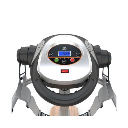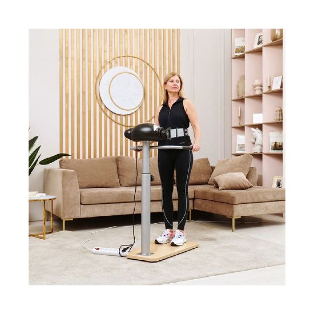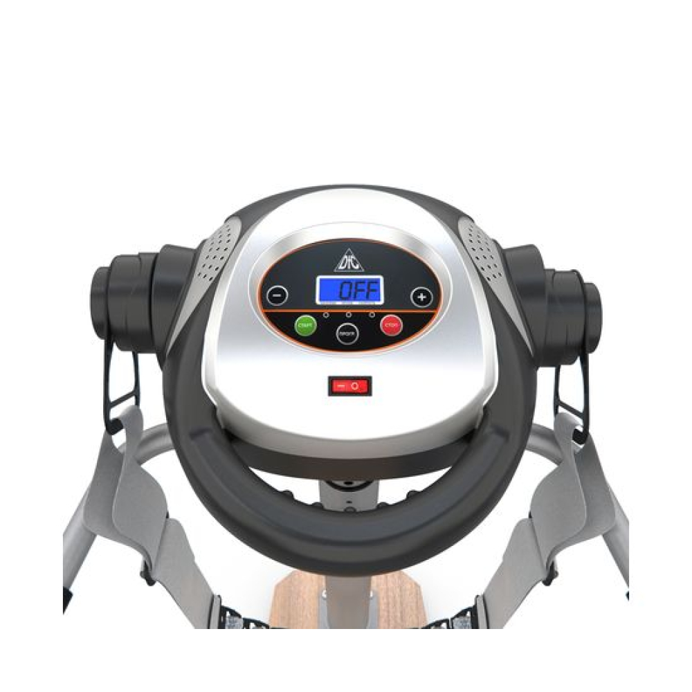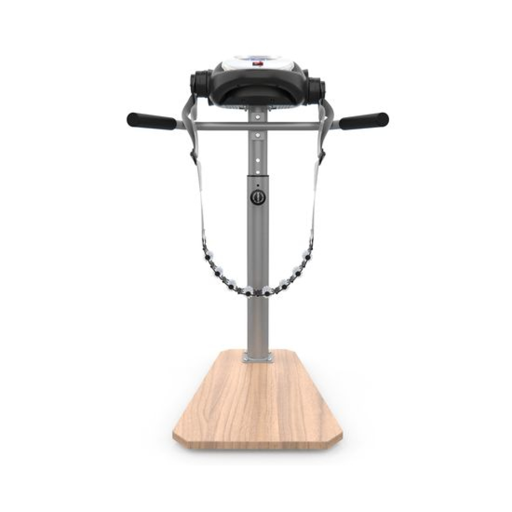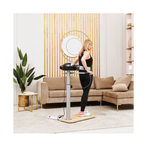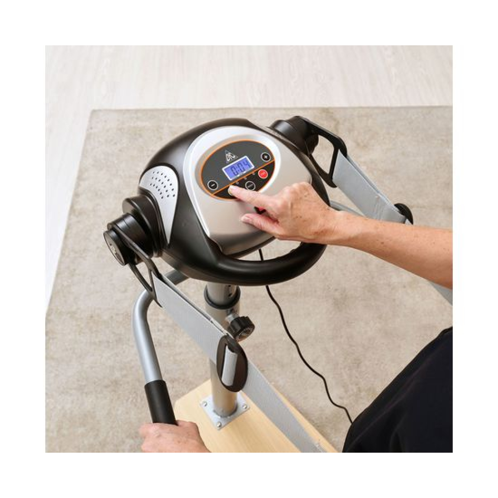 Ленточный вибромассажёр VM20H на устойчивой деревянной платформе. Он помогает поддерживать в тонусе различные группы мышц, расслаблять их и снимать боль после тренировок, а также способствует быстрому расщеплению жировых клеток. При использовании на проблемных зонах помогает убрать «апельсиновую корку». Два пояса в комплекте.Регулировка тренажёраТренажёр позволяет регулировать высоту консоли в 5-ти положениях по вертикали. Массажёр VM20H работает на 20-ти разных скоростных режимах, которые вы сможете подобрать в зависимости от задач и области воздействия. Мотор постоянного тока мощностью 100 Ватт. Есть 6 встроенных режимов тренировки, а также ручной, обратный отсчёт времени и калорий.Удобство конструкцииМассажёр имеет компактную и надёжную конструкцию. В качестве основания использована гальваническая труба диаметром 76 мм и толщиной 1,5 мм. Платформа выполнена из прочной древесины. Максимально допустимый вес пользователя — 110 кг. В комплектацию входят 2 массажных пояса, которые крепятся к передней консоли. Для удобства и безопасности предусмотрены два поручня по бокам.МультимедиаКонсоль с панелью управления оснащена монохромным дисплеем с подсветкой яркого синего цвета. На нём отображаются данные тренировки: время, скорость работы ремня, выбранная программа, затраченные калории. Поручень консоли с массажными выпуклостями.