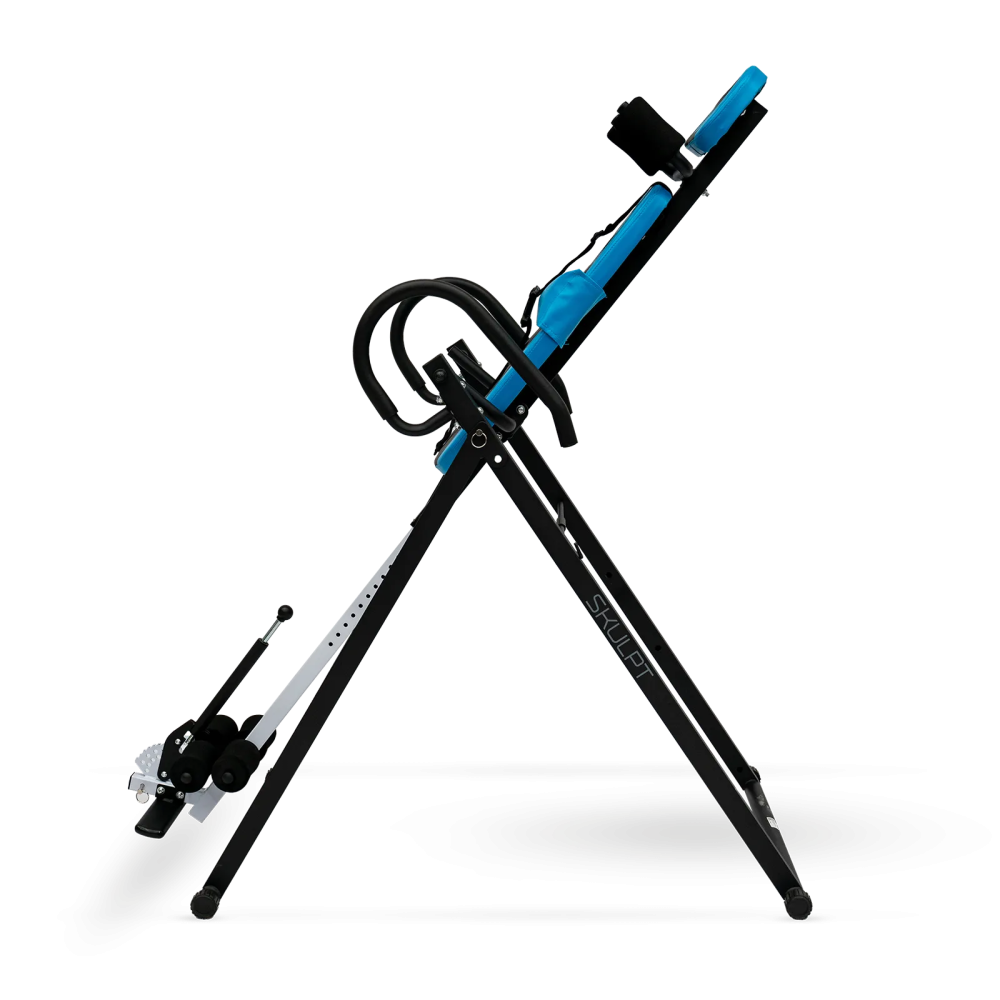 Инверсионный стол SKULPT отличается прочной и легкой конструкцией, что делает его идеальным выбором для тех, кто ценит комфорт, безопасность и компактное хранение. В сложенном состоянии стол занимает минимум места, что позволяет легко хранить его даже в небольших помещениях.