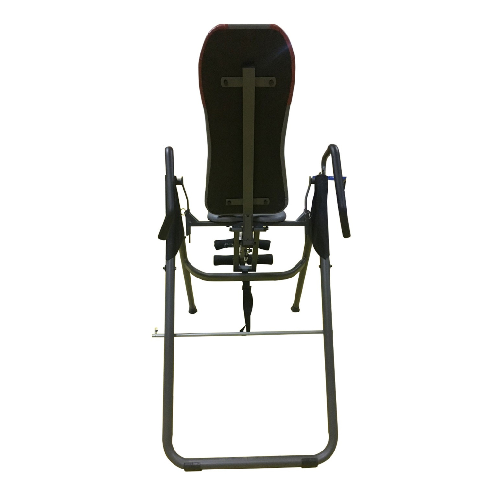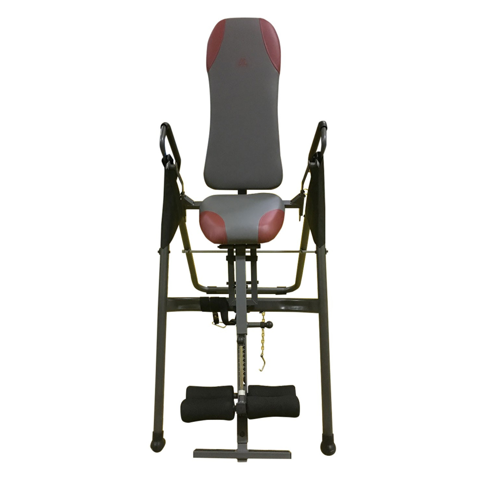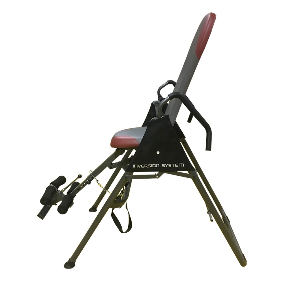 Данный стол относится к разряду складных моделей. Регулировка и фиксация угла наклона при занятии происходит с помощью ремня. Перед упражнением необходимо встать рядом, перевернуть стол до нужного вам угла и далее выбрать лишнюю длину ремня с помощью пряжки. Дополнительным фиксатором на данной модели является страховочный штырь с зажимом. Если вы планируете висеть вниз головой под углом 90 градусов к полу, то необходимо просто отстегнуть ремень и убрать штырь. Отдельно остановимся на конфигурации самого стола. В начальном положении он имеет форму стула, что очень удобно. Вы просто садитесь на него и из этого положения фиксируете ноги с помощью подпружиненных валиков. Далее вам необходимо немного отклонится назад, чтобы стул распрямился с помощью встроенного амортизатора и принял форму стола. Стол фиксируется в таком положении. И дальше вы начинаете переворот головой вниз. После упражнения вы возвращаетесь в исходное горизонтальное положение, и из него трансформируете тренажер снова в стул. Все. Можно сидя на стуле уже освободить ноги. На данной модели инверсионного стола предусмотрен выбор режима инверсии (с помощью ремня и стержня): легкий (угол до 22 гр), средний (угол от 22 до 55 гр), профессиональный (от 55 гр). Складная модель. Регулировка под рост пользователя. Для фиксации ног на столе спереди и сзади имеются валики. Инверсионные упражнения помогут Вам: Устранить или ослабить боль в спине Улучшить осанку Cнять стресс и напряжение в мышцах Снизить действие старения, вызванное силой тяжести Увеличить приток кислорода к головному мозгу Облегчить состояние при варикозном расширении вен Укрепить связочный аппарат Улучшить кровообращение и ускорить очищение крови и лимфатической жидкости