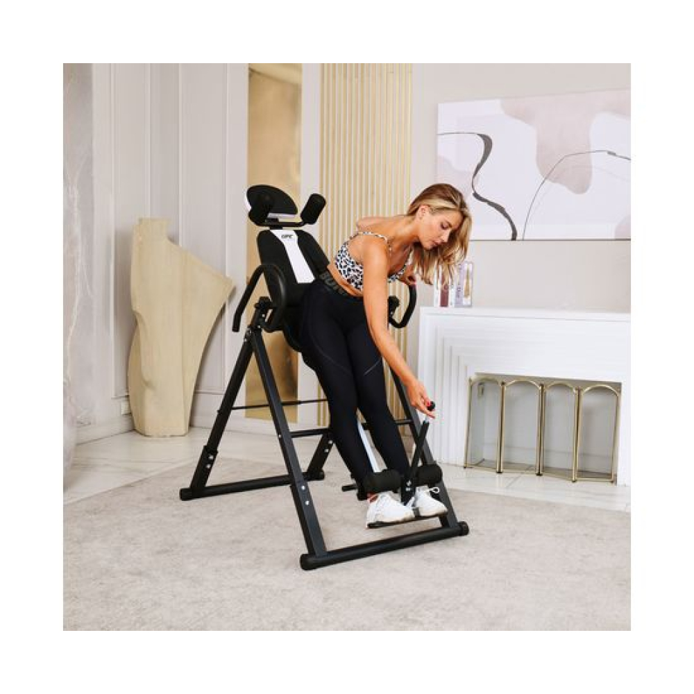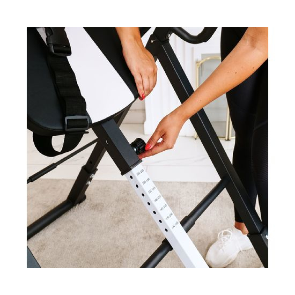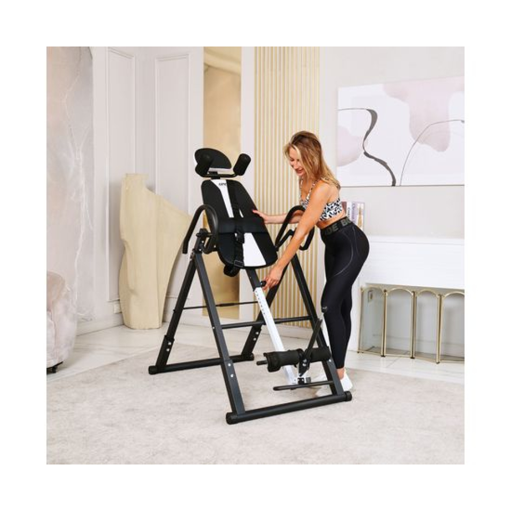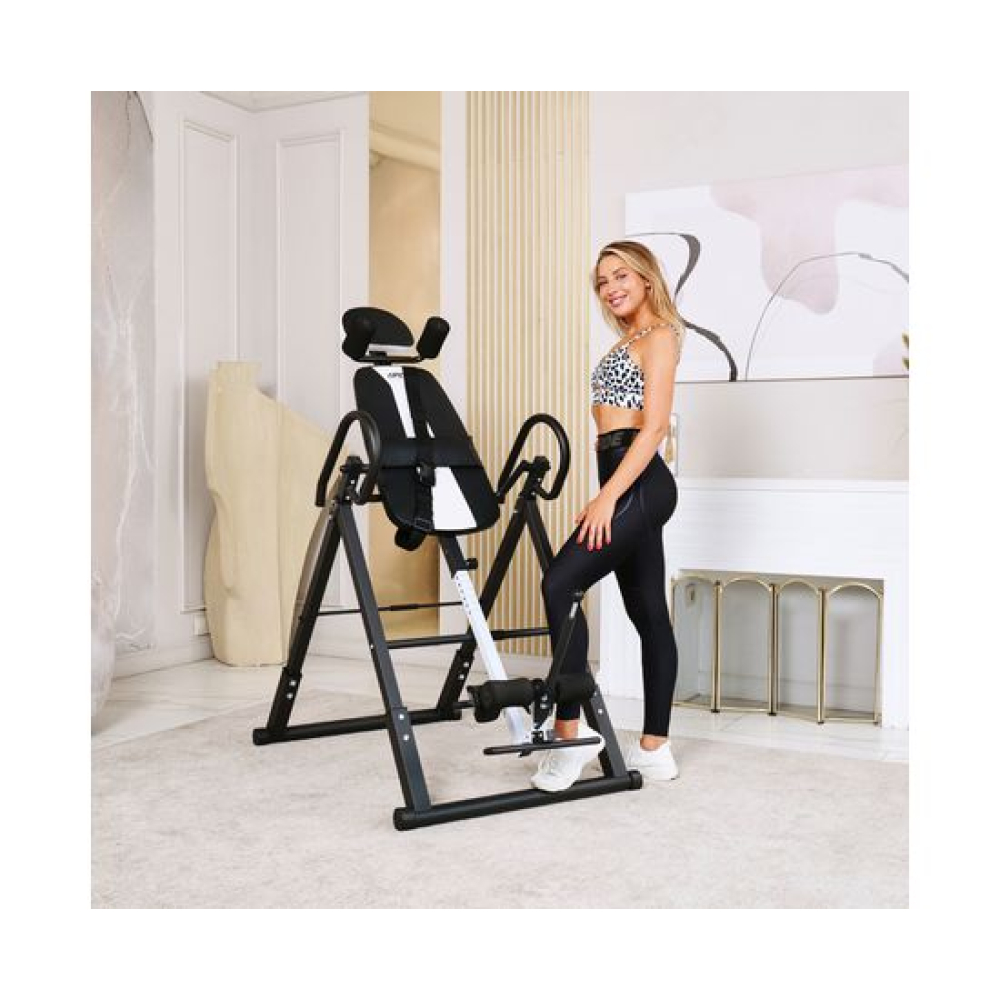 Инверсионный стол DFC IT6312B-B — это удобный и эффективный тренажёр для улучшения осанки, укрепления связок и улучшения кровообращения. Он имеет спинку чёрного цвета с валиками под голову и съёмную подушку под поясницу для дополнительного комфорта. Страховочный ремень входит в комплект, а валики оснащены подпяточниками для удобства использования.Максимальный вес пользователя составляет 150 кг. Ограничитель угла наклона в виде перекладины позволяет регулировать угол наклона в трёх положениях. Складная конструкция стола облегчает хранение и транспортировку.