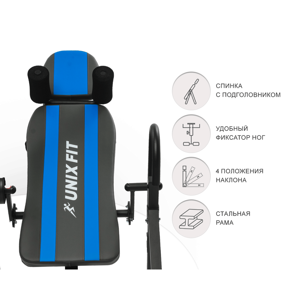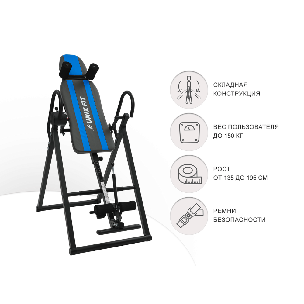 Модель инверсионного стола UNIX Fit IV-150S представляет собой идеальное сочетание функционала и практичности. Благодаря складной конструкции, тренажер не занимает много места и легко впишется в любую квартиру. Стол предназначен для растяжки позвоночника и расслабления мышц, что помогает улучшить кровообращение и снять напряжение после долгого дня на работе или интенсивных тренировок.. . К положительным эффектам инверсионной доски можно также отнести: . - улучшение кровообращения. - стимуляция лимфатического оттока. - снятие напряжения на межпозвоночные диски, тем самым устранение болевого эффекта. - укрепление суставов и связок. - снижение вероятности варикозного расширения вен. - увеличение количества эндорфинов, уменьшение депрессии, беспокойства и стрессов.. . Инверсионная доска имеет удобную и прочную стальную конструкцию со сварными швами, которая выдерживает нагрузку до 150 кг и обеспечивает безопасность во время использования. Двухслойная порошковая окраска рамы сохранит внешний вид тренажера от внешнего воздействия на долгие годы.. . 4 положения регулировки угла наклона помогут настроить стол под свои индивидуальные потребности и получить максимальную пользу от процедуры растяжки. Спинка с подголовником, удобный фиксатор для ног и прочные ремни безопасности обеспечат комфорт и безопасность во время занятий на тренажере. . . Складная конструкция позволит использовать стол в качестве домашнего инверсионного тренажера, который можно убрать после тренировки и он не займет много места. . . Инверсионный стол поможет начать путь к здоровой и сильной спине прямо у себя дома! Благодаря прочному каркасу рамы, стол выдерживает максимальный вес до 150 кг. Устойчиво стоит на полу во время тренировок. Преимущества инверсионного стола UNIX Fit IV-150S: - Прочный ремень безопасности, не скользит и не растягивается. - Длинный рычаг для фиксации ног, избавит от наклонов и сгибаний. - 4 положения угла наклона: 90°, 120°, 150°, 180°; - Фиксаторы для лодыжек оснащены удобными вкладышами анатомической формы; - Мягкая и удобная спинка обеспечивает комфорт во время тренировки; - Фиксатор для плеч создаёт дополнительную защиту; - Компактность – тренажер имеет складную конструкцию. Размеры стола в рабочем состоянии 135 х 72 х 158,5 см, размеры в собранном виде 77 х 72 х 191 см. - Надежность. Тренажер изготовлен из высококачественной стали, сварные соединения имеют усиление, что обеспечит вам полную безопасность. - Двухслойная порошковая окраска рамы сохранит внешний вид тренажера от внешнего воздействия. - Фиксируется в собранном положение. Товар поставляется в разобранном виде. Мы с удовольствием предоставим услугу по сборке тренажера за дополнительную плату. Организуем доставку по РФ и странам СНГ. Регулярные тренировки помогут вам обрести хорошую физическую форму, получить заряд энергии и позитивное настроение! Тренируйся с удовольствием и с UNIX Fit!.