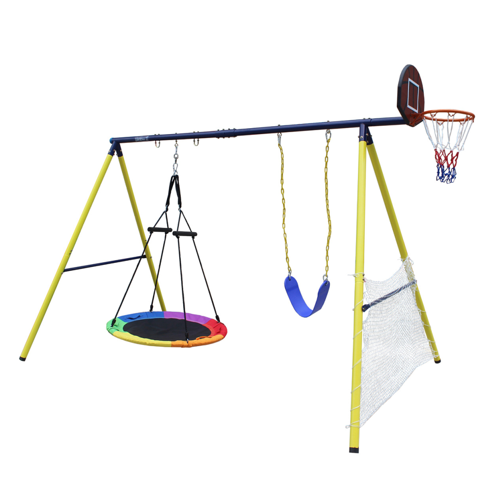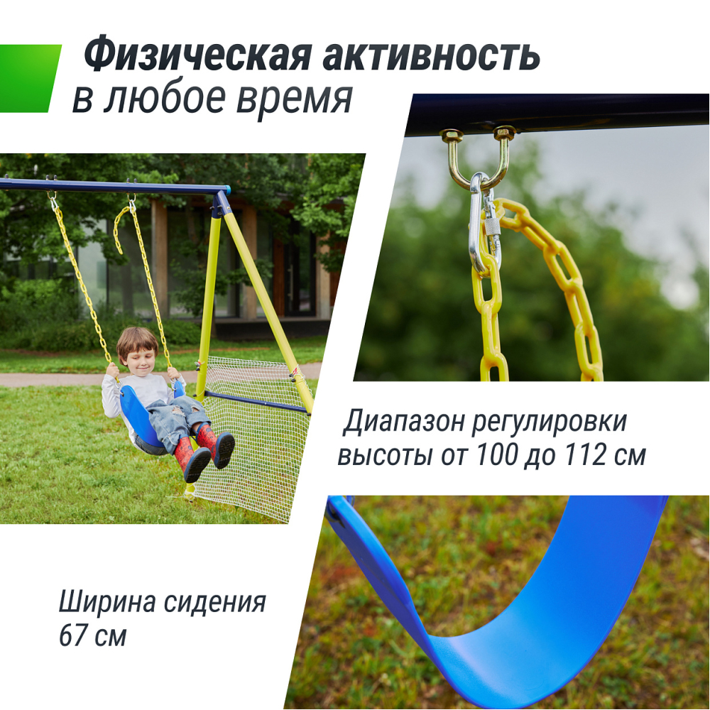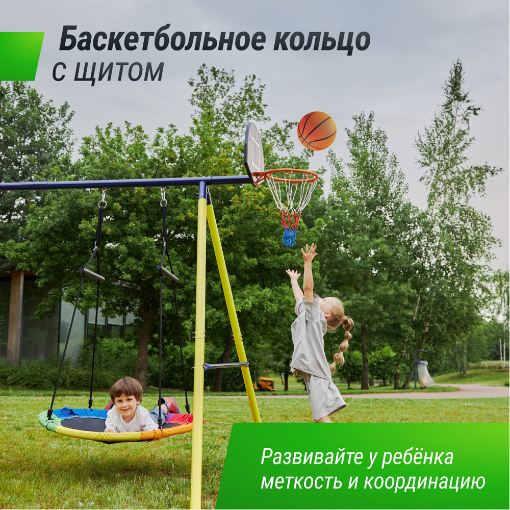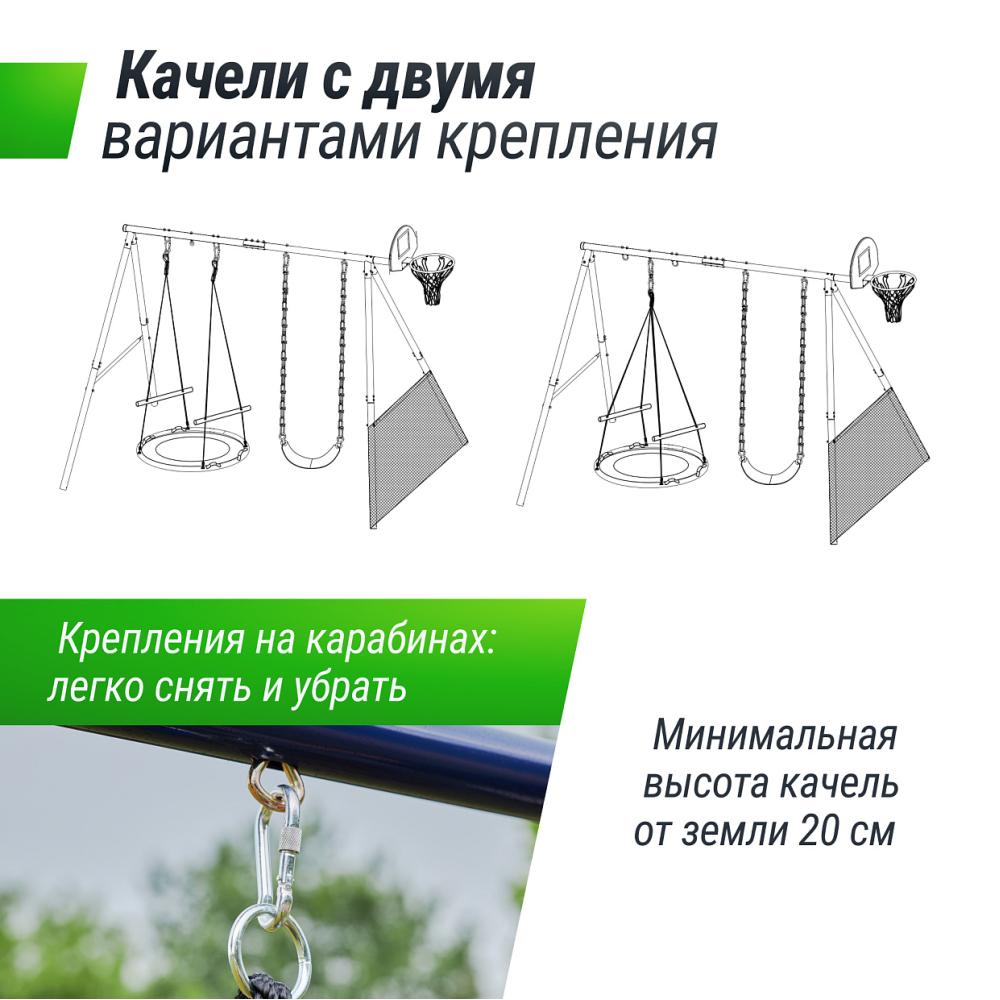 | Комплектация | Качели-гнездо, пластиковые качели, сетка футбольная, колышки, баскетбольное кольцо с сеткой, инструкция |
