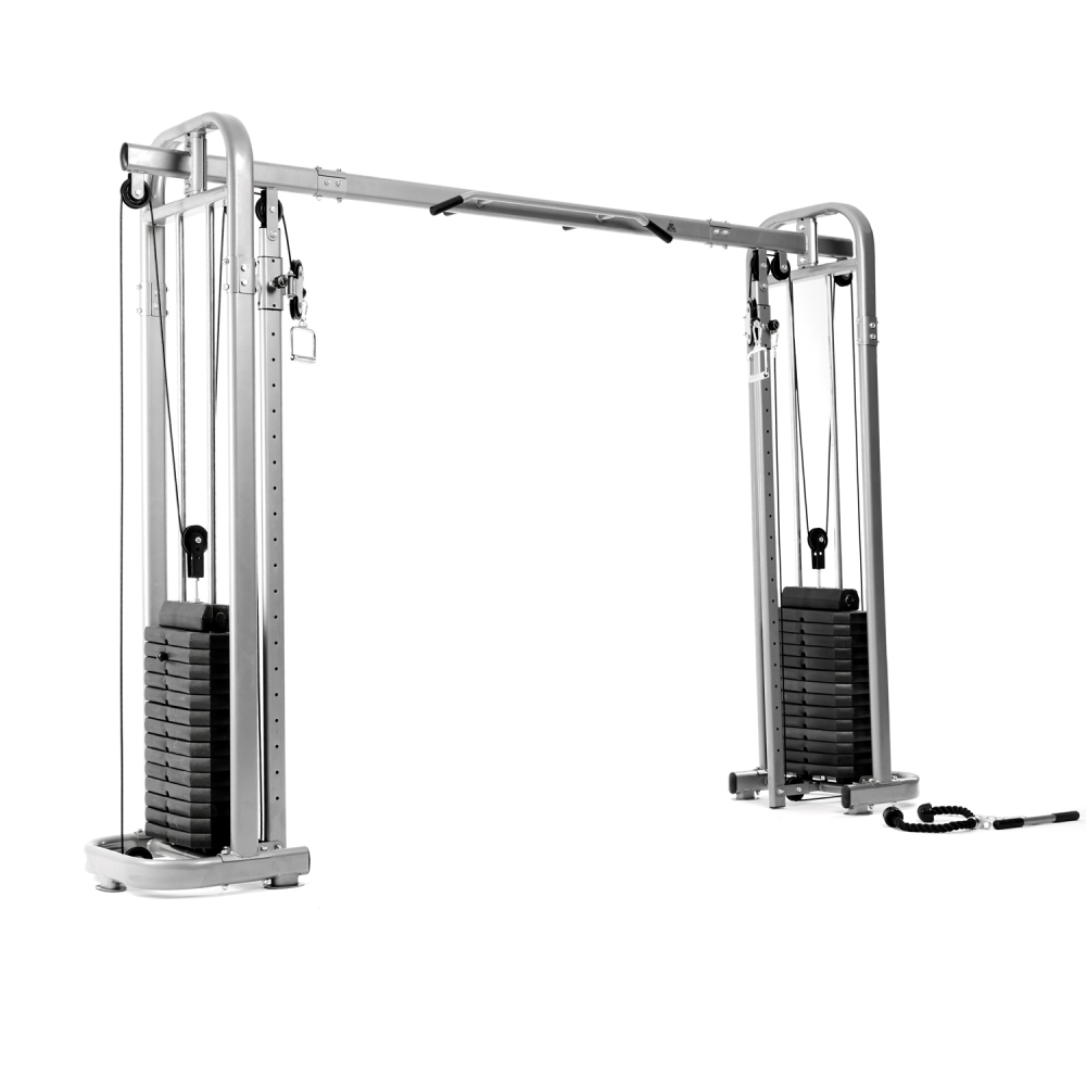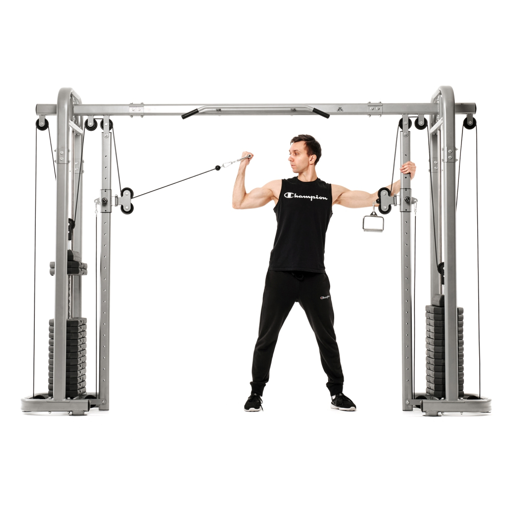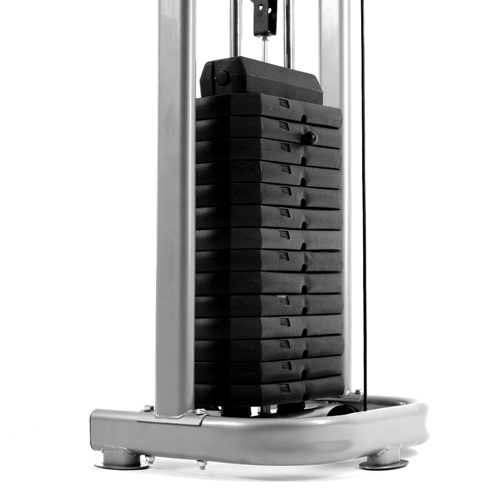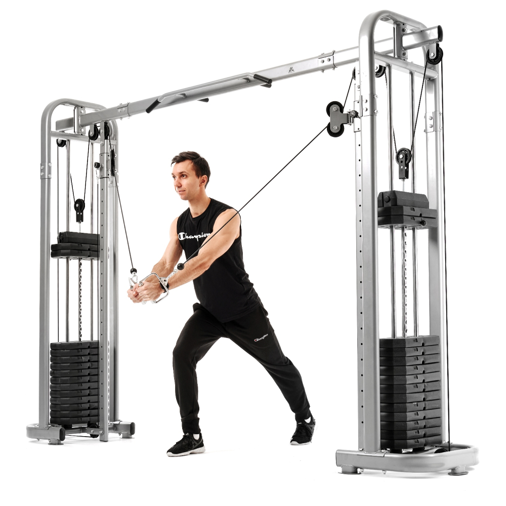 Силовая рама DFC D1009 со встроенным весом предназначена для домашнего использования, позволяет прокачивать все мышцы тела благодаря возможности регулировки. На кроссовере можно выполнять тягу руками (в разных положениях), приседания с весом и махи, упражнения на укрепление мышц кора, подтягивания. Силовые стеки весом по 75 кг входят в комплектацию. Вес пластин — 4 и 5 килограмм, материал изготовления - обрезиненная пластиком бетонная плита. Общая нагрузка регулируется при помощи фиксатора одним движением руки. Плавность хода стеков гарантируют ролики на подшипниках. Основа всей конструкции — рама из трубы размерами 40 х 80 х 1,5 мм. Опции кроссовера: Турник с широким хватом Турник с нескользящими ручками, входящий в комплектацию, выдерживает вес до 100 кг. Положение рук широким хватом хорошо укрепляет спину, руки и плечевой пояс. Турник с узким хватом Узкий хват турника способствует укреплению мышц спины, рук, плечевого пояса и грудных мышц. Канат для тяги В комплектацию входит канат для упражнений на трицепс и бицепс (сгибания, разгибания рук), мышцы плеч и кора (упражнение «священник»). Он крепится к регулируемой по высоте каретке. Тяга сверху Кроссовер оснащён металлическими ручками с нескользящим хватом, которые регулируются по высоте в 11 положениях. При выполнении упражнений с верхней тягой, нагружаются мышцы рук, груди и верхнего отдела спины. Тяга снизу Тяга снизу нагружает помимо грудных мышц, бицепс, трицепс и дельтовидные мышцы плеча. Ручка для тяги сверху и снизу Ручка, входящая в комплект кроссовера, позволит более точечно прокачать мышцы бицепса или трицепса.
