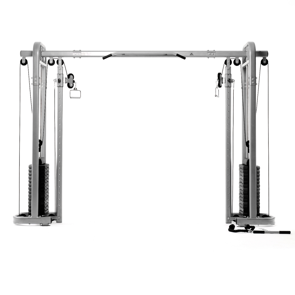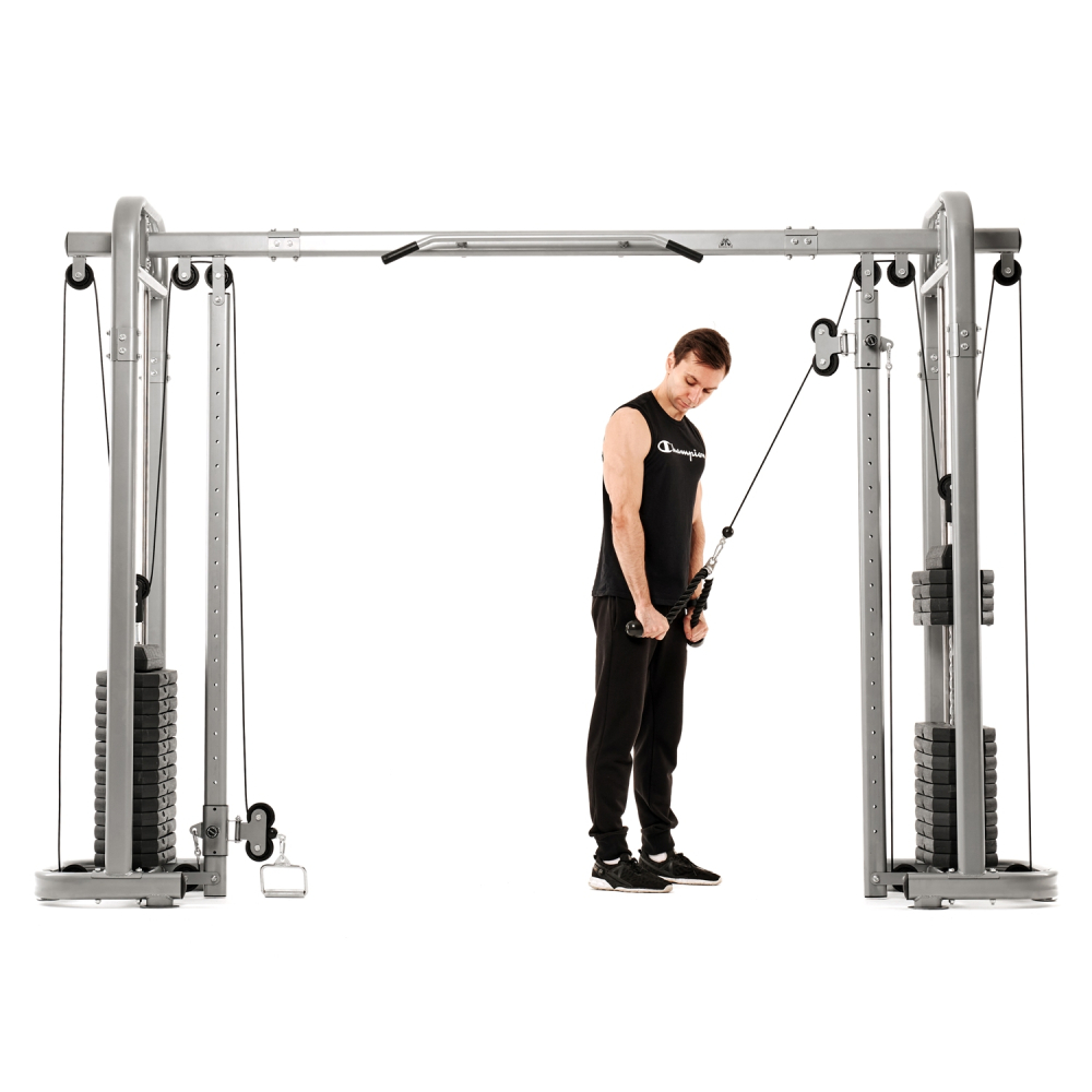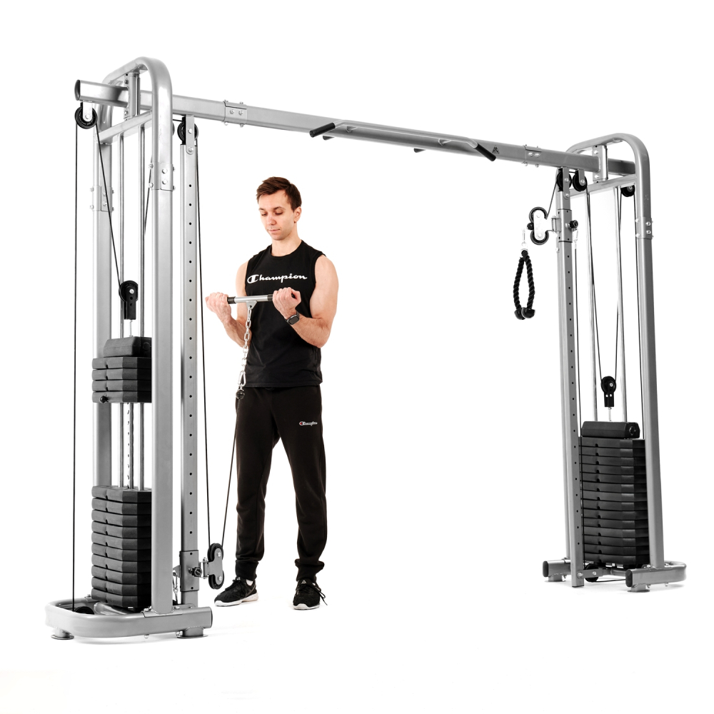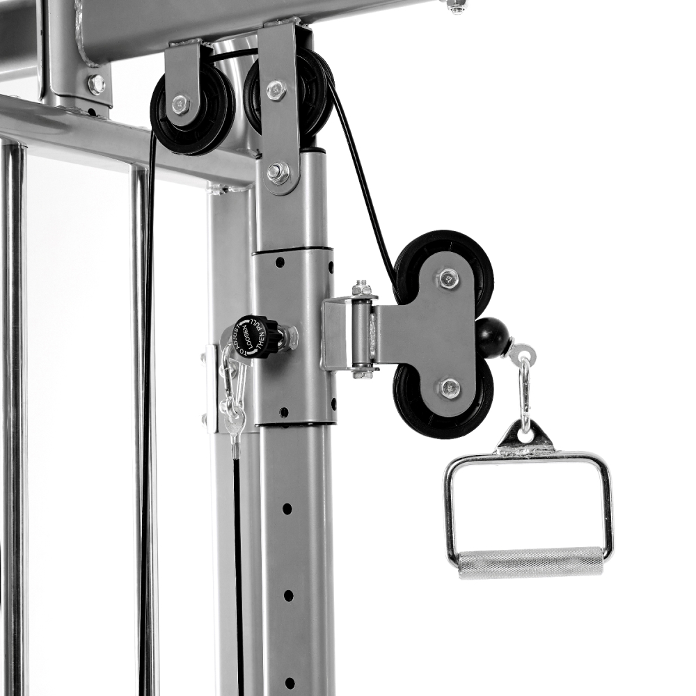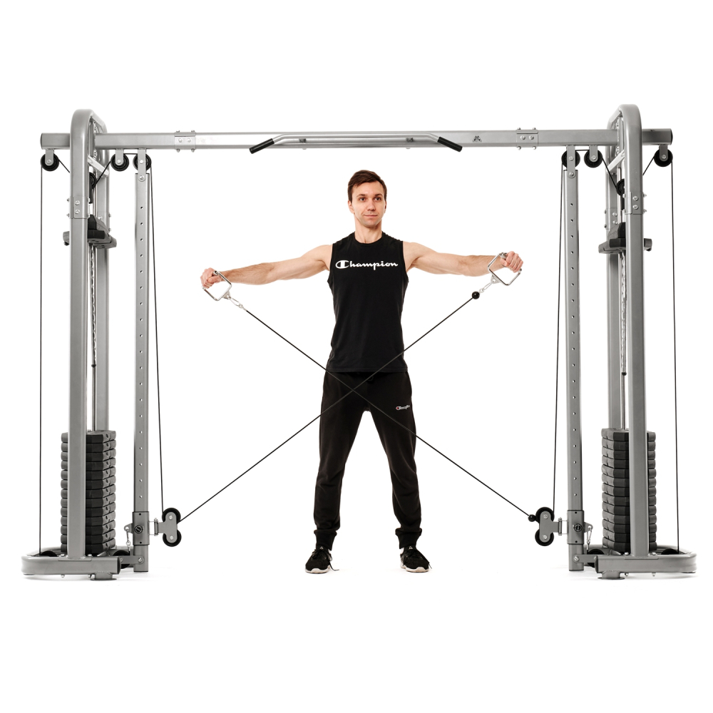 Силовая рама DFC D1009 со встроенным весом предназначена для домашнего использования, позволяет прокачивать все мышцы тела благодаря возможности регулировки. На кроссовере можно выполнять тягу руками (в разных положениях), приседания с весом и махи, упражнения на укрепление мышц кора, подтягивания. Силовые стеки весом по 75 кг входят в комплектацию. Вес пластин — 4 и 5 килограмм, материал изготовления - обрезиненная пластиком бетонная плита. Общая нагрузка регулируется при помощи фиксатора одним движением руки. Плавность хода стеков гарантируют ролики на подшипниках. Основа всей конструкции — рама из трубы размерами 40 х 80 х 1,5 мм. Опции кроссовера: Турник с широким хватом Турник с нескользящими ручками, входящий в комплектацию, выдерживает вес до 100 кг. Положение рук широким хватом хорошо укрепляет спину, руки и плечевой пояс. Турник с узким хватом Узкий хват турника способствует укреплению мышц спины, рук, плечевого пояса и грудных мышц. Канат для тяги В комплектацию входит канат для упражнений на трицепс и бицепс (сгибания, разгибания рук), мышцы плеч и кора (упражнение «священник»). Он крепится к регулируемой по высоте каретке. Тяга сверху Кроссовер оснащён металлическими ручками с нескользящим хватом, которые регулируются по высоте в 11 положениях. При выполнении упражнений с верхней тягой, нагружаются мышцы рук, груди и верхнего отдела спины. Тяга снизу Тяга снизу нагружает помимо грудных мышц, бицепс, трицепс и дельтовидные мышцы плеча. Ручка для тяги сверху и снизу Ручка, входящая в комплект кроссовера, позволит более точечно прокачать мышцы бицепса или трицепса.
