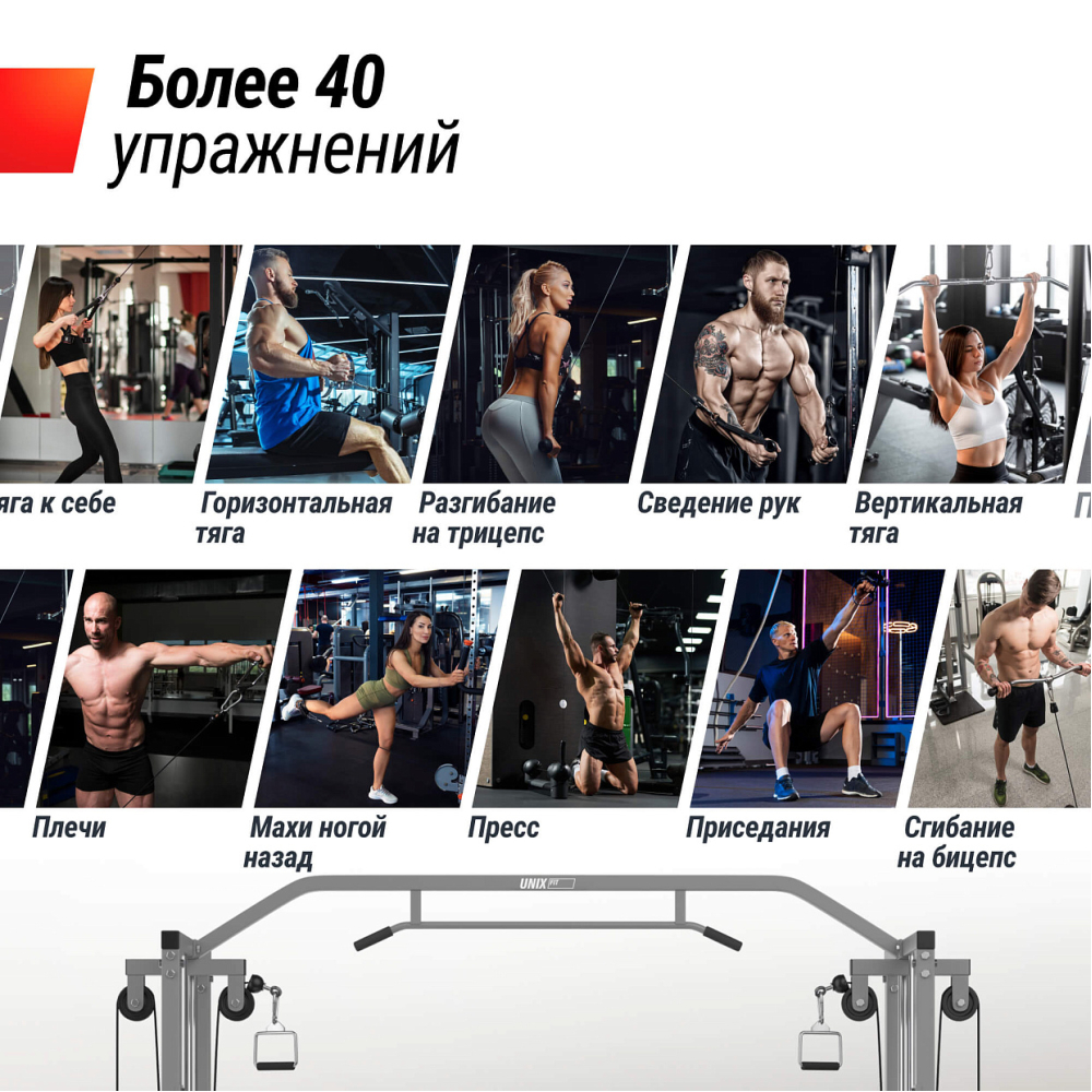 | Упражнения | сведение рук, сгибание и разгибание рук, упражнения для укрепления мышц пресса, приседания с нижнего грузоблока, махи ногами, опускание прямых рук с верхнего блока стоя, разгибание рук, подтягивания, скрестные отведения |