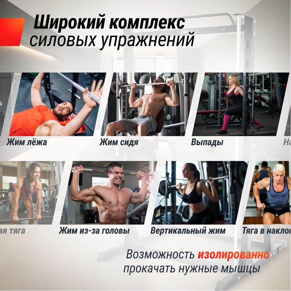 Машина Смита UNIX Fit SMITH STRENGHT 180 обеспечит вам эффективные и безопасные тренировки. Один тренажер заменяет целый комплекс снарядов со свободными весами, благодаря чему вы сможете создать собственный спортивный зал, не выходя из дома. Машина Смита является универсальным спортивным тренажером, предназначенным для выполнения силовых упражнений со штангой на все основные группы мышц, такие как грудные, спинные, плечевые, мышцы ног и трицепсы. Вы сможете выполнять разнообразные упражнения, включая жим лежа, приседания, становую тягу, упражнения для кора, жим узким хватом и многие другие.. Тренировки на данном силовом комплексе устраняют риск нарушения траектории движения штанги, что защищает спортсмена от травм и обеспечивает максимально эффективное воздействие на мышцы. Высоту штанги можно менять в восьми положениях, адаптируя тренажер под рост спортсмена. Общая нагрузка на гриф составляет 200 кг, что позволяет разнообразить тренировки, увеличивая веса и меняя уровень сложности. Вес грифа 20 кг.. . Благодаря компактным размерам тренажера 115 х 122,5 х 210 см и небольшому весу в 72 кг вы разместите его без труда в небольшом помещении. Дополнительную устойчивость силовой раме придает перекладина, которая делает конструкцию надежной и безопасной. Тренажер выполнен из усиленного стального профиля 60 х 60 толщиной 2 мм и не требует креплений к поверхности. Для защиты пола используются специальные накладки на ножках. Все детали конструкции продуманы до мелочей, например, гайки М10 снабжены стопорным механизмом и оцинкованы наряду с болтами.. . Страховочные ограничители хода способны удерживать гриф длиной 195 см на заданной высоте, защищая от падения, что способствует повышению уровня комфорта и уверенности во время тренировок. Крюки-ловушки из металла толщиной 8 мм используются для фиксации штанги в случае необходимости, давая возможность заниматься без напарника. Для фиксации дисков на грифе в комплект входит 2 замка-пружины.. . Силовая рама представляет собой многофункциональный комплекс, оснащенный турником диаметром длиной 65 см и диаметром 25 мм способным выдержать нагрузку до 200 кг.. Для увеличения функциональности можно приобрести скамью для жима UNIX Fit BSBNH120. . . Машина Смита UNIX Fit SMITH STRENGHT 180 – отличный выбор для всех, кто хочет оставаться физически активным и стремиться приобрести идеальную подтянутую фигуру, не выходя из дома!. Мы уверены, спортивный тренажер станет для вас надежным спутником в фитнес-целях!. . Тренируйтесь вместе с UNIX FIT!.