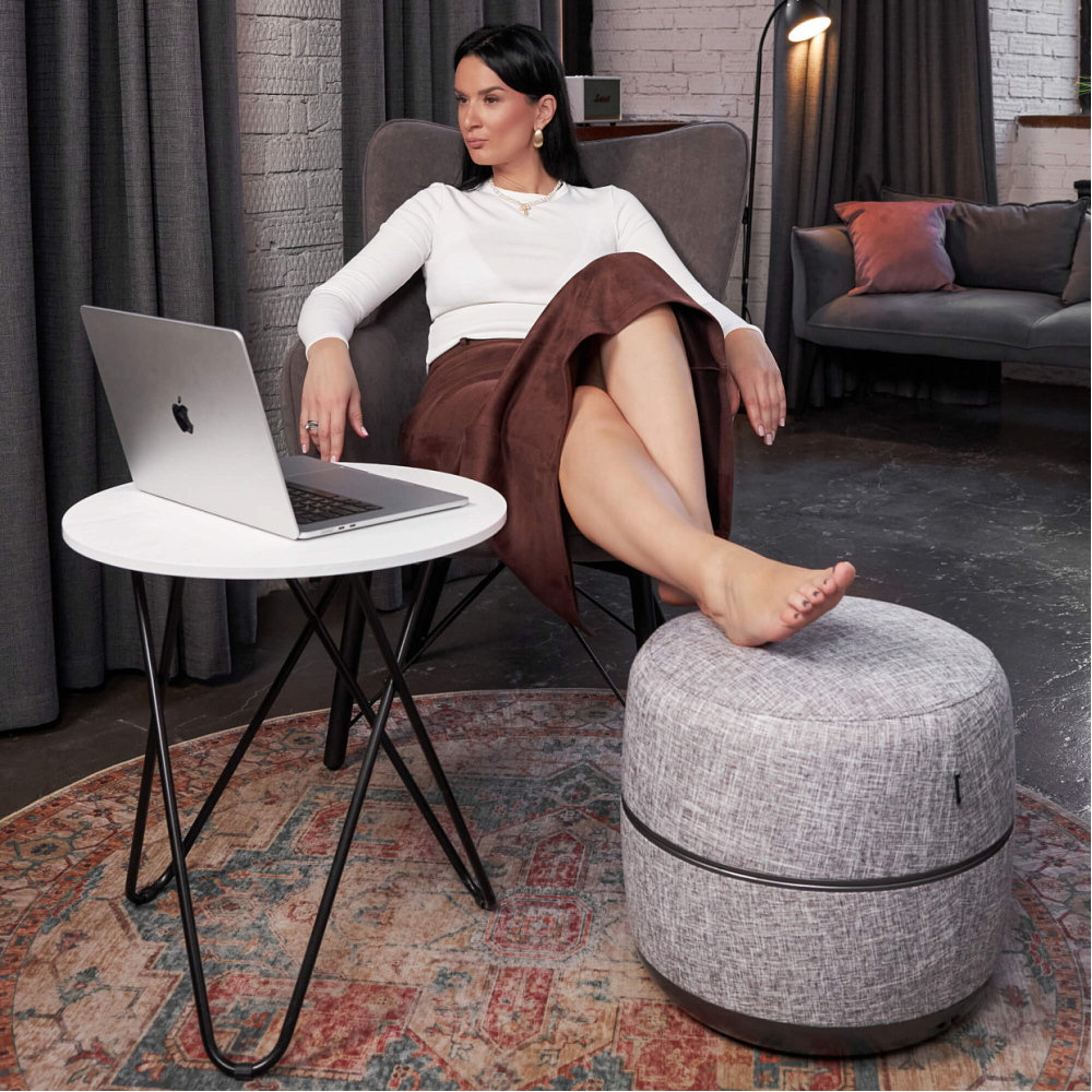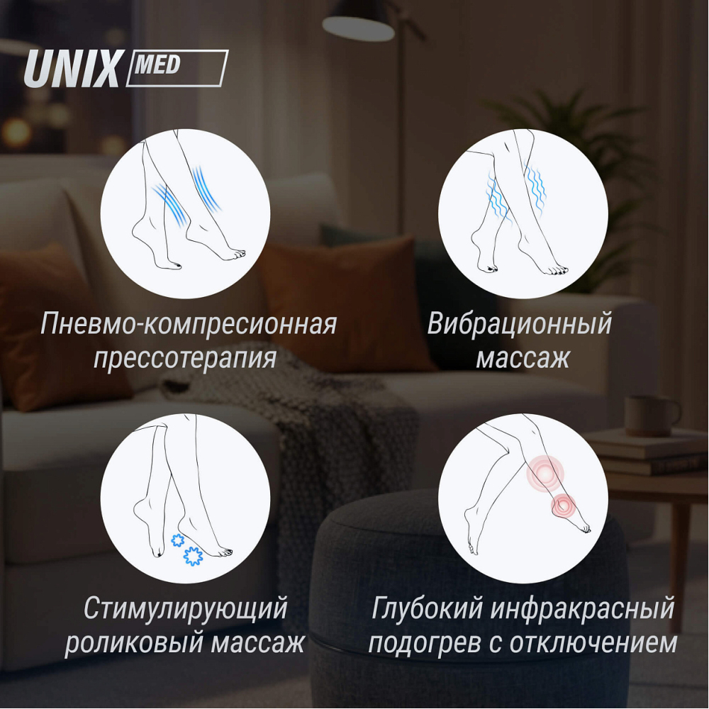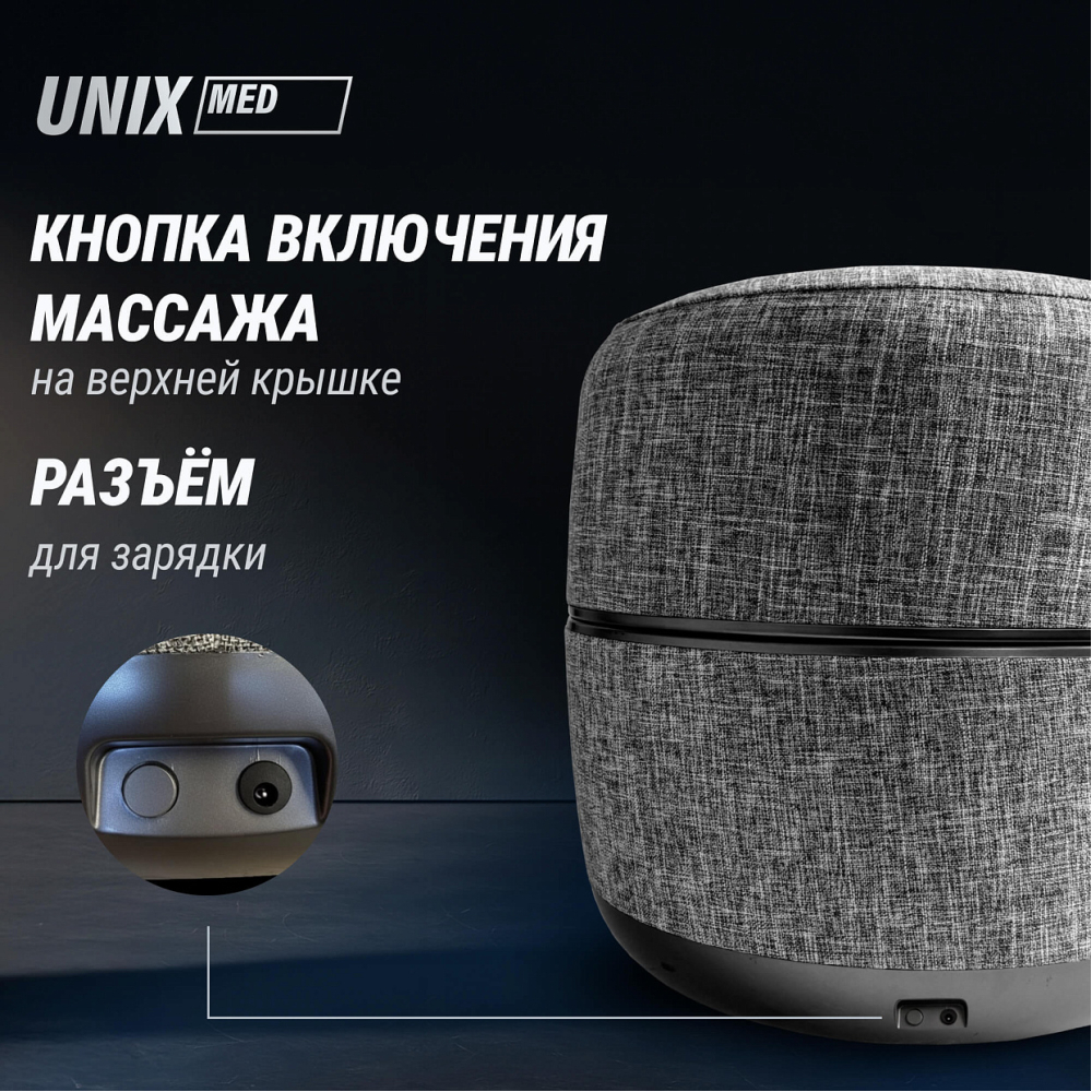 Массажер для ног UNIX Secret Pouf Grey поможет избавиться от усталости ног и восстановить силы, вернуть себе легкость и комфорт. Массажер выполнен с учетом анатомии стопы, что обеспечивает максимальный комфорт во время использования. Система роликов и воздушных подушек прорабатывает каждую мышцу, снимая напряжение и улучшая кровообращение. Вы сможете выбрать между различными режимами массажа – вибрационный массаж воздушным роликом, массаж воздушным роликом, вибрационный массаж. Возможность выбора интенсивности позволяет настроить массажер под индивидуальные потребности. Верхняя часть массажера имеет встроенную функцию вибромассажа с легким подогревом, используя которую, можно избавиться от тяжести в пояснице и расслабиться, а также провести массаж икр, просто положив ноги сверху. Интуитивно понятная панель управления позволит вам легко настроить все параметры. Всего одно нажатие кнопки — и вы погружаетесь в мир расслабления. Компактные размеры устройства позволяют легко разместить массажер пуфик в любом уголке вашего дома, а стильный дизайн гармонично впишется в любой интерьер. Массажер для ног и стоп предлагает различные программы и уровни интенсивности, что позволяет вам настроить массаж под свои предпочтения. Неважно, хотите ли вы легкий расслабляющий массаж или более глубокую проработку — наш массажер удовлетворит все ваши запросы. А возможность подогрева подарит дополнительный комфорт во время массажа. Сеансы массажа с UNIX Med Secret Pouf способствуют ускорению процесса восстановления после растяжений и травм, а также предупреждает возникновение варикозного расширения вен нижних конечностей. Регулярное использование электрического массажера для ног приносит множество преимуществ для здоровья. Он помогает улучшить кровообращение, уменьшить отёки, снять усталость и напряжение, а также способствует общему расслаблению. Для массажа можно также использовать верхнюю крышку, не снимая ее. Роликовый массажер подходит для всех возрастов и уровней активности. Будь то пожилые люди, спортсмены или просто те, кто проводит много времени на ногах, высоких каблуках — каждый найдет в нём верного помощника. Это отличный способ позаботиться о своих близких! . Массажер имеет три программы, три уровня интенсивности и удобную панель управления для комфортного использования. Программа №1 с зеленым цветовым индикатором сочетает вибрационный, роликовый массаж с прессотерапией. Режим подогрева можно включать по желанию. Программа №2 с желтым индикатором использует только пневмо-компрессионное воздействие. Режим подогрева можно включать по желанию. Программа №3 комбинирует воздействие роликами и вибрацией. Во всех программах есть возможность установить комфортный уровень интенсивности: низкий, средний или высокий. Для этих целей на панели управления предусмотрена кнопка с цветовыми индикаторами. . Работа с массажером: Перед началом массажа необходимо зарядить аккумулятор не менее 3 часов. Во время зарядки можно пользоваться всеми функциями прибора. Поставьте ноги в массажные отсеки, включите аппарат и установите программу. Отрегулируйте подходящую интенсивность воздействия и при желании включите прогрев. Наслаждайтесь массажем, прибор выключится автоматически через 10 минут. Рекомендуется использовать данное изделие не 