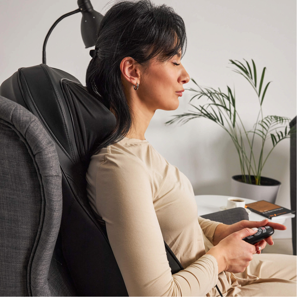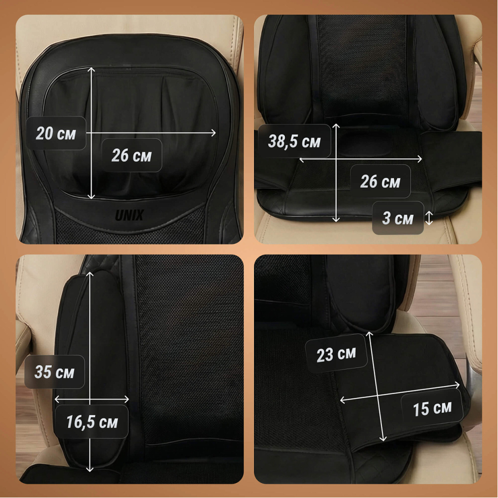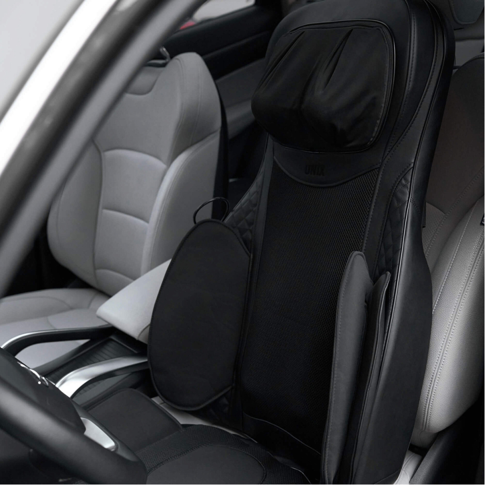 Массажная накидка UNIX Elite 3D Care Black представляет собой инновационное решение для комплексного массажа тела, идеально подходящее для домашнего использования и в автомобиле. Этот массажер для тела обеспечивает глубокий расслабляющий 3D эффект и восстановление мышц благодаря продуманному сочетанию механических воздействий, воздушно-компрессионного массажа и инфракрасного прогрева. Основной особенностью является наличие 12-ти высококачественных массажных роликов, каждый из которых разработан специально для определенных зон тела, имитирующих эффект ручного массажа. 8 вращающихся массажных роликов двигаются по трем осям: вверх-вниз, в стороны и вперед-назад делая процедуру максимально похожей на работу профессионального массажиста и обеспечивая тщательную проработку спины и поясничного отдела, устраняя усталость и восстанавливая мышечный тонус. Техника 3D эффективнее прорабатываются труднодоступные участки спины, плеч, поясницы, помогая снять мышечные зажимы и нормализуя кровоток. 4 вращающихся массажных ролика в области шеи одновременно прорабатывают левую и правую стороны шеи помогая снять напряжение, расслабить мышцы и избавиться от головной боли. Смена направления вращения роликов идеальна для более равномерного массажа. Особое внимание в электро массажере уделено применению воздушно-компрессионного массажа в области ягодиц для уменьшения объёмов в области бёдер и улучшения формы ягодиц без лишних усилий. Воздушно-компрессионный массаж ягодиц — эффективная технология, которая мягко и безопасно воздействует на проблемные участки, помогая добиться подтянутого силуэта. Воздушно-компрессионный массаж ягодиц помогает от отёков и онемения, снимает ощущение тяжести, усталости и дискомфорта в ногах и ягодицах. Воздушно-компрессионный массаж подходит для регулярного применения дома, не вызывает болезненных ощущений и идеально сочетается с другими уходовыми процедурами. Дополнительные виброподушки мягко стимулируют ягодицы, поддерживая тонус и способствуя общему релаксу организма. Предусмотрено 3 варианта интенсивности: низкая, средняя, высокая. Одним из ключевых преимуществ модели является наличие инфракрасного прогрева, позволяющего поддерживать температуру до 42°C. Это усиливает терапевтический эффект, улучшает циркуляцию крови и способствует глубокому восстановлению тканей. Электромассажер имеет режимы автоматического отключения, который защищает от перегрева. Максимальная продолжительность каждого типа массажа составляет 20 минут позволяет достичь оптимального результата без риска переутомления или дискомфорта. Размер электро массажера, подходящий пользователям до 190 см обеспечит удобный доступ ко всему телу практически каждому человеку. Накидку можно компактно сложить и убрать на хранение в шкаф или сухое место. Массажная накидка легко настраиваются под разный рост пользователя. Такая функция обеспечивает индивидуальный подход к массажу и гарантирует максимальную эффективность процедуры для каждого члена семьи. Регулируемые ролики позволяют изменять положение и высоту массажных элементов, чтобы точно попадать на нужные зоны спины и шеи вне зависимости от возраста и телосложения человека. Точная настройка гарантирует глубокую проработку мышц, снятие напряжения и максимальное рассл