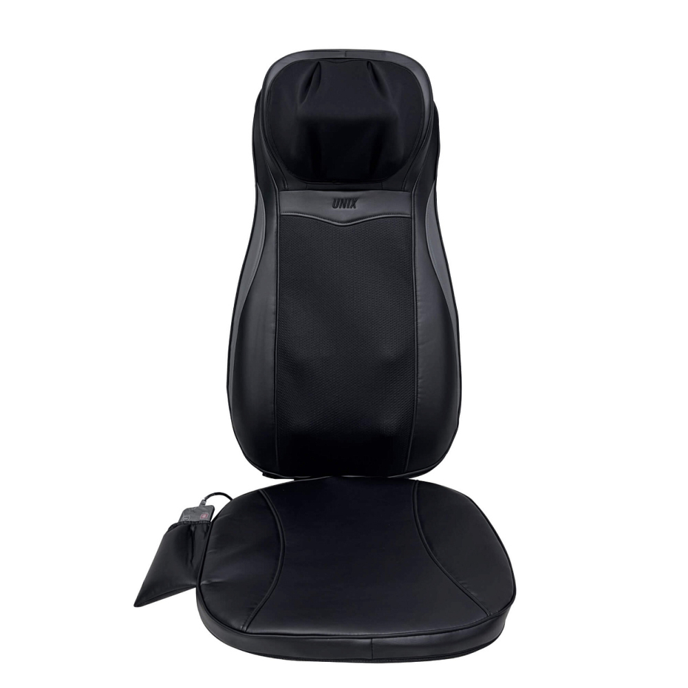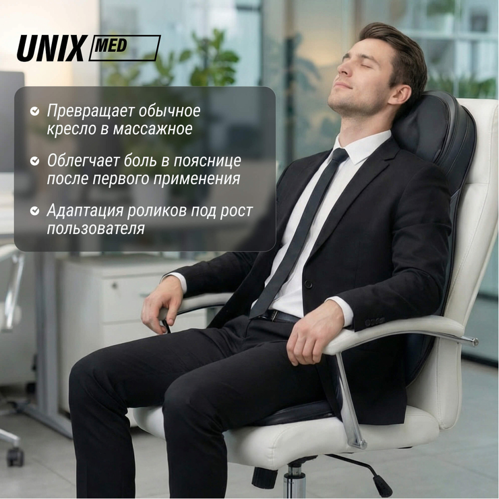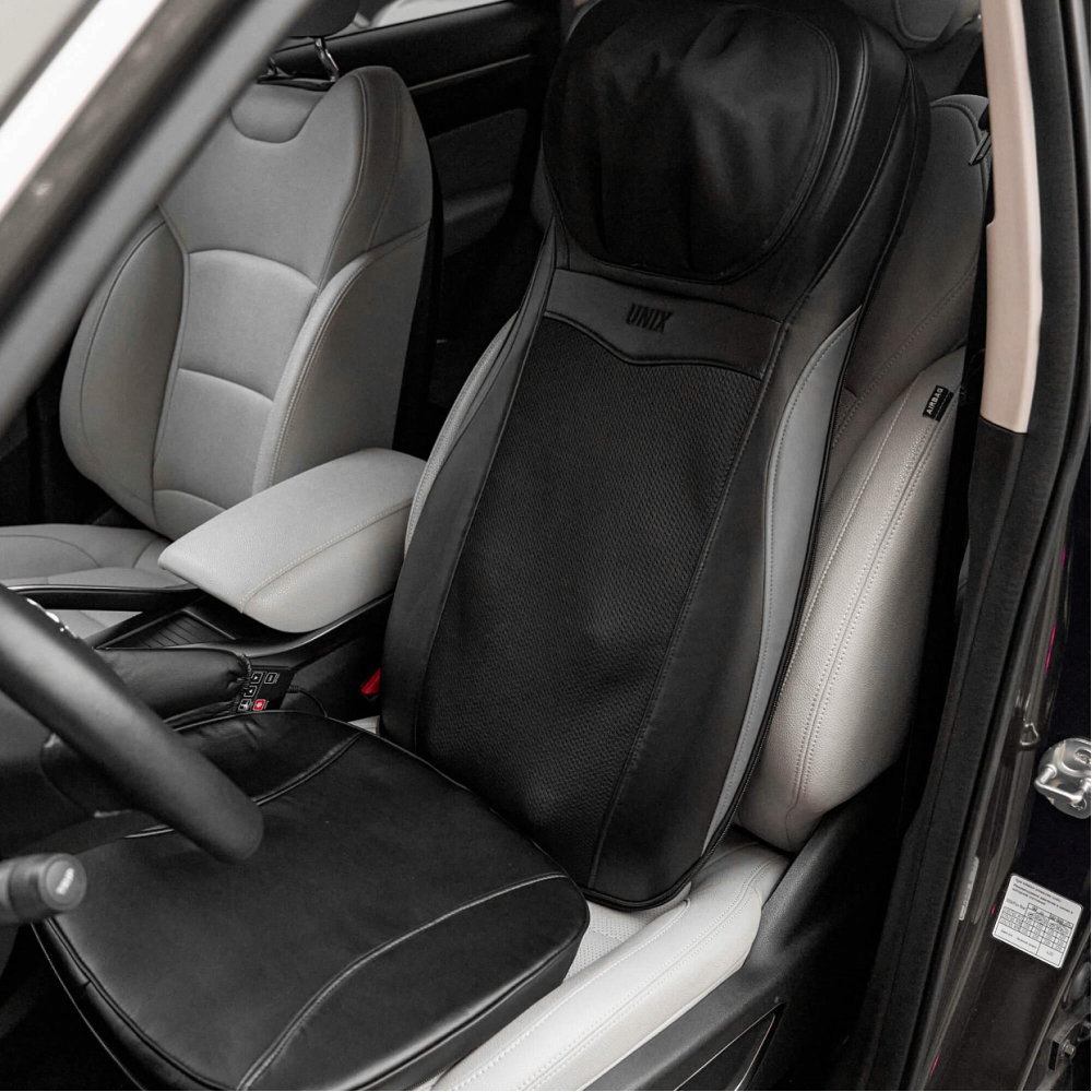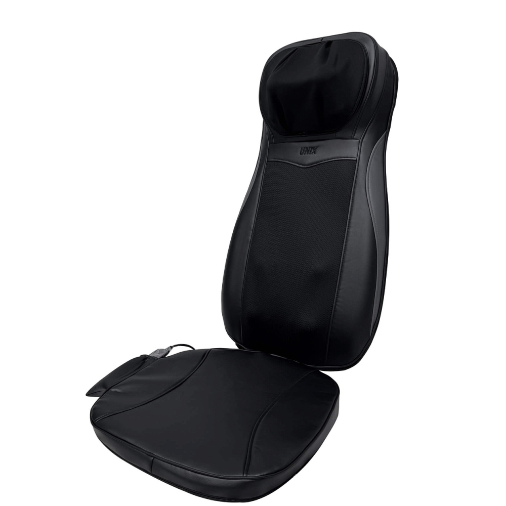 Полное расслабление и восстановление сил всего лишь одним нажатием кнопки. Именно такую возможность дарит массажная накидка с прогревом UNIX Flex Relax Black. Этот массажер для тела обеспечит глубокий и эффективный массаж тела дома и в автомобиле. . . Unix Flex Relax Black оснащена 12-ю встроенными массажными роликами: 4 ролика воздействуют на область шеи, улучшая кровообращение и снимая напряжение, 8 вращающихся роликов разного размера массируют спину и поясницу, глубоко проходя по мышцам и устраняя усталость. Смена направления вращения роликов идеальна для более равномерного массажа. Дополнительные виброподушки мягко стимулируют ягодицы, поддерживая тонус и способствуя общему релаксу организма. Предусмотрено 3 варианта интенсивности: низкая, средняя, высокая. . Массажная накидка легко настраиваются под разный рост пользователя. Такая функция обеспечивает индивидуальный подход к массажу и гарантирует максимальную эффективность процедуры для каждого члена семьи. Регулируемые ролики позволяют изменять положение и высоту массажных элементов, чтобы точно попадать на нужные зоны спины и шеи вне зависимости от возраста и телосложения человека. Точная настройка гарантирует глубокую проработку мышц, снятие напряжения и максимальное расслабление без дискомфорта.. . Одним из ключевых преимуществ модели является наличие инфракрасного прогрева, позволяющего поддерживать температуру до 42°C. Это усиливает терапевтический эффект, улучшает циркуляцию крови и способствует глубокому восстановлению тканей. Электромассажер имеет режимы автоматического отключения, который защищает от перегрева. . . Накладка выполнена из высококачественных материалов: поверхность выполнена из приятной на ощупь искусственной кожей, дополненной дышащими тканевыми вставками, обеспечивающими оптимальные условия для комфортного массажа. Специальный съемный чехол на молнии в зоне шеи упрощает уход и гигиеничность изделия. . . Управление массажером для шеи и спины осуществляется с помощью удобного проводного 77 см пульта дистанционного управления, расположенного в специальном кармашке. Настройка нужного режима производится легко и быстро из широкого спектра вариантов: разминающий массаж шеи, полный массаж спины, массаж верхней и нижней части спины, точечный массаж проблемных зон.. . Благодаря возможности подключения как к бытовой электросети, так и автомобильному прикуривателю, электрический массажер идеально подходит для ежедневного использования в любом месте, дома или длительное путешествие на авто. Экономичный расход энергии (всего 48 Вт) обеспечивает энергоэффективность и экономичность. Предусмотрен индикатор режима работы для удобства пользователя. Адаптер для автомобиля длиной 140 см и сетевой кабель длиной 145 см в комплекте.. . Максимальная продолжительность каждого типа массажа составляет 20 минут позволяет достичь оптимального результата без риска переутомления или дискомфорта. Размер электро массажера, подходящий пользователям до 190 см обеспечит удобный доступ ко всему телу практически каждому человеку. Накидку можно компактно сложить и убрать на хранение в шкаф или сухое место.. . Массажная накидка UNIX Flex Relax Black — это идеальное решение для поддержания здоровья позвоночника, снятия стресса и усталости после рабочего дня. Массажер в машину на сиде