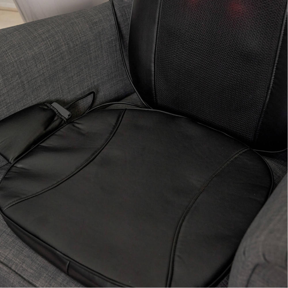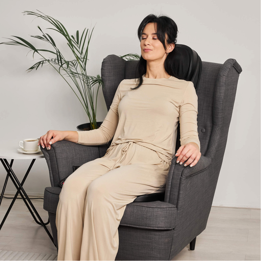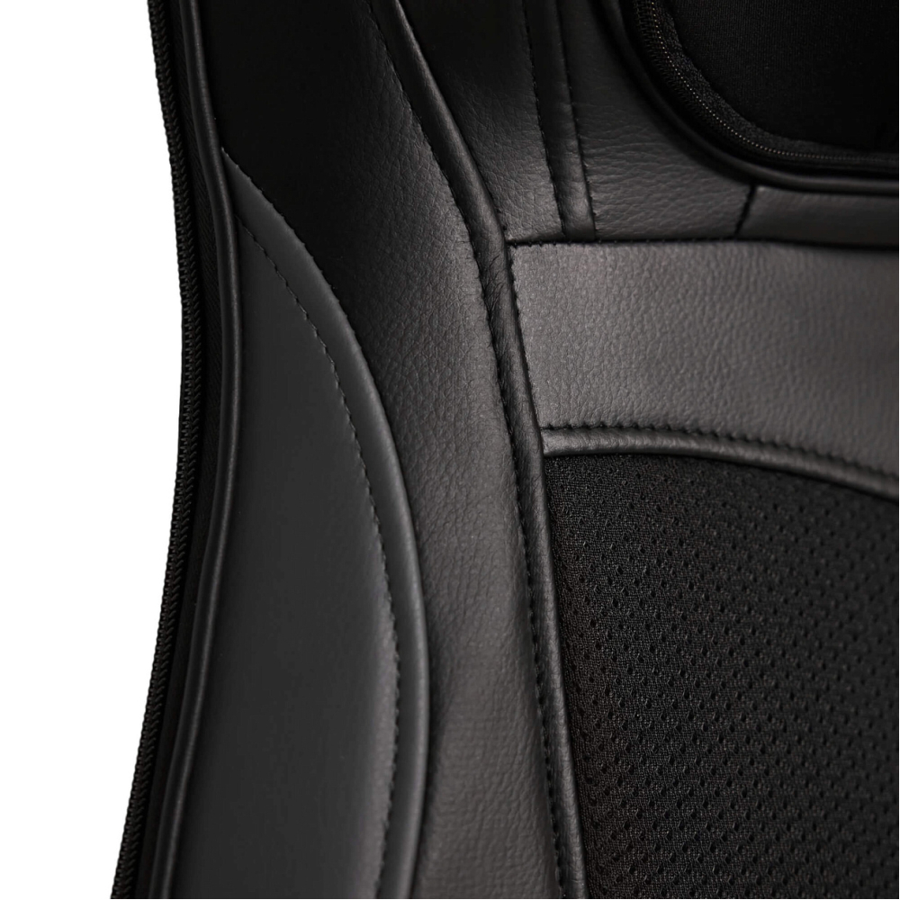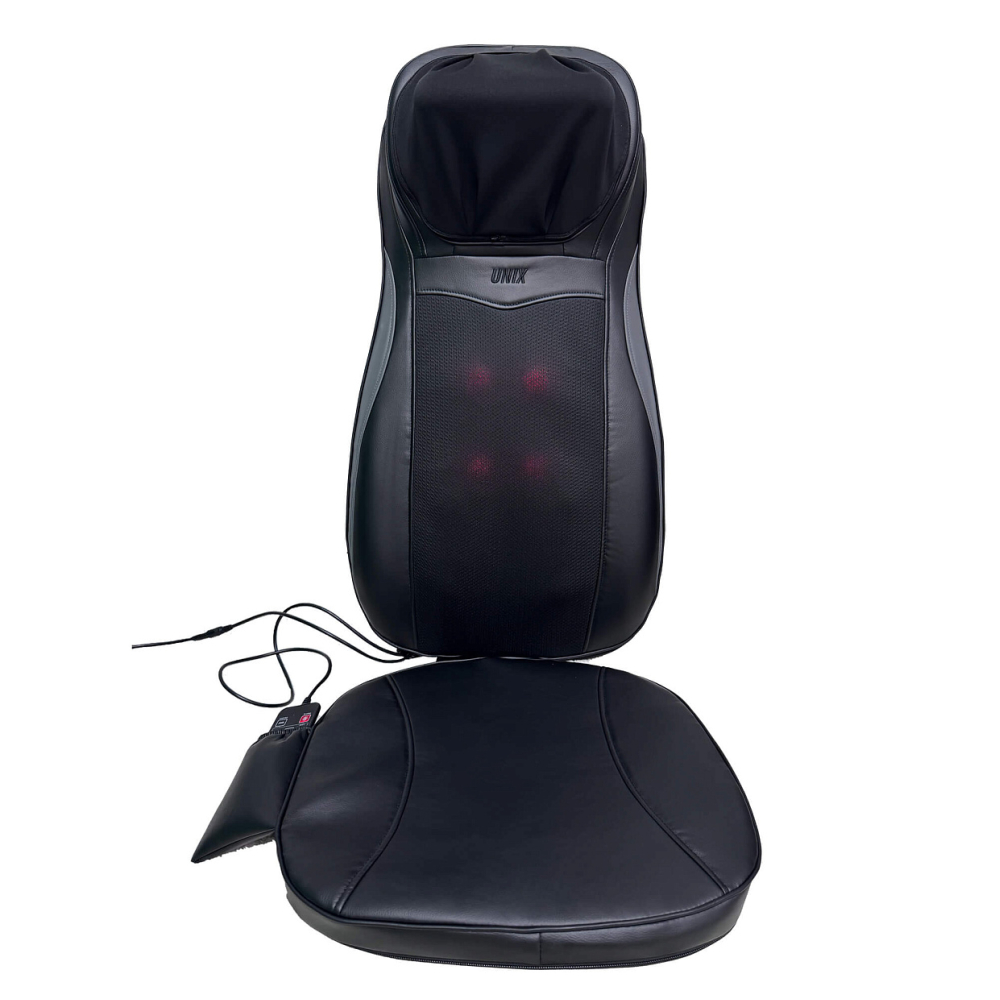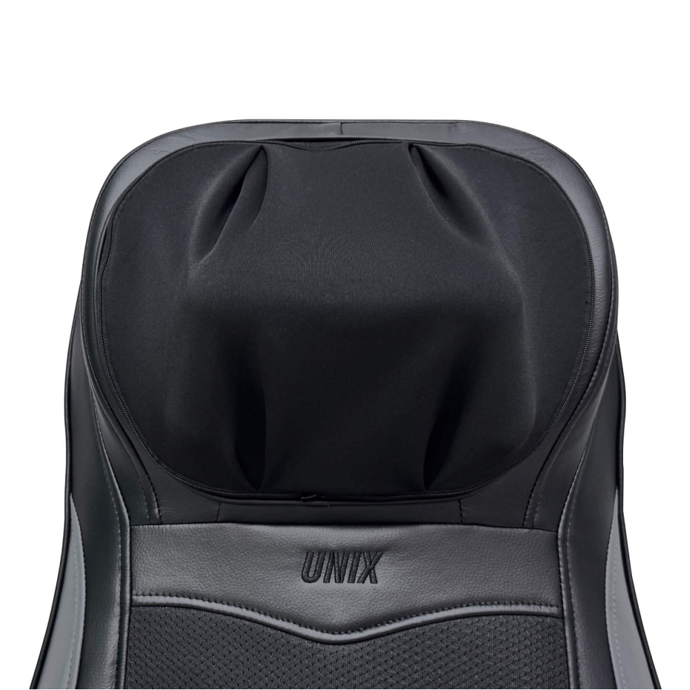 Полное расслабление и восстановление сил всего лишь одним нажатием кнопки. Именно такую возможность дарит массажная накидка с прогревом UNIX Flex Relax Black. Этот массажер для тела обеспечит глубокий и эффективный массаж тела дома и в автомобиле. . . Unix Flex Relax Black оснащена 12-ю встроенными массажными роликами: 4 ролика воздействуют на область шеи, улучшая кровообращение и снимая напряжение, 8 вращающихся роликов разного размера массируют спину и поясницу, глубоко проходя по мышцам и устраняя усталость. Смена направления вращения роликов идеальна для более равномерного массажа. Дополнительные виброподушки мягко стимулируют ягодицы, поддерживая тонус и способствуя общему релаксу организма. Предусмотрено 3 варианта интенсивности: низкая, средняя, высокая. . Массажная накидка легко настраиваются под разный рост пользователя. Такая функция обеспечивает индивидуальный подход к массажу и гарантирует максимальную эффективность процедуры для каждого члена семьи. Регулируемые ролики позволяют изменять положение и высоту массажных элементов, чтобы точно попадать на нужные зоны спины и шеи вне зависимости от возраста и телосложения человека. Точная настройка гарантирует глубокую проработку мышц, снятие напряжения и максимальное расслабление без дискомфорта.. . Одним из ключевых преимуществ модели является наличие инфракрасного прогрева, позволяющего поддерживать температуру до 42°C. Это усиливает терапевтический эффект, улучшает циркуляцию крови и способствует глубокому восстановлению тканей. Электромассажер имеет режимы автоматического отключения, который защищает от перегрева. . . Накладка выполнена из высококачественных материалов: поверхность выполнена из приятной на ощупь искусственной кожей, дополненной дышащими тканевыми вставками, обеспечивающими оптимальные условия для комфортного массажа. Специальный съемный чехол на молнии в зоне шеи упрощает уход и гигиеничность изделия. . . Управление массажером для шеи и спины осуществляется с помощью удобного проводного 77 см пульта дистанционного управления, расположенного в специальном кармашке. Настройка нужного режима производится легко и быстро из широкого спектра вариантов: разминающий массаж шеи, полный массаж спины, массаж верхней и нижней части спины, точечный массаж проблемных зон.. . Благодаря возможности подключения как к бытовой электросети, так и автомобильному прикуривателю, электрический массажер идеально подходит для ежедневного использования в любом месте, дома или длительное путешествие на авто. Экономичный расход энергии (всего 48 Вт) обеспечивает энергоэффективность и экономичность. Предусмотрен индикатор режима работы для удобства пользователя. Адаптер для автомобиля длиной 140 см и сетевой кабель длиной 145 см в комплекте.. . Максимальная продолжительность каждого типа массажа составляет 20 минут позволяет достичь оптимального результата без риска переутомления или дискомфорта. Размер электро массажера, подходящий пользователям до 190 см обеспечит удобный доступ ко всему телу практически каждому человеку. Накидку можно компактно сложить и убрать на хранение в шкаф или сухое место.. . Массажная накидка UNIX Flex Relax Black — это идеальное решение для поддержания здоровья позвоночника, снятия стресса и усталости после рабочего дня. Массажер в машину на сиде