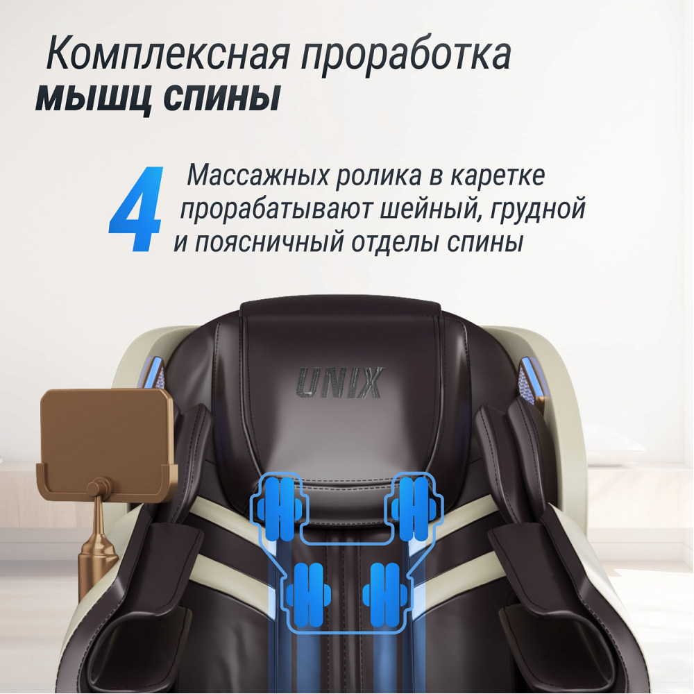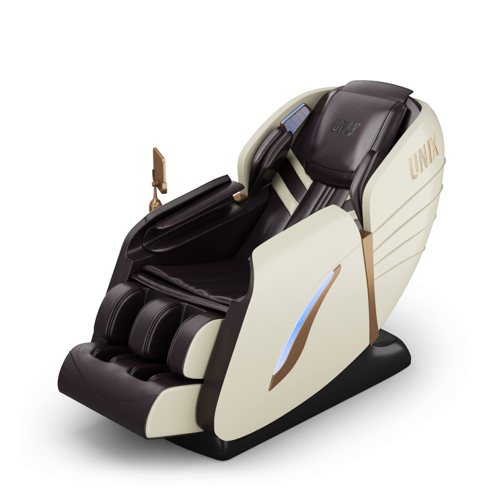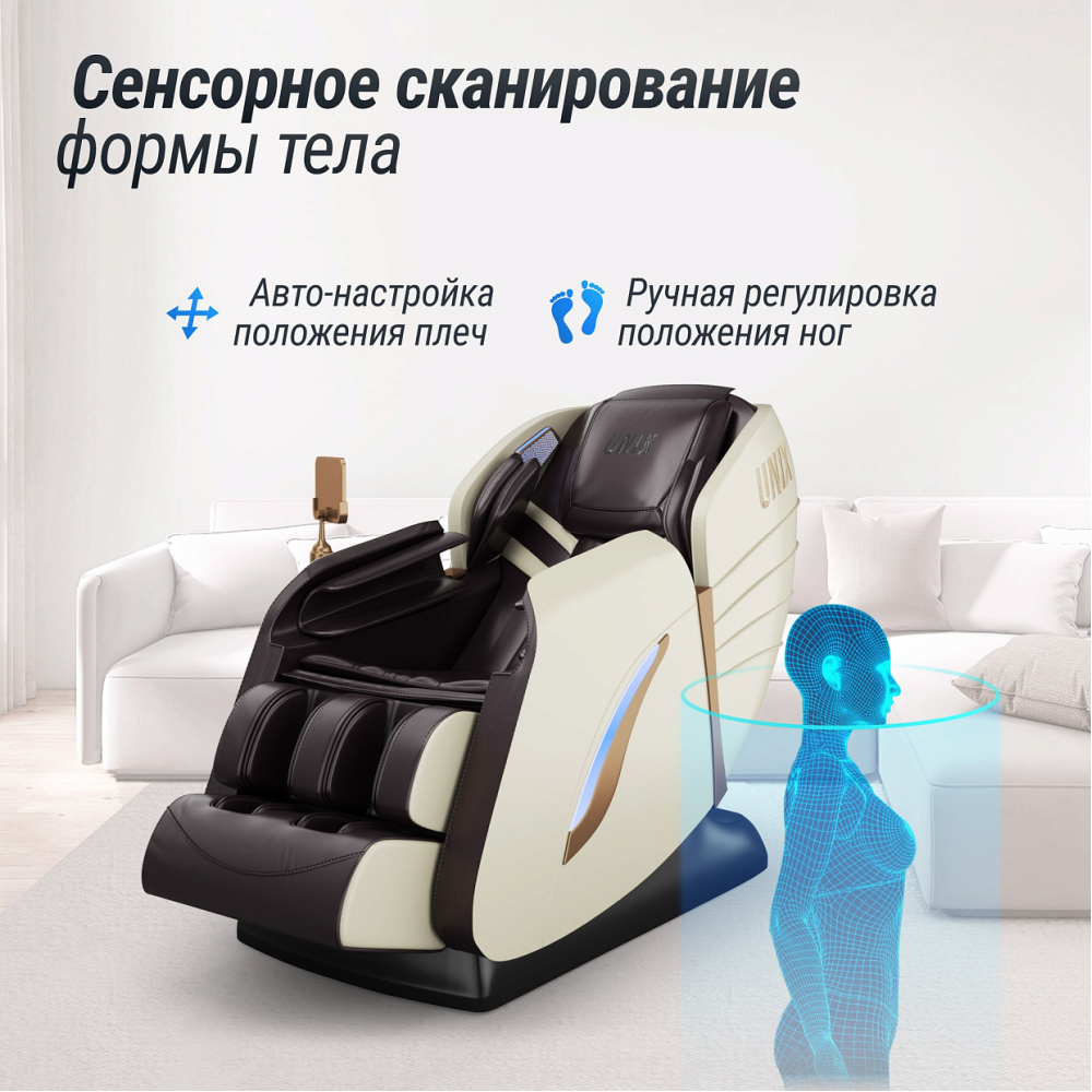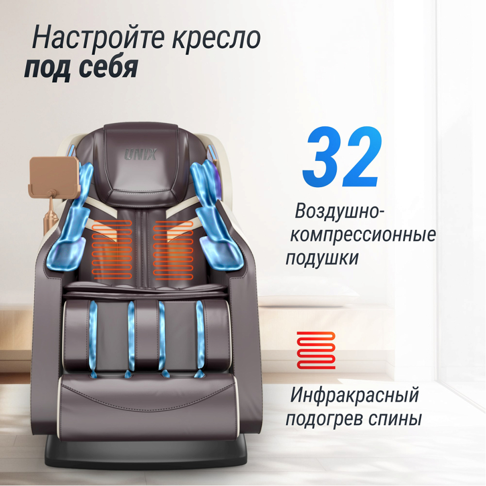 Погрузитесь в мир абсолютного комфорта и релаксации с новым массажным креслом UNIX Adora, которое станет вашим личным оазисом спокойствия в домашних условиях! Это кресло — не просто предмет мебели, а настоящий помощник в борьбе со стрессом и усталостью.. . Инновационная система предлагает возможность автоматической настройки положения тела, а также обнаружения изгибов тела и массажных точек, что делает массаж более естественным и точным. Встроенные автоматические программы разработаны с максимальной эффективностью для конкретных целей – Мастер-массаж, Массаж для королевы, Массаж для плеч, Забота о спине и Спокойный сон. Передовой манипулятор предлагает на выбор несколько ручных режимов – массаж фиксированной точки, верхней части спины, нижней части спины, локальный и полный массаж. Дополнительно вы можете выбрать определенную массажную технику для разных зон – разминание, постукивание, растирание, акупрессура и многие другие. Электрическое массажное кресло оснащено функцией аэромассажа с выбором зон и уровнем интенсивности давления воздуха. Воздушные массажеры для ладоней оснащены функциями ударного массажа. Кресло для массажа включает в себя роликовый массажер для ног, который массирует пальцы, ступни, а также своды ступней. А функция подогрева спины подарит дополнительный комфорт во время сеанса. . Преимущества. . - 2D массаж. Благодаря точечной проработка мышц достигается максимальное расслабление и релакс. Движение роликов соответствует изгибам тела, что позволяет охватить большую часть поверхность рук, голеней, ног, плеч и избавиться от боли в мышцах ног и плеч. . . - Аэромассаж. Воздушно-компрессионный массаж со встроенными воздушными подушками расположенными по всему креслу оказывают воздействие на все тело человека. Воздушные подушки обеспечивают возможность выполнения легкого расслабляющего массажа, в результате нормализуется кровообращение и артериальное давление, убирается отечность, такой массаж благотворно влияет на лимфатическую систему, сердечно-сосудистую систему, на мышечные ткани. Чередование воздушной компрессии и обычного массажа благотворно сказывается на всех процессах в организме человека. Воздушно-компрессионный массаж рекомендован для коррекции фигуры, восстановления упругости кожи и ее эластичности . - ZERO GRAVITY. Активация ZERO-G автоматически наклоняет конструкцию под определенным углом. Нагрузка распределяется равномерно по телу, возникает ощущение легкости, сравнимое с состоянием невесомости. С этой функцией тело находится в самом комфортном положении, оно максимально расслабленно, а значит, пользы от массажа будет гораздо больше, чем в любом другом положении. В состоянии невесомости нагрузка, действующая на позвоночник, равномерно распределяется по поверхности кресла. Снимаются спазмы в мышцах спины и шеи, улучшается кровообращение, восстанавливаются жизненно важные процессы, улучшается сон. ZERO-G подойдет для релаксации и оздоровления людей, занятых на тяжелых работах, офисных сотрудников, спортсменов, водителей авто, а также людей испытывающих большие нагрузки на работе и дома. Предусмотрена регулировка угла наклона 118° ~ 145° . - Автоматическое сканирование формы тела. Массажное кресло оснащено специальными сенсорными датчиками, которые могут выполнять сканирование тела и 