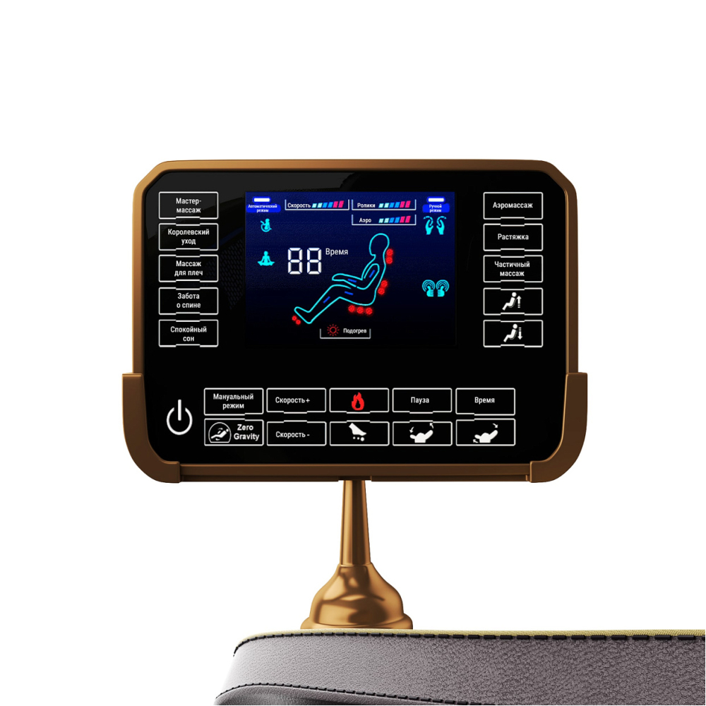 | Регулировки и настройки | регулировка интенсивности: массажа на 3 уровнях, интенсивности давления воздуха на 3 уровня и времени на 3 уровнях; регулировка подъема голеней, подъема спинки, автоматическая регулировка угла наклона кресла в режиме Zero Gravity; подставка для голеней оснащена функцией телескопической регулировки, высота подножки определяется в зависимости от длины ног пользователя |