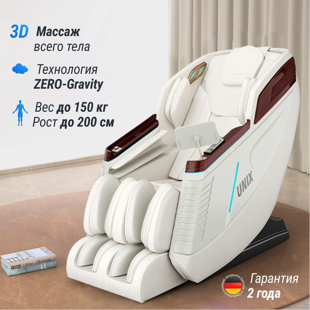 Массажное кресло UNIX Asteria сочетает в себе передовые технологии и максимальный комфорт. Это не просто кресло — это ваш личный спа-салон, который всегда под рукой!. . Массажное кресло предлагает широкий выбор ручных техник массажа: от разминания до шиацу, от растирания до постукивания. Вы сможете легко переключаться между ними в зависимости от вашего настроения и состояния. Хотите расслабляющий массаж после тяжелого дня? Или же активизирующий массаж для восстановления сил? Все это доступно одним нажатием кнопки или голосовой командой!. . . Преимущества. . - 3D массаж. Благодаря точечной проработка мышц достигается максимальное расслабление и релакс. Движение роликов соответствует изгибам тела, что позволяет охватить большую часть поверхность рук, голеней, ног, плеч и избавиться от боли в мышцах ног и плеч . - ZERO GRAVITY. Активация ZERO-G автоматически наклоняет конструкцию под углом 40 градусов. Нагрузка распределяется равномерно по телу, возникает ощущение легкости, сравнимое с состоянием невесомости. С этой функцией тело находится в самом комфортном положении, оно максимально расслабленно, а значит, пользы от массажа будет гораздо больше, чем в любом другом положении. В состоянии невесомости нагрузка, действующая на позвоночник, равномерно распределяется по поверхности кресла. Снимаются спазмы в мышцах спины и шеи, улучшается кровообращение, восстанавливаются жизненно важные процессы, улучшается сон. ZERO-G подойдет для релаксации и оздоровления людей, занятых на тяжелых работах, офисных сотрудников, спортсменов, водителей авто, а также людей испытывающих большие нагрузки на работе и дома . - Аэромассаж. Воздушно-компрессионный массаж со встроенными воздушными подушками расположенными по всему креслу оказывают воздействие на все тело человека. Воздушные подушки обеспечивают возможность выполнения легкого расслабляющего массажа, в результате нормализуется кровообращение и артериальное давление, убирается отечность, такой массаж благотворно влияет на лимфатическую систему, сердечно-сосудистую систему, на мышечные ткани. Чередование воздушной компрессии и обычного массажа благотворно сказывается на всех процессах в организме человека. Воздушно-компрессионный массаж рекомендован для коррекции фигуры, восстановления упругости кожи и ее эластичности.. . - Автоматическое сканирование формы тела. Массажное кресло оснащено специальными сенсорными датчиками, которые могут выполнять сканирование тела и создавать в памяти компьютера вашу объемную модель и на их основе составляется уникальная и оптимальная для вас программа воздействий. Датчики фиксируют ряд параметров, которые важны для массажа. Определяется структура тела сканируемого человека, его рост, ширина плеч, спины, талии, а также все изгибы. Это позволяет создать полную 3D-модель человека. После всех выполненных вычислений массажное кресло настраивает ширину массажных роликов таким образом, чтобы они попадали на наиболее напряженные участки и правильно прорабатывали их. . . - Возможности. Автоматическое обнаружение и точная настройка положения плеч, изгибов тела и массажных акупунктурных точек, аэромассаж верхней части тела, функция аэромассажа ладоней (4 воздушных массажера), функция аэромассажа рук ((4 воздушных массажера), 3 уровня интенсивности давления воздуха. 