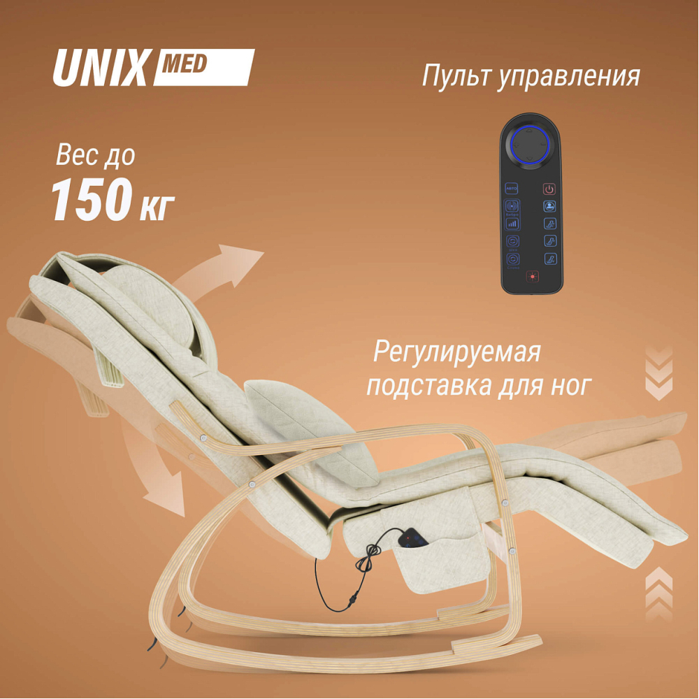 Массажное кресло-качалка UNIX Avola с роликовым массажером и подушкой — идеальное решение для тех, кто стремится к гармонии тела и духа, хочет расслабиться после долгого рабочего дня и восстановить силы. Кресло станет вашим личным оазисом спокойствия и комфорта дома, где каждая деталь продумана для максимального удовольствия. Cовмещает в себе массажное кресло и кресло-качалку Массажное кресло сочетает в себе элегантный и современный дизайн, который легко впишется в любой интерьер. Мягкие линии, высококачественные материалы и стильная отделка создают атмосферу уюта. Кресло не только прекрасно выглядит, но и обеспечивает непревзойденный комфорт благодаря продуманной конструкции и эргономичным формам. Одной из главных особенностей кресла для массажа шеи и спины является интегрированный роликовый массажер с 22 роликами, который включает в себя автоматический режим и вибрационный. Массажное кресло-качалка выполняет роликовый 2D-массаж спины и шейно-плечевой зоны, а также расслабляющий вибромассаж области ягодиц. Вы можете выбрать интенсивность по своему желанию – низкий, средний или высокий уровень вибрационного воздействия. Он точно имитирует движения профессионального массажиста, прорабатывая каждую мышцу вашего тела. Вы можете выбрать зону воздействия, например массаж всей спины, нижней части спины или шеи, а также интенсивность воздействия и направление вращения роликов.. Электрическое массажное кресло помогает снять напряжение, улучшить кровообращение и уменьшить уровень стресса. Благодаря функции качания вы сможете наслаждаться расслабляющим эффектом, который дополнительно усиливает действие массажа. А функция подогрева подарит дополнительный комфорт. Это идеальный способ забыть о повседневных заботах и погрузиться в мир полного релакса. Вибромассаж в зоне ягодиц с 3 уровнями интенсивности. Подушка, входящая в комплект, обеспечивает дополнительный комфорт и поддержку поясницы во время сеансов массажа. Она изготовлена из высококачественных материалов, способствует максимальному расслаблению мышц, позволяя вам наслаждаться каждой минутой отдыха. Съемный чехол поможет легко защитит подушку от влаги и пятен. Это значительно увеличит срок службы подушки, а также облегчит уход за ней. Массажер для шеи и спины оснащен удобным проводным пультом управления с интуитивно понятным интерфейсом, который вы можете положить в кармашек сбоку кресла. Вы сможете легко настроить режим массажа, выбрать нужную интенсивность и силу воздействия. Все это позволит сосредоточиться на своих ощущениях и наслаждаться процессом без лишних усилий. Подставка для ног имеет 5 положений для регулировки, чтобы вы выбрали для себя самое комфортное положение. Регулярное использование массажного кресла способствует улучшению общего состояния здоровья: снижает мышечное напряжение, улучшает качество сна и повышает уровень энергии. Оно идеально подходит для людей, ведущих активный образ жизни, а также для тех, кто много времени проводит за компьютером или испытывает физическую нагрузку. Массажное кресло качалка станет отличным подарком для вас или ваших близких. Подарите себе и своим родным возможность наслаждаться качественным массажем в любое время, не выходя из дома. Это не просто предмет мебели — это инвестиция в здоровье и благо