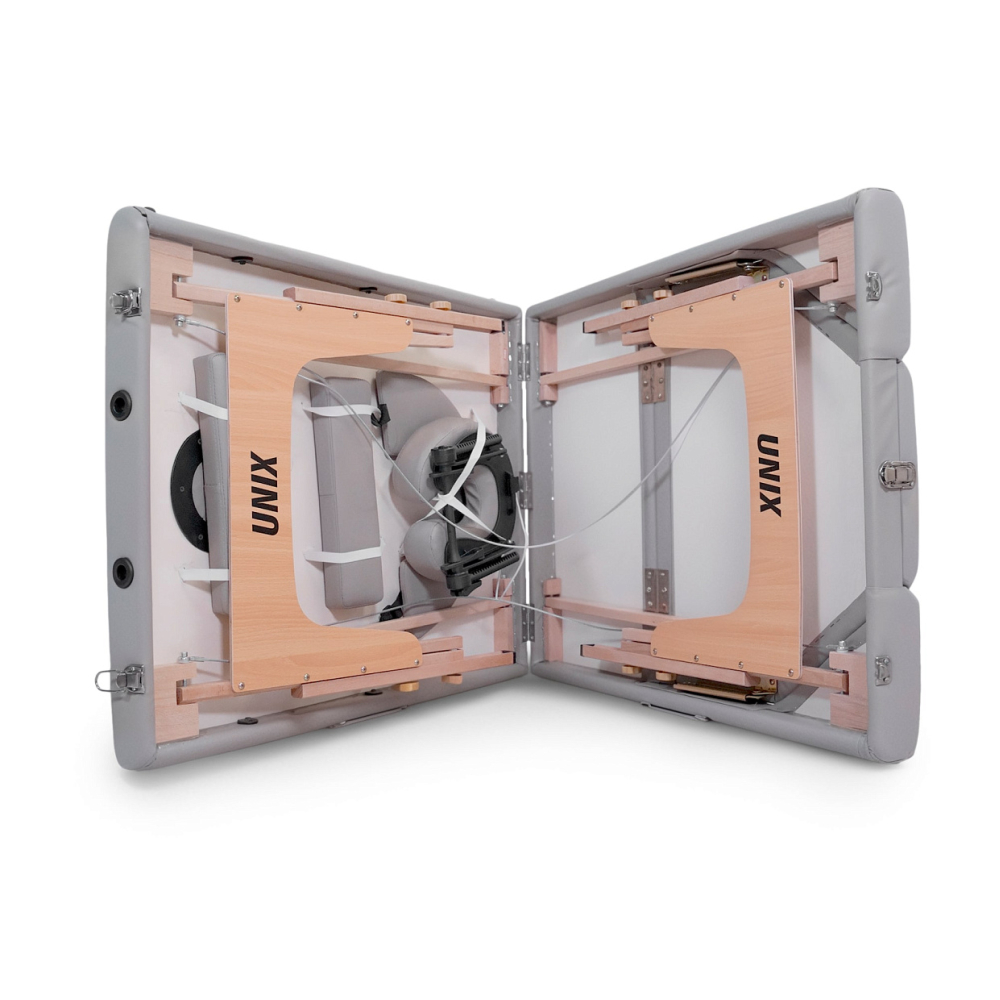 Массажный стол UNIX Serenity 3 Section — истинное воплощение функциональности, комфорта и долговечности. Этот трехсекционный стол для массажа незаменим как в профессиональной деятельности, так и для домашних сеансов. Компактные размеры и удобная система складывания позволяют разместить его в любом помещении, будь то СПА-салон, массажный кабинет, студия тату или даже ваш личный уголок релаксации дома. Стол обеспечивает максимум удобств как специалисту, проводящему процедуру, так и человеку, которому она предназначена. Продуманная конструкция модели обеспечит максимальный комфорт клиенту во время массажа спины, шеи и ног. В спинке есть удобное анатомическое отверстие для лица. . . Деревянная кушетка для массажа выделяется невероятно прочной конструкцией, способной выдержать общую нагрузку до 250 кг (не перегружайте стол сверх рекомендованного предела веса). Благодаря своим компактным размерам он идеально впишется даже в самые небольшие помещения. Возможность ручной регулировки высоты ножек от 61 до 81 см с шагом 3 см позволяет адаптировать стол под рост массажиста, обеспечивая наилучшую результативность сеансов массажа. Ложе толщиной 7 см обеспечит дополнительную поддержку и комфорт. Для еще большего удобства массажного стола в комплекте предусмотрены регулируемый по наклону и высоте подголовник и подставка для гаджетов, расположенная у изголовья, а также боковые подлокотники. . . Конструкция складной кушетки специально разработана таким образом, чтобы ее было удобно складывать. Кушетка для массажа быстро и удобно трансформируется в компактный чемоданчик размерами 90 x 70 x 17 см, который легко перемещать благодаря специальной сумке для транспортировки. Это решение идеально подходит для мобильных мастеров, работающих вне салонов, а также для домашнего использования. В комплекте имеется сумка для хранения в сложенном виде. Сумка защитит стол и аксессуары от царапин и повреждений во время транспортировки.. . Подголовник обладает возможностью регулировки по высоте и наклону, обеспечивая идеальную поддержку головы и шеи. Ножная часть стола поднимается на 50 градусов (7 позиций), что позволяет клиентам занять самое удобное положение для проведения процедуры. Складной стол оборудован удобными подлокотниками 34х10х3,5 см, подвесной полкой для гаджетов 42 х 24 см и лямками с застежками-липучками.. . Основу каркаса и ножек составляют натуральные материалы — древесина твердых пород, покрытая безопасным лаком, что делает кушетку не только надежным, но и экологически безопасным продуктом. Усиленные ножки придают регулируемой кушетке дополнительную устойчивость, а тросы из авиационного алюминия обеспечивают надежность и долговечность. Обивка стола выполнена из высококачественной эко-кожи, устойчивой к воздействию влаги, масел и кремов, что облегчает уход за ним и продлевает срок службы.. . Кушетка UNIX Serenity 3 Section подходит для выполнения множества различных процедур: SPA-процедуры, косметологические услуги, работа в тату – салоне, массажном салоне и салоне красоты. Универсальность стола делает его отличным выбором для самого широкого круга пользователей.. . Уход за столом прост и удобен. Обивку можно ежедневно чистить мягким моющим средством и теплой водой, после чего протирать сухой тряпочкой без ворса. Каркас стола не нуждается в особом уходе.