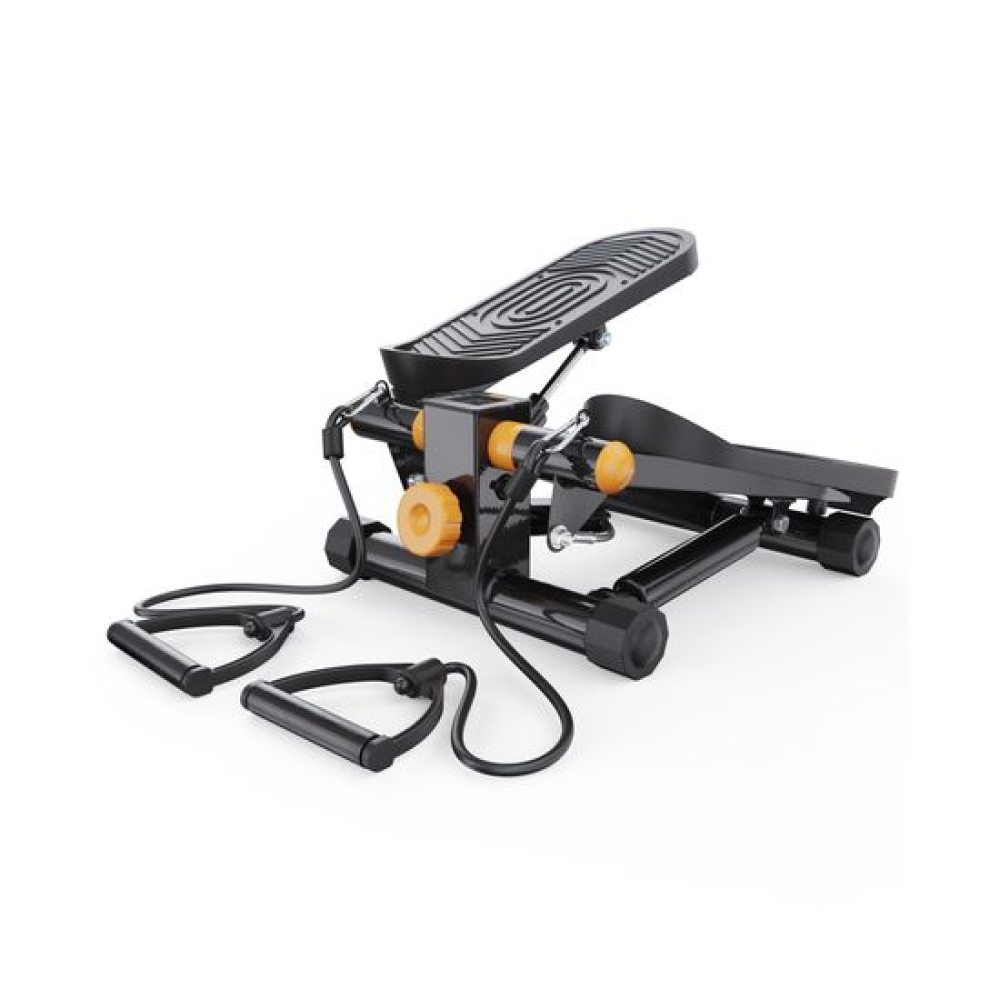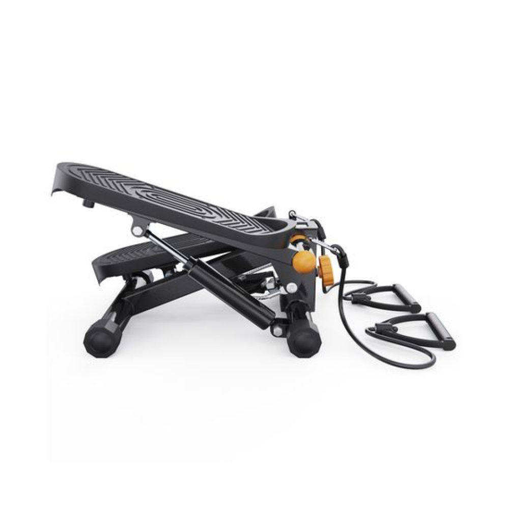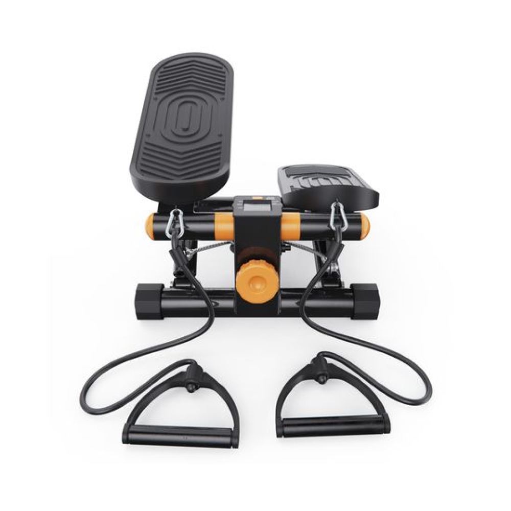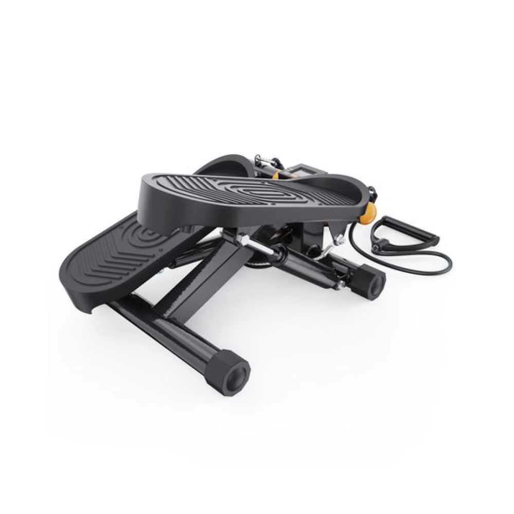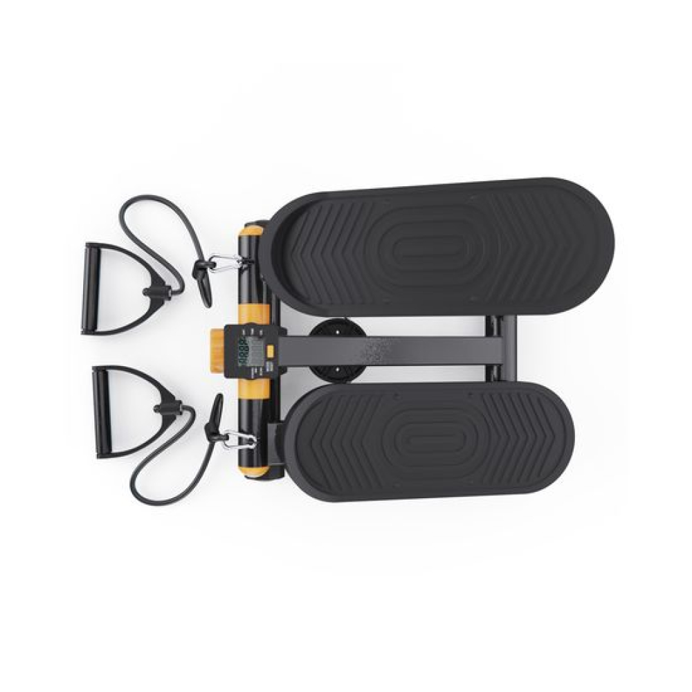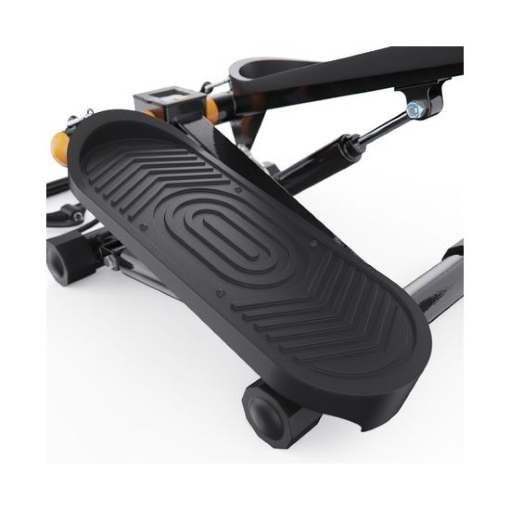 Министеппер с черными эспандерами DFC DAEYEGIM — это компактный и эффективный тренажёр для домашних кардиотренировок, направленных на укрепление мышц ног, ягодиц и нижней части корпуса. Благодаря встроенным эспандерам длиной 89 см, вы также можете задействовать мышцы рук и плечевого пояса, делая тренировку более комплексной.Степпер оснащён гидравлической системой нагрузки, которая обеспечивает плавный и тихий ход педалей. Вы можете механически регулировать уровень нагрузки, подстраивая интенсивность тренировки под свои цели и физическую подготовку. Максимальный вес пользователя — 110 кг, что делает тренажёр универсальным для большинства пользователей.Благодаря компенсаторам неровности пола, степпер стабильно стоит даже на неидеальных поверхностях, а широкие педали размером 10,5 х 30 см с рельефным покрытием обеспечивают уверенное сцепление с обувью и безопасность во время занятий.На монохромном LCD-дисплее отображаются все ключевые параметры: время тренировки, количество шагов, шагов в минуту и сожжённые калории. Это позволяет легко отслеживать прогресс и контролировать эффективность каждого занятия. В комплекте 1 батарейка типа LR44.Компактные размеры в рабочем виде — 41 х 20 х 29,5 см — делают этот тренажёр идеальным выбором для занятий в квартире или офисе. Министеппер DFC DAEYEGIM не требует подключения к сети, легко помещается под кровать или в шкаф и готов к тренировке в любое время.