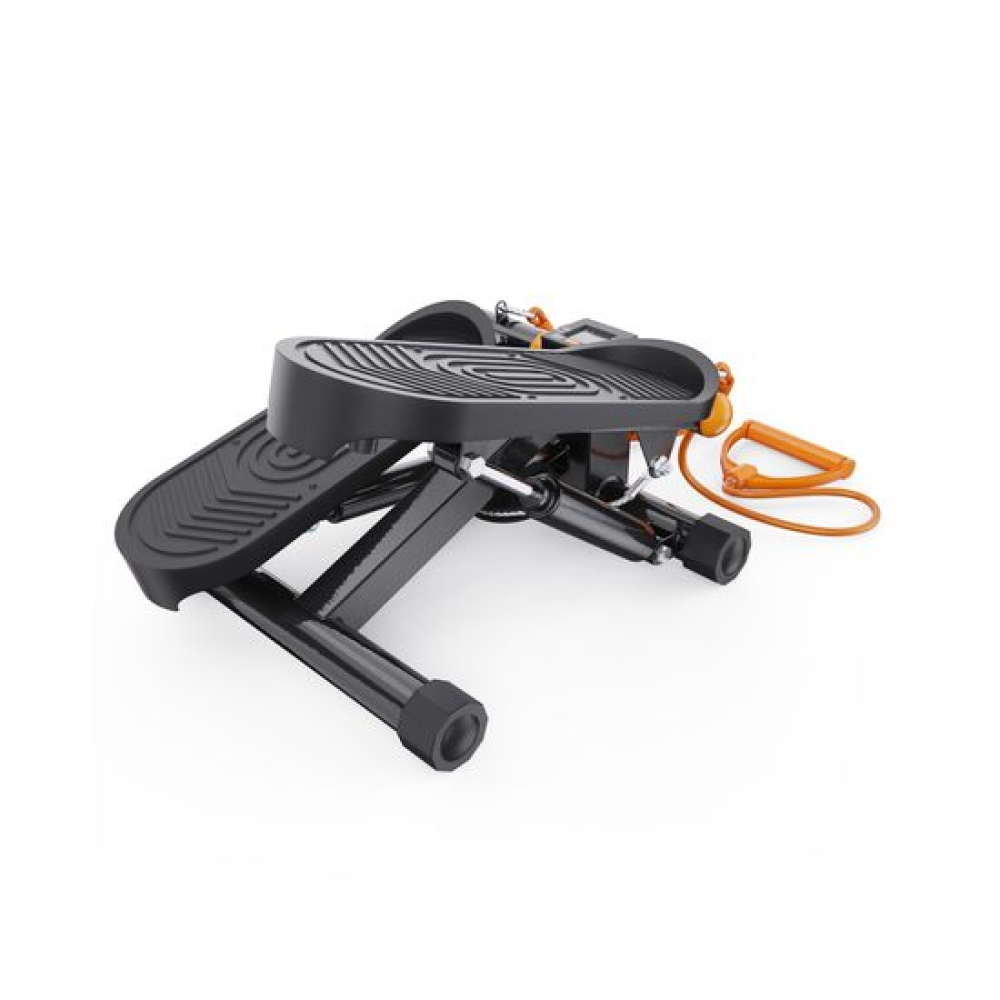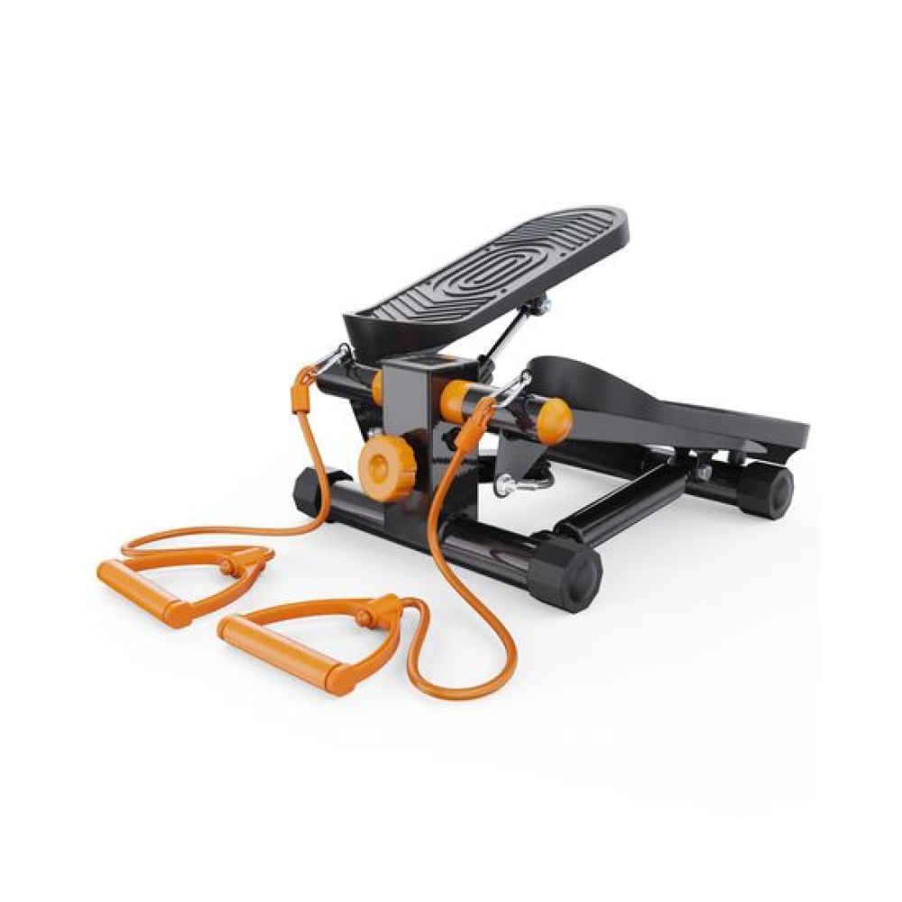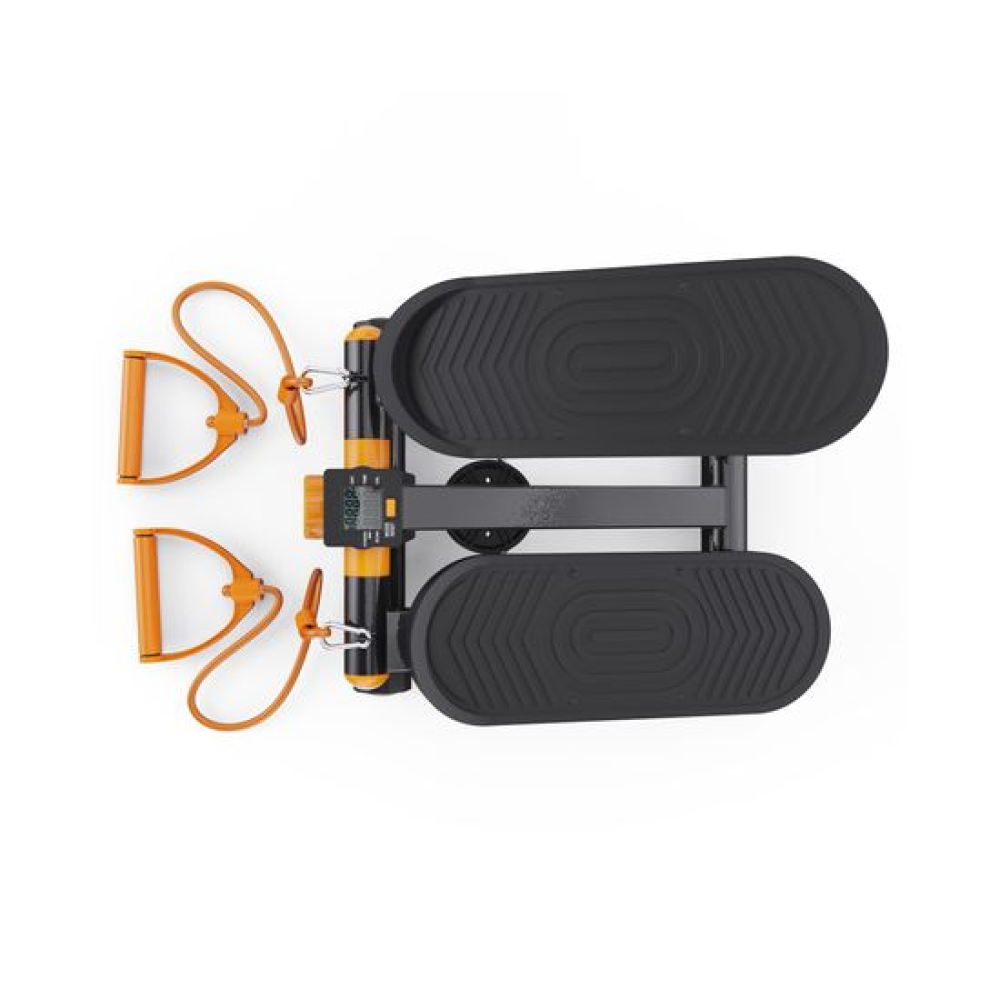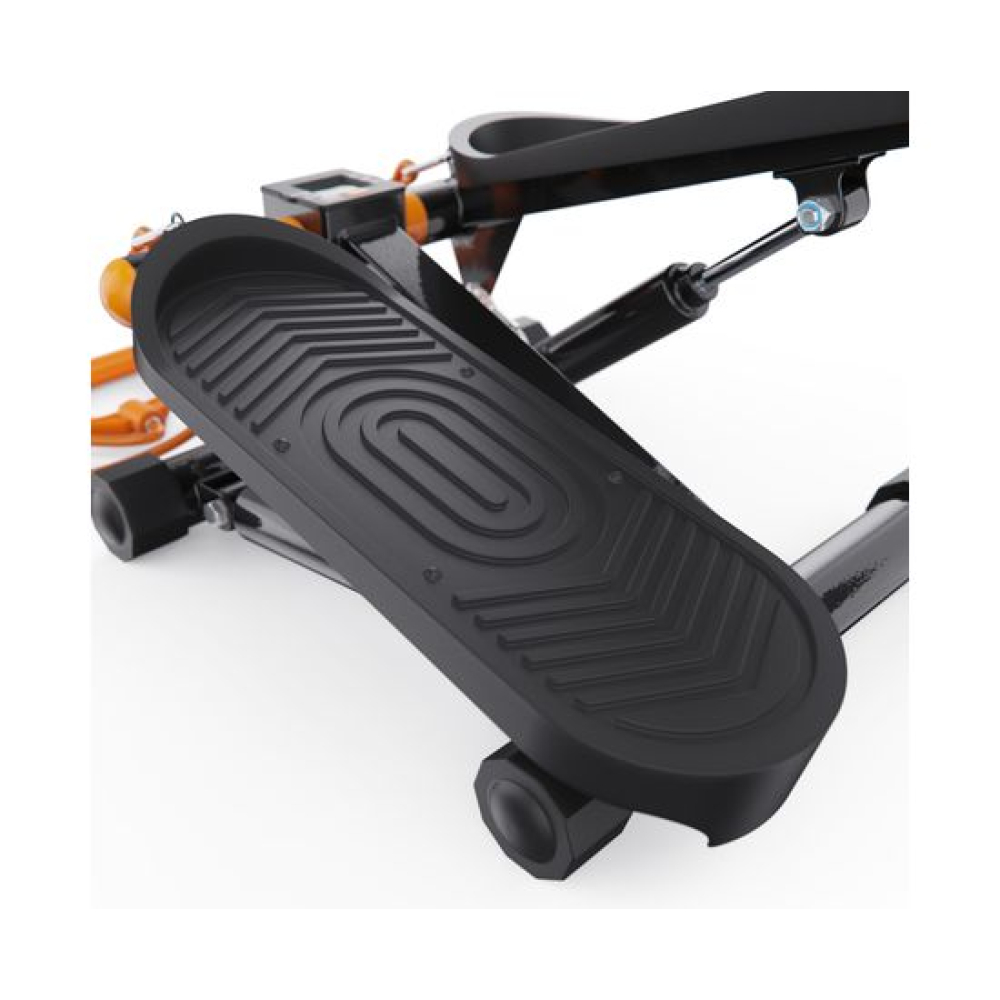 Министеппер с оранжевыми эспандерами DFC DAEYEGIM — это компактный и эффективный тренажёр для домашних кардиотренировок, направленных на укрепление мышц ног, ягодиц и нижней части корпуса. Благодаря встроенным эспандерам длиной 89 см, вы также можете задействовать мышцы рук и плечевого пояса, делая тренировку более комплексной.Степпер оснащён гидравлической системой нагрузки, которая обеспечивает плавный и тихий ход педалей. Вы можете механически регулировать уровень нагрузки, подстраивая интенсивность тренировки под свои цели и физическую подготовку. Максимальный вес пользователя — 110 кг, что делает тренажёр универсальным для большинства пользователей.Благодаря компенсаторам неровности пола, степпер стабильно стоит даже на неидеальных поверхностях, а широкие педали размером 10,5 х 30 см с рельефным покрытием обеспечивают уверенное сцепление с обувью и безопасность во время занятий.На монохромном LCD-дисплее отображаются все ключевые параметры: время тренировки, количество шагов, шагов в минуту и сожжённые калории. Это позволяет легко отслеживать прогресс и контролировать эффективность каждого занятия. В комплекте 1 батарейка типа LR44.Компактные размеры в рабочем виде — 41 х 20 х 29,5 см — делают этот тренажёр идеальным выбором для занятий в квартире или офисе. Министеппер DFC DAEYEGIM не требует подключения к сети, легко помещается под кровать или в шкаф и готов к тренировке в любое время.