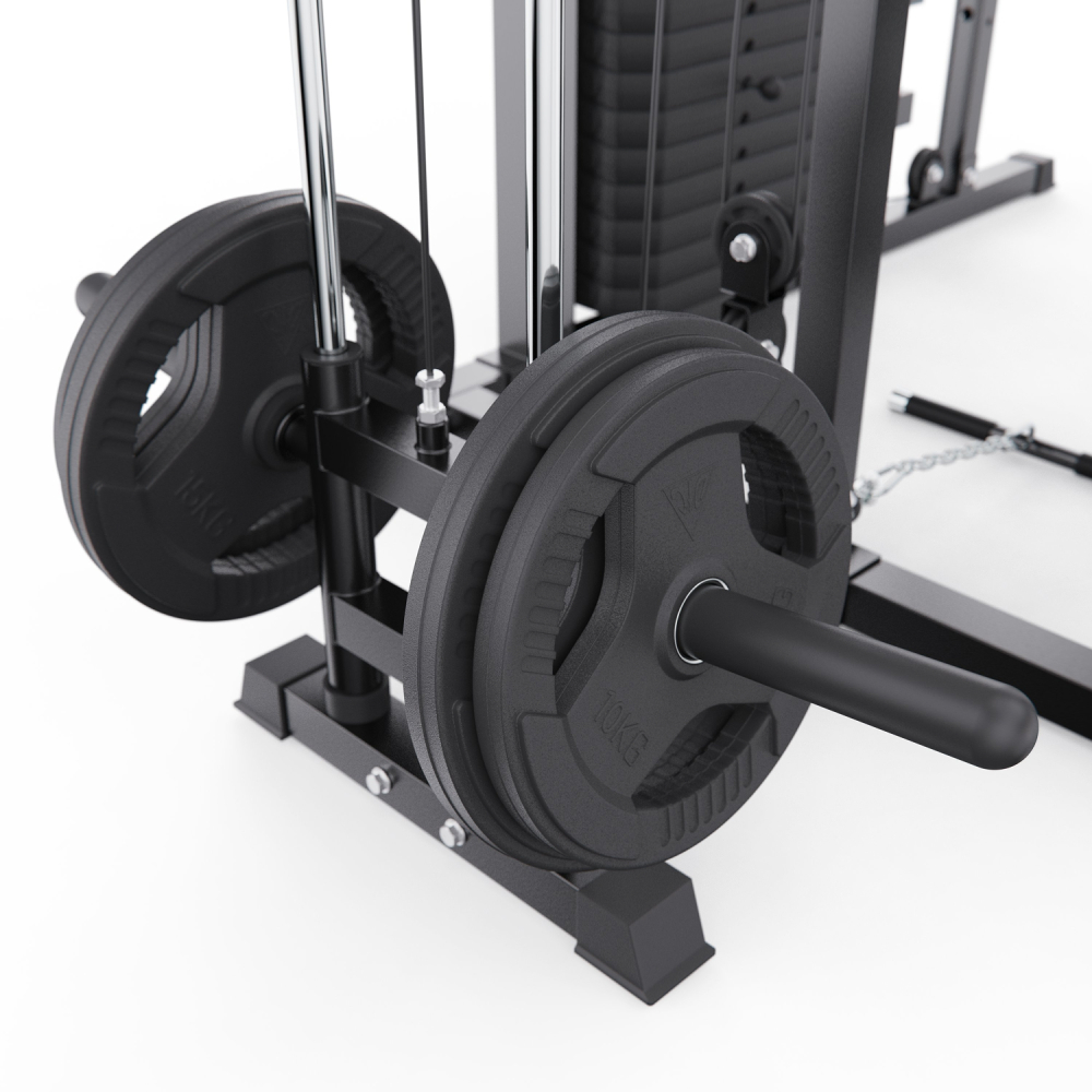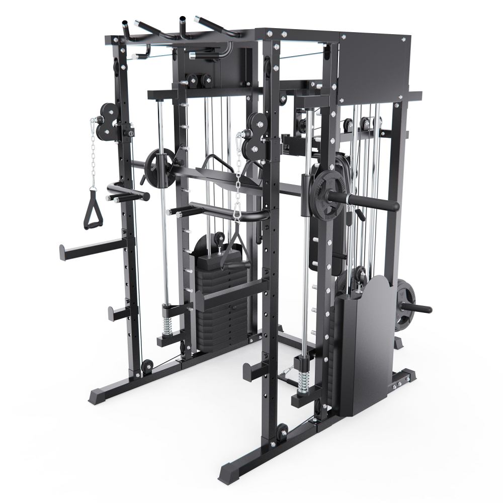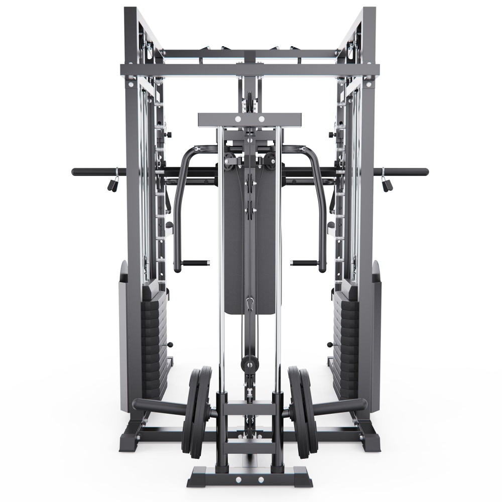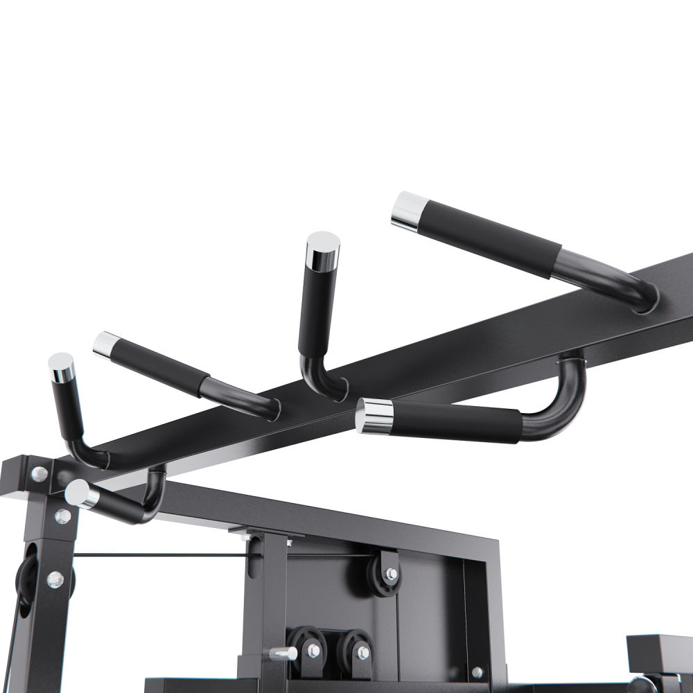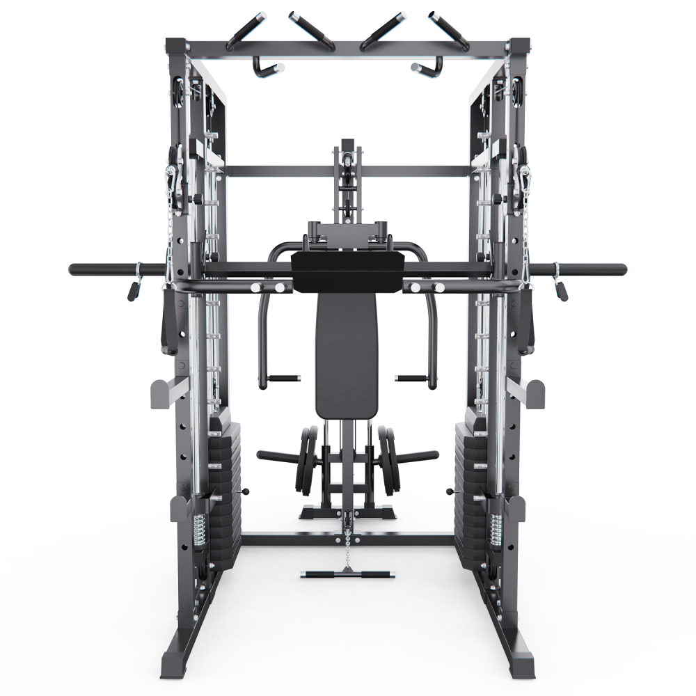 Многофункциональный силовой комплекс DFC D8680 — это универсальный тренажёр для домашних силовых тренировок, рассчитанный на регулярное и интенсивное использование. Он позволяет эффективно прорабатывать все основные группы мышц: грудные мышцы, мышцы спины, плечевой пояс, руки, ноги, а также мышцы пресса и кора, обеспечивая полноценную тренировку всего тела в домашних условиях. Тренажер рассчитан на максимальный вес пользователя до 250 кг, что делает его подходящим для большинства пользователей. Прочная стальная рама с профилем 50 х 70 х 1,5 мм обеспечивает устойчивость, надежность и безопасность во время тренировок, а посадочный диаметр 50 мм позволяет использовать стандартные силовые диски. Многофункциональный силовой комплекс позволяет выполнять широкий спектр упражнений: жимы и тяги для груди и спины, верхнюю и нижнюю тягу, баттерфляй, упражнения на бицепс и трицепс, тяги к поясу, приседания и упражнения со штангой, а также тренировки на пресс. В конструкции предусмотрено 24 свободных блока и 2 встроенных весовых блока весом по 72 кг. Такая система позволяет гибко настраивать нагрузку по уровню физической подготовки — от начинающего до уверенного спортсмена. Силовой комплекс удобно использовать как для набора мышечной массы, так и для поддержания формы. Штанга регулируется по высоте с помощью удобных рычагов и может фиксироваться на 11 уровнях, что позволяет точно настроить тренажёр под рост пользователя и конкретное упражнение. Комплекс можно совмещать со скамьёй для жима, что значительно расширяет функциональность и делает возможным выполнение классических жимовых упражнений. Для изолированной проработки грудных мышц и плечевого пояса тренажёр оснащён баттерфляем, который позволяет выполнять сведение и разведение рук с контролируемой нагрузкой. Это упражнение помогает эффективно формировать рельеф груди и улучшать мышечную координацию, минимизируя нагрузку на суставы. Верхняя часть комплекса оборудована турником с несколькими вариантами хвата, что позволяет акцентировать нагрузку на различные участки мышц спины, плеч и рук. В комплект также входит V-образная тяговая рукоятка, предназначенная для тяг узким хватом и тяг к поясу, обеспечивающая глубокую и точную проработку широчайших мышц спины. Силовой комплекс DFC D8680 — это оптимальный выбор для тех, кто ищет силовой комплекс для дома, домашний тренажёр «всё в одном» и полноценную замену тренажёрному залу. Он подойдёт для набора мышечной массы, поддержания формы и функциональных силовых тренировок в домашних условиях. Гарантия на детали подверженные естественному износу в процессе эксплуатации — до 6 месяцев с момента установки тренажера при условии регулярного планового ТО. Важно: гарантия не распространяется на преждевременный износ из-за чрезмерной эксплуатации тренажера.