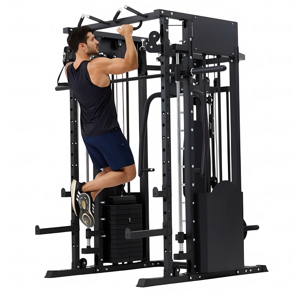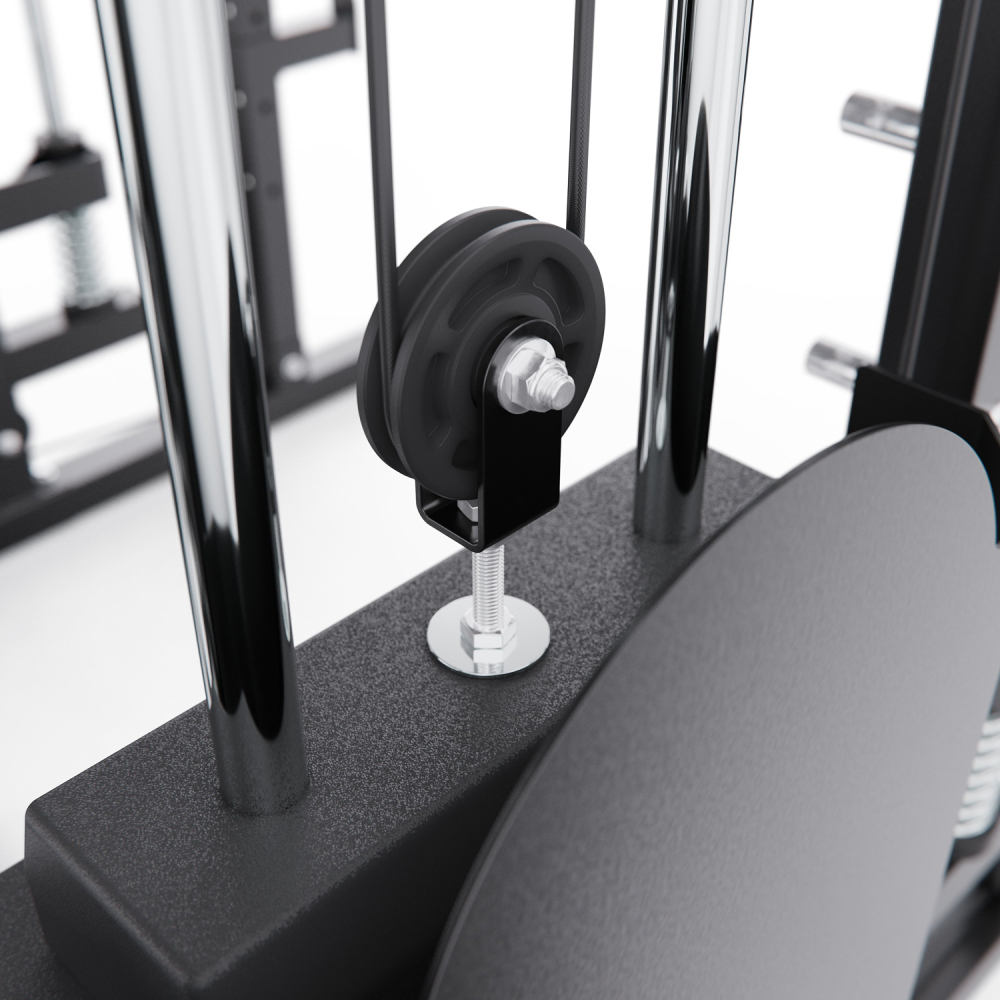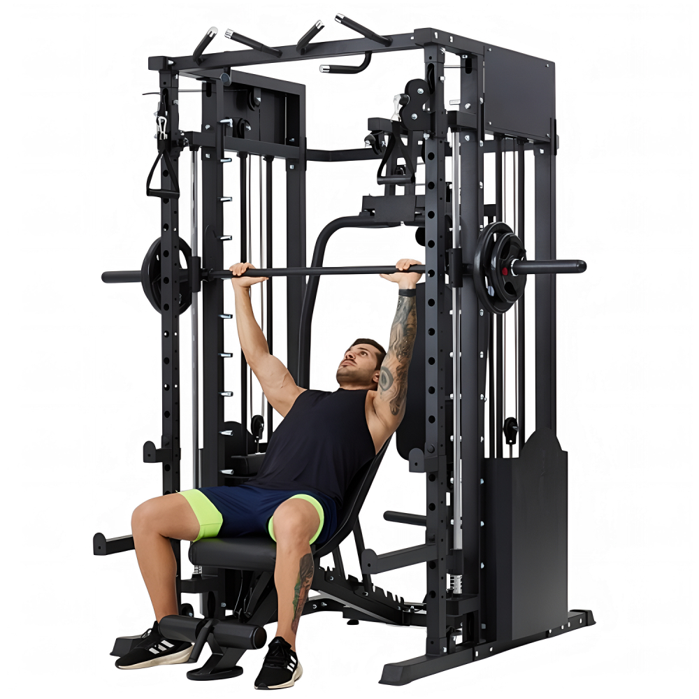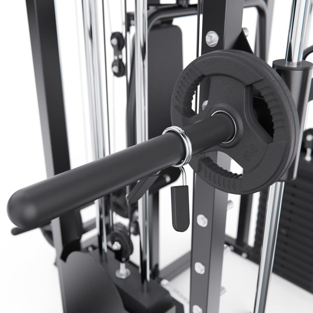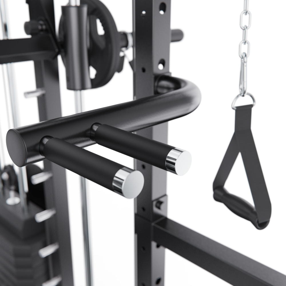 Многофункциональный силовой комплекс DFC D8680 — это универсальный тренажёр для домашних силовых тренировок, рассчитанный на регулярное и интенсивное использование. Он позволяет эффективно прорабатывать все основные группы мышц: грудные мышцы, мышцы спины, плечевой пояс, руки, ноги, а также мышцы пресса и кора, обеспечивая полноценную тренировку всего тела в домашних условиях. Тренажер рассчитан на максимальный вес пользователя до 250 кг, что делает его подходящим для большинства пользователей. Прочная стальная рама с профилем 50 х 70 х 1,5 мм обеспечивает устойчивость, надежность и безопасность во время тренировок, а посадочный диаметр 50 мм позволяет использовать стандартные силовые диски. Многофункциональный силовой комплекс позволяет выполнять широкий спектр упражнений: жимы и тяги для груди и спины, верхнюю и нижнюю тягу, баттерфляй, упражнения на бицепс и трицепс, тяги к поясу, приседания и упражнения со штангой, а также тренировки на пресс. В конструкции предусмотрено 24 свободных блока и 2 встроенных весовых блока весом по 72 кг. Такая система позволяет гибко настраивать нагрузку по уровню физической подготовки — от начинающего до уверенного спортсмена. Силовой комплекс удобно использовать как для набора мышечной массы, так и для поддержания формы. Штанга регулируется по высоте с помощью удобных рычагов и может фиксироваться на 11 уровнях, что позволяет точно настроить тренажёр под рост пользователя и конкретное упражнение. Комплекс можно совмещать со скамьёй для жима, что значительно расширяет функциональность и делает возможным выполнение классических жимовых упражнений. Для изолированной проработки грудных мышц и плечевого пояса тренажёр оснащён баттерфляем, который позволяет выполнять сведение и разведение рук с контролируемой нагрузкой. Это упражнение помогает эффективно формировать рельеф груди и улучшать мышечную координацию, минимизируя нагрузку на суставы. Верхняя часть комплекса оборудована турником с несколькими вариантами хвата, что позволяет акцентировать нагрузку на различные участки мышц спины, плеч и рук. В комплект также входит V-образная тяговая рукоятка, предназначенная для тяг узким хватом и тяг к поясу, обеспечивающая глубокую и точную проработку широчайших мышц спины. Силовой комплекс DFC D8680 — это оптимальный выбор для тех, кто ищет силовой комплекс для дома, домашний тренажёр «всё в одном» и полноценную замену тренажёрному залу. Он подойдёт для набора мышечной массы, поддержания формы и функциональных силовых тренировок в домашних условиях. Гарантия на детали подверженные естественному износу в процессе эксплуатации — до 6 месяцев с момента установки тренажера при условии регулярного планового ТО. Важно: гарантия не распространяется на преждевременный износ из-за чрезмерной эксплуатации тренажера.