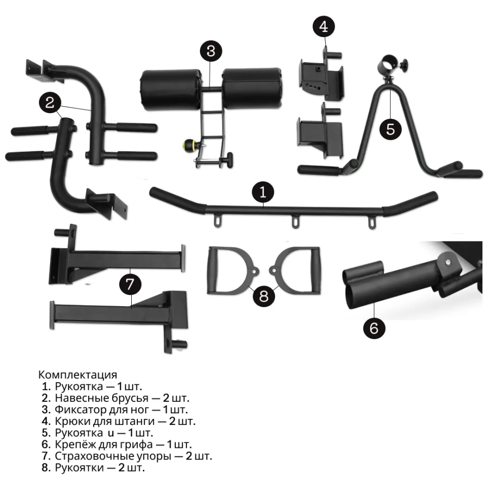 | Дополнительно | Силовая рамаМашина Смитта с противовесомМногопозиционный турникМногопозиционные брусьяДвойная регулируемая тягаШарнирный крепеж грифаСтраховочные упоры |