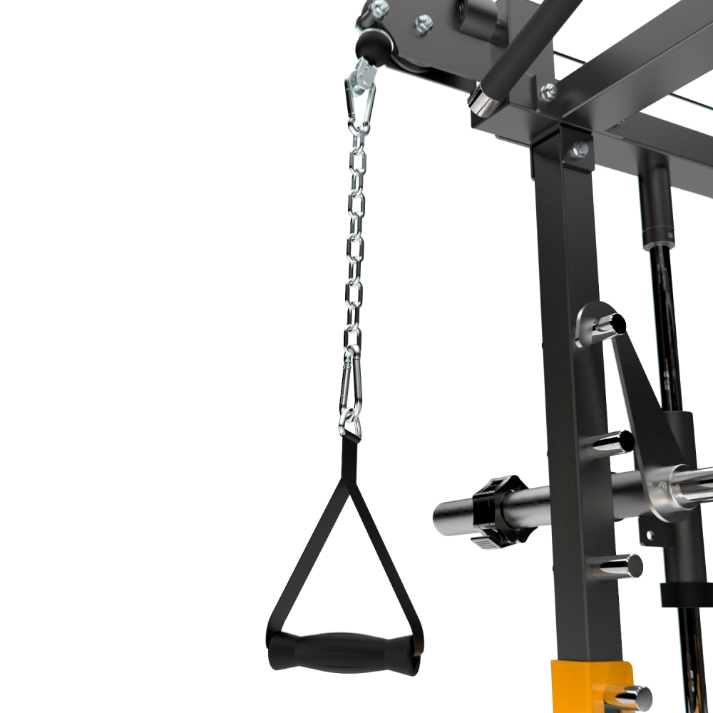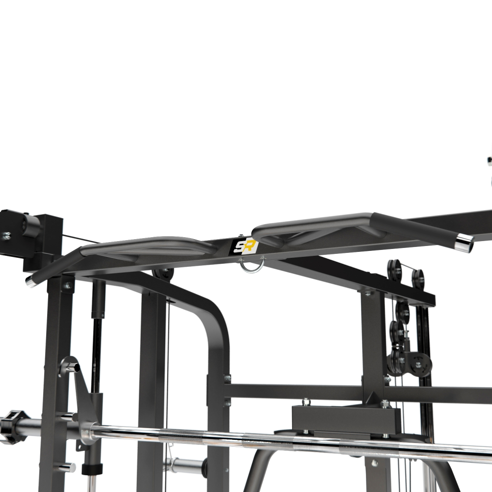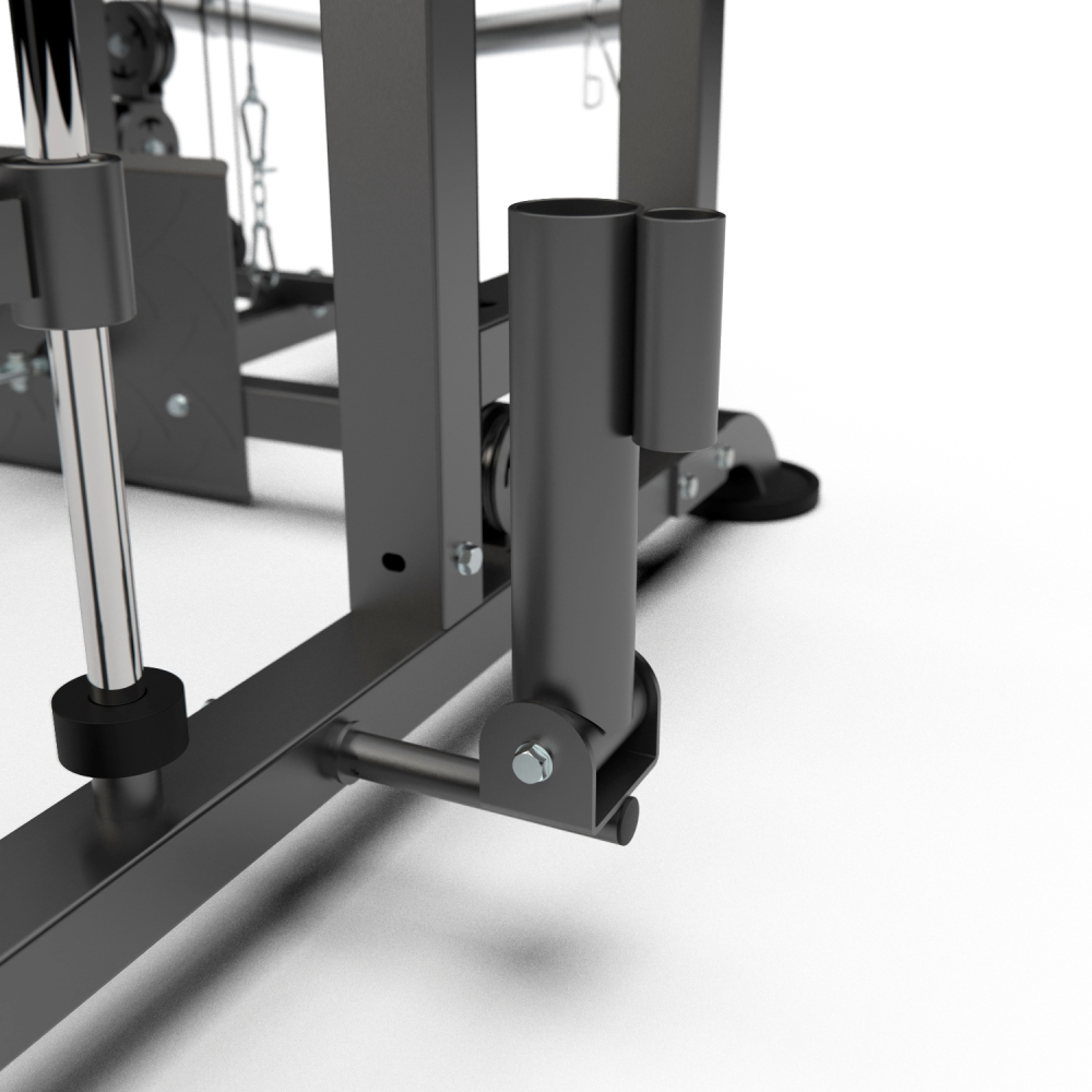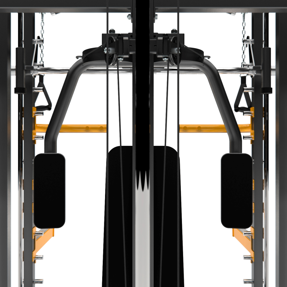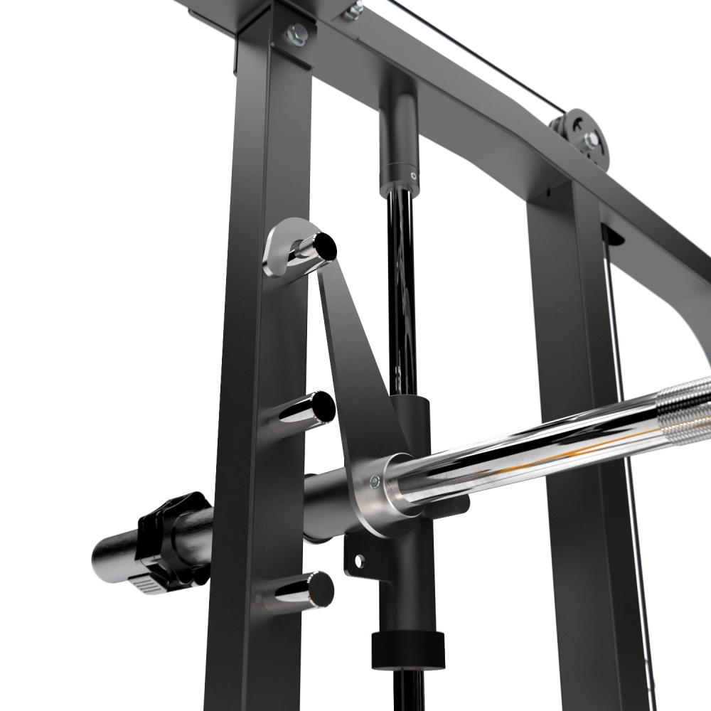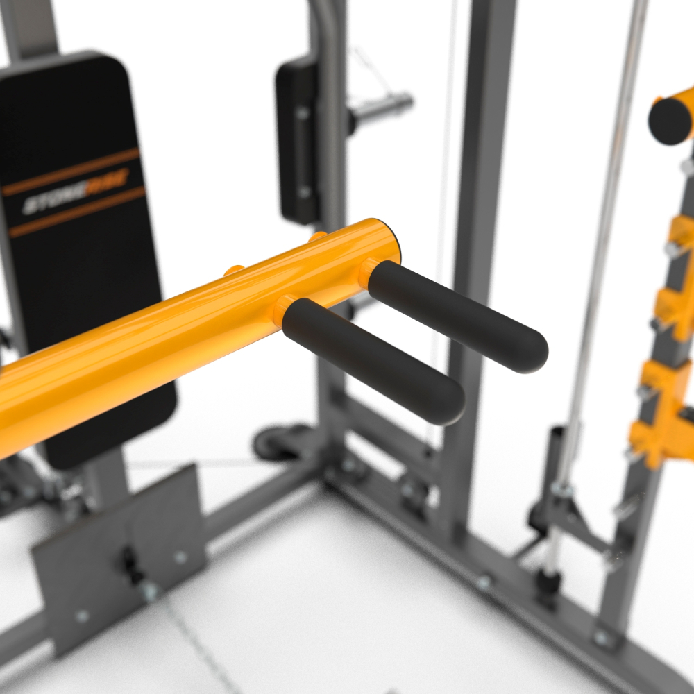 Мультистанция, Машина Смита STONERISE D873. Многочисленные функции тренажёра поспособствуют совокупному развитию мышц всего организма. Максимальная нагрузка на конструкцию и гриф допустима до 300 кг. Турник, ширина которого 200,5 см выдерживает до 200 кг, а тяга снизу и поручни для отжиманий - 180 кг. Нагрузка на спинку скамьи допустима до 250 кг. Баттерфляй и держатель грифа для жима лэндмайн выдерживают до 100 кг - держатель подходит для грифа диаметром 51 мм. В зависимости от потребностей, пользователь может регулировать высоту снарядов в 11-ти положениях от 43,5 см с шагом 13 см. Для удобства гриф оснащён замком Jaw-Lock, который не нужно раскручивать - достаточно одного щелчка, чтобы зафиксировать диски на грифе. Спинка скамьи размерами 74,5 х 29,5 см и толщиной 5 см, а также подлокотники баттерфляя длиной 82 см из прочной водоотталкивающей ткани. Для утяжеления используются диски диаметром 51 мм с центральным отверстием ( в комплект поставки не входят! ). Хранить диски возможно прямо на мультистанции: каждый из шести держателей выдерживает до 100 кг. Конструкция D873 устойчивая и долговечная: тросы толщиной 5 мм легко выдерживают постоянное использование, а корпус из профиля 50 х 70 х 2 мм сохранит устойчивость во время самых активных тренировок. В комплект D873 входят: 2 ручки для подтягивания на брусьях держатель для выполнения жима лэндмайн баттерфляй J-образные держатели для штанги 2 ручки на цепях для тяги сверху и снизу пружинный зажим для регулировки амплитуды движения ограничители амплитуды движения