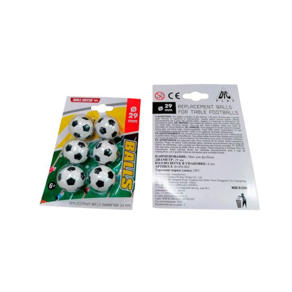 Набор мячей для настольного футбола DFC B-050-003 для домашнего использования.Мячи поставляются в пластиковой упаковке в количестве 6 штук диаметром 29 мм. Материал, из которого изготовлены мячи - плотный пластик с текстурной поверхностью, расцветка стандартная для футбольных мячей: чёрно-белая.