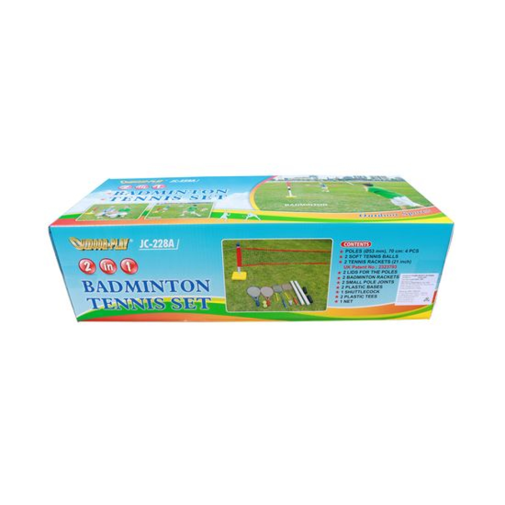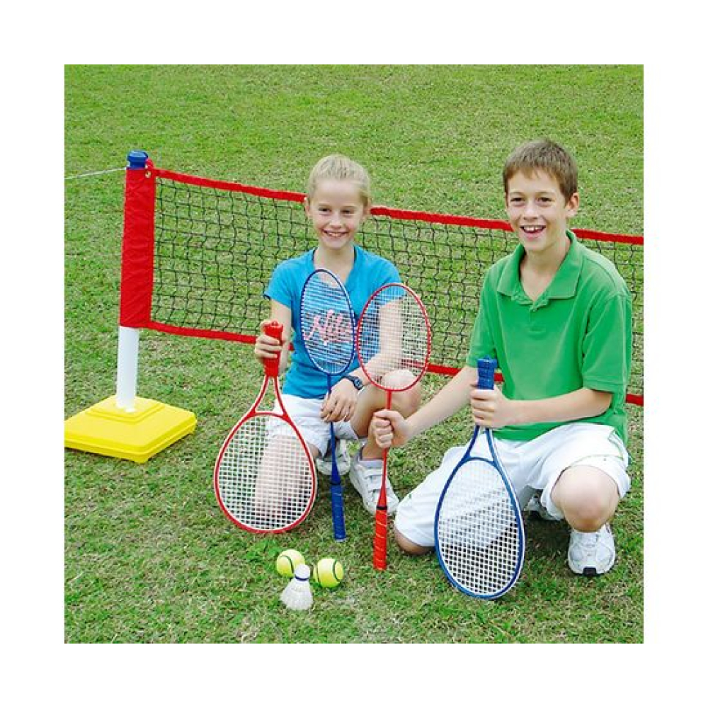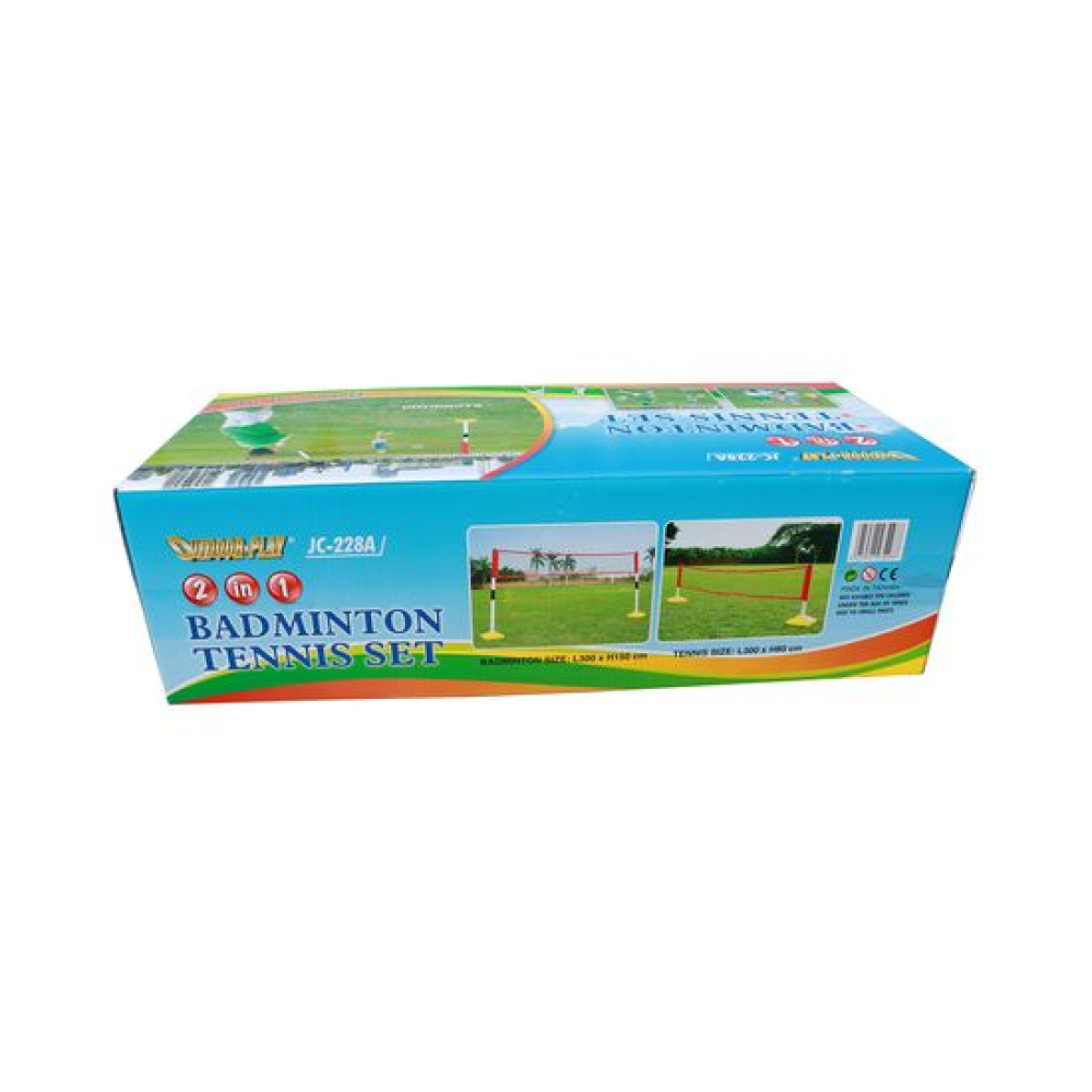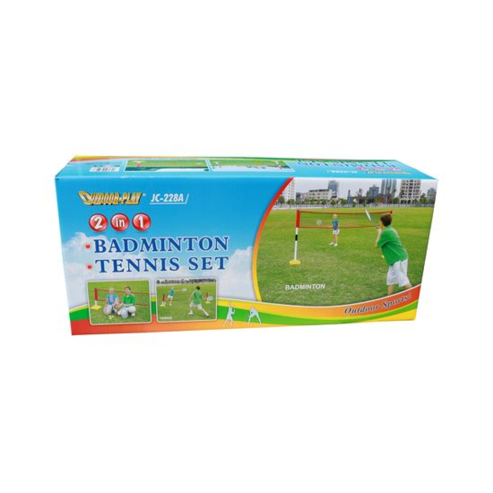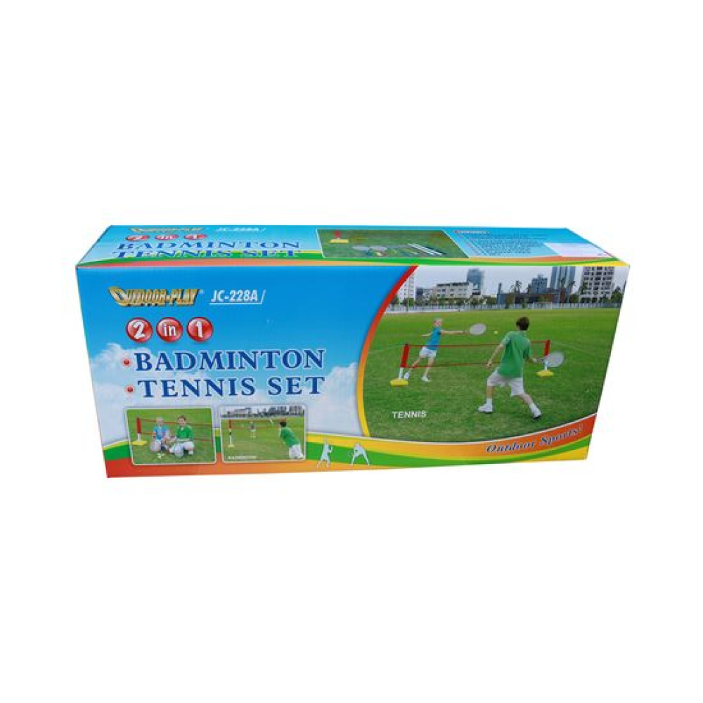 Комплект для игр на природе. В комплекте складная сетка, которую можно настроить для игры в теннис, бадминтон. Это возможно благодаря возможности изменить высоту сетки. В качестве утяжелителя используются ёмкости, в которые нужно налить воду. Также в комплекте идёт 2 ракетки для тенниса, два мячика для тенниса, два ракетки для бадминтона и воланчик к ним.Длина сетки 300 см, а высота для игры в бадминтон 150 см, для игры в теннис 80 см.