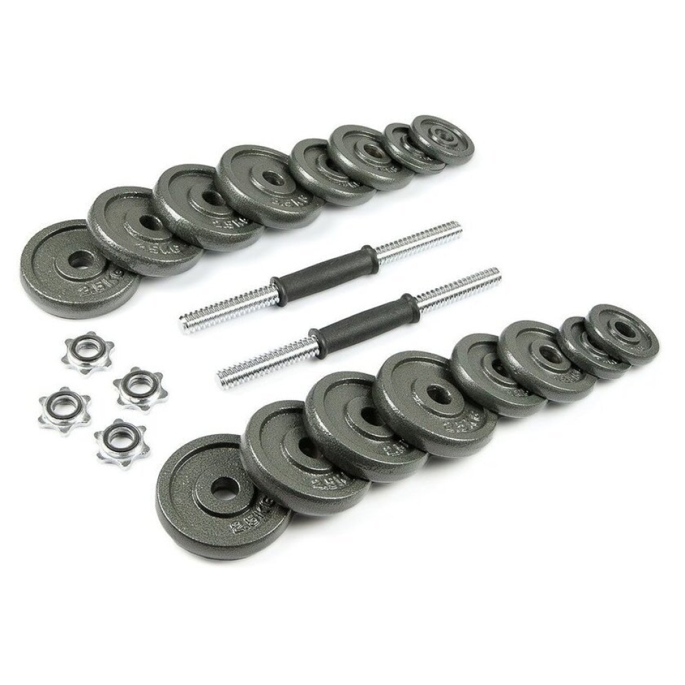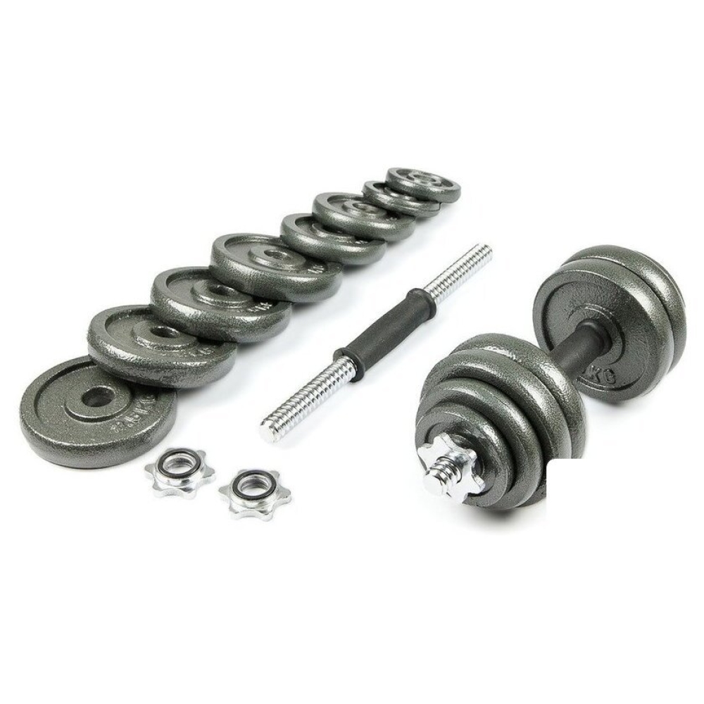 | Комплектация | - 2 грифа диаметром 26 мм, длиной 35 см (длина резьбы 11 см с каждой стороны) и весом 1,35 кг- 4 зажима, которые обеспечивают точные нагрузки давления- 4 диска х 0,5 кг (диаметр 9,0см, ширина 1,4 см)- 4 диска х 1,25 кг (диаметр 12 см, ширина 1,8 см)- 8 дисков х 2,5 кг (диаметр 14,5 см, ширина 2,2 см) |