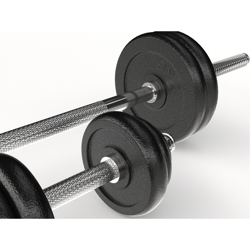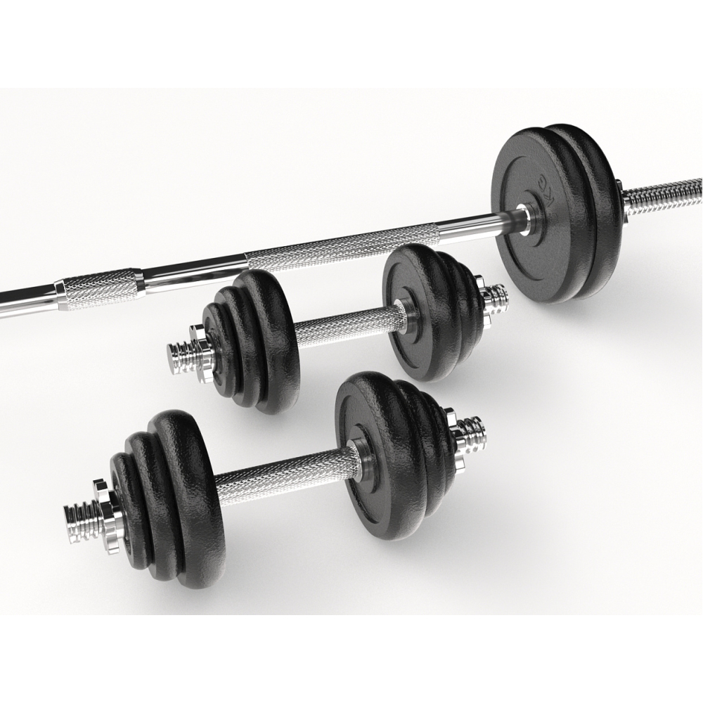 Набор состоит из двух гантелей и штанги, общий вес дисков составляет 50 кг. Удобная разборная конструкция позволяет регулировать вес гантелей в процессе занятий. В комплект входит компактный кейс для хранения и транспортировки гантелей и штанги. Вес дисков и количество: 4 диска по 5 кг (20 кг), 4 диска по 2.5 кг (10 кг), 6 дисков по 1.25 кг (7,5 кг), 6 дисков по 0.5 кг (3 кг). Вес грифов и гаек: 2 гантельных грифа по 1,1 кг, 1 гриф под штангу весом 5,2 кг, 6 гаек по 150 грамм. Вес кейса 3,6 кг. Размеры грифов: - длина каждого гантельного грифа составляет 34 см, длина хвата 10 см, длина каждого посадочного места под диски 11 см. - длина грифа для штанги составляет 152 см. Общая нагрузка на гриф для штанги - 43 кг (полный комплект дисков). На каждый гантельный гриф можно разместить 6 дисков, по 3 с каждой стороны. Максимальный вес грифа составляет 17,8 кг.