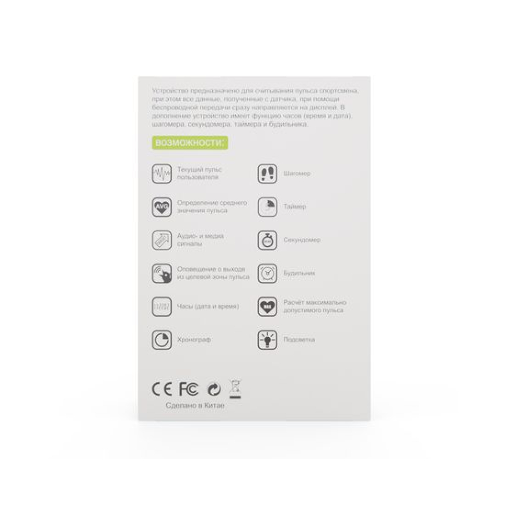 Нагрудный кардиодатчик и часы-монитор (комплект) DFC W585C — это универсальный комплект для домашнего и спортивного использования. Устройство осуществляет точный мониторинг пульса с помощью аналоговой беспроводной передачи данных (5.3K), а все показатели в реальном времени отображаются на экране.Устройство поддерживает режим отображения времени в форматах 12/24 часа, показывает дату и год, а также оснащено функцией GMT, что удобно при смене часовых поясов или тренировках по международным стандартам.Кардиомонитор постоянно отслеживает текущую частоту сердечных сокращений (ЧСС). Пользователь может установить верхний и нижний предел пульсовой зоны, при выходе за которые устройство выдает предупреждение.Шагомер поддерживает два режима: ходьба и бег, что позволяет точнее учитывать активность. Встроенная функция паузы позволяет приостанавливать подсчёт шагов при временной остановке, чтобы не искажать статистику.Режим секундомера: встроенный 1/100-секундный хронограф позволяет точно измерять продолжительность коротких интервалов — удобно для интервальных тренировок или спринтов.Режим таймера: устройство включает таймер общего времени тренировки, а также таймер пребывания в целевой пульсовой зоне, что помогает соблюдать нужную нагрузку.Режим будильника: имеется встроенный будильник с возможностью настройки времени сигнала, что позволяет использовать устройство не только как спортивный инструмент, но и как повседневные часы.Подсветка дисплея: экран оснащён EL-подсветкой, которая активируется вручную и работает 3 секунды, обеспечивая комфортное использование в условиях низкой освещённости.Дополнительные функции: счётчик калорий, режим просмотра сохранённых данных о тренировке. Доступен выбор между имперской и метрической системами измерения.В комплект входят часы-монитор, нагрудный ремень с датчиком и зажим для крепления на ремень/пояс, обеспечивающий надёжную фиксацию устройства во время тренировки.