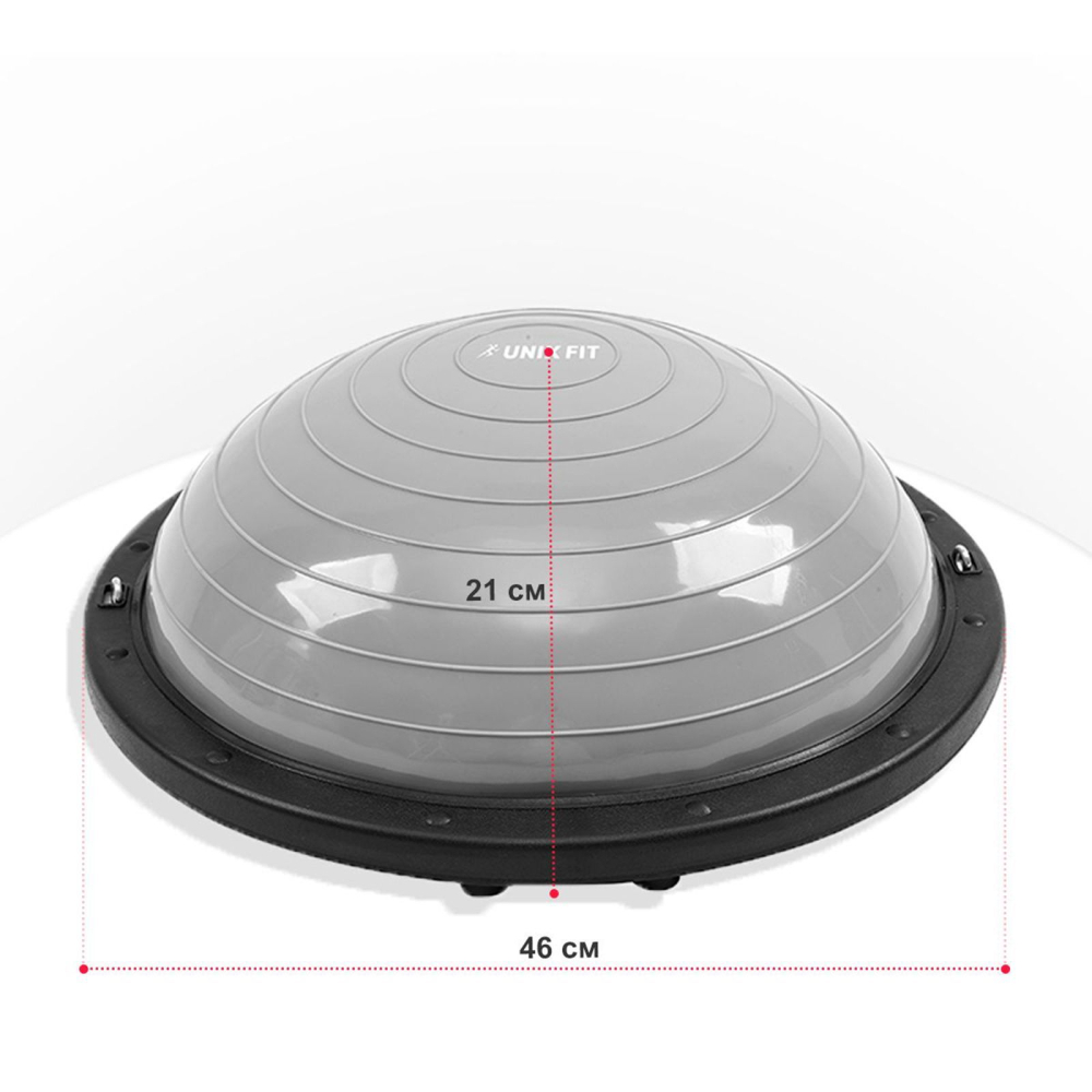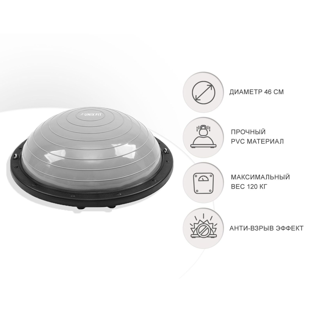 Полусфера балансировочная UNIX Fit поможет научиться балансу, поймать равновесие, проработать глубокие стабилизирующие мышцы, которые раньше не получалось тренировать? Все это возможно с балансировочной полусферой UNIXFIT. Сочетая в себе преимущества фитбола и платформы для баланса ваши тренировки станут простыми и эффективными. Тренажер подойдет для разогрева и разминки мышц, отжиманий, развития баланса. Результат тренировки с полусферой UNIX Fit: развитие чувства равновесия;улучшение координации;укрепление мышц живота;поддержание мышечного тонуса;снятие напряжения и стресса;сжигание калорий;формирование правильной осанки;активация, проработка стабилизирующих мышц;повышение выносливости;укрепление сухожилий, связок и суставов;профилактика заболеваний опорно-двигательного аппарата. Тренажер подходит для детей и взрослых. Максимальные вес, который выдерживает полусфера, 120 кг. Устойчивая платформа имеет нескользящую основу, обеспечивая безопасность и комфорт каждой тренировки. Прочный PVC-материал выдерживает интенсивную эксплуатацию. Антивзрыв эффект исключает возможность возникновения опасных ситуаций. Полусфера не сдувается и не электризуется. Не содержит посторонних запахов. Компактный размер позволяет разместить тренажер в любом помещении и взять с собой в поездку для занятий на природе и свежем воздухе. Комплект поставки включает насос и эспандеры. Гарантия на товар — 24 месяца. Регулярные тренировки помогут вам обрести хорошую физическую форму, получить заряд энергии и позитивное настроение! С UNIX Fit жизнь ярче!