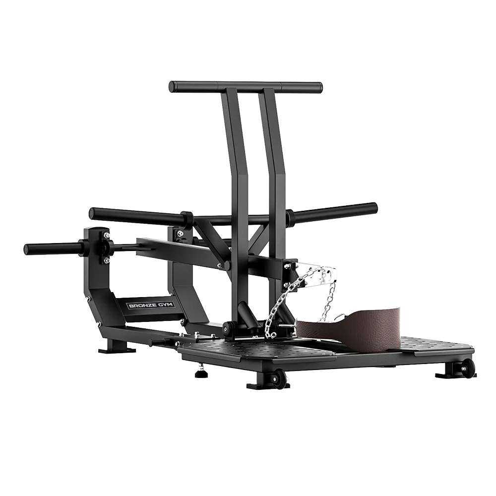 Платформа с нескользящей поверхностью и упорами для ног обеспечивает стабильную постановку, а пояс с цепью равномерно распределяет вес, позволяя эффективно нагружать квадрицепсы, ягодицы и бицепсы бедра.