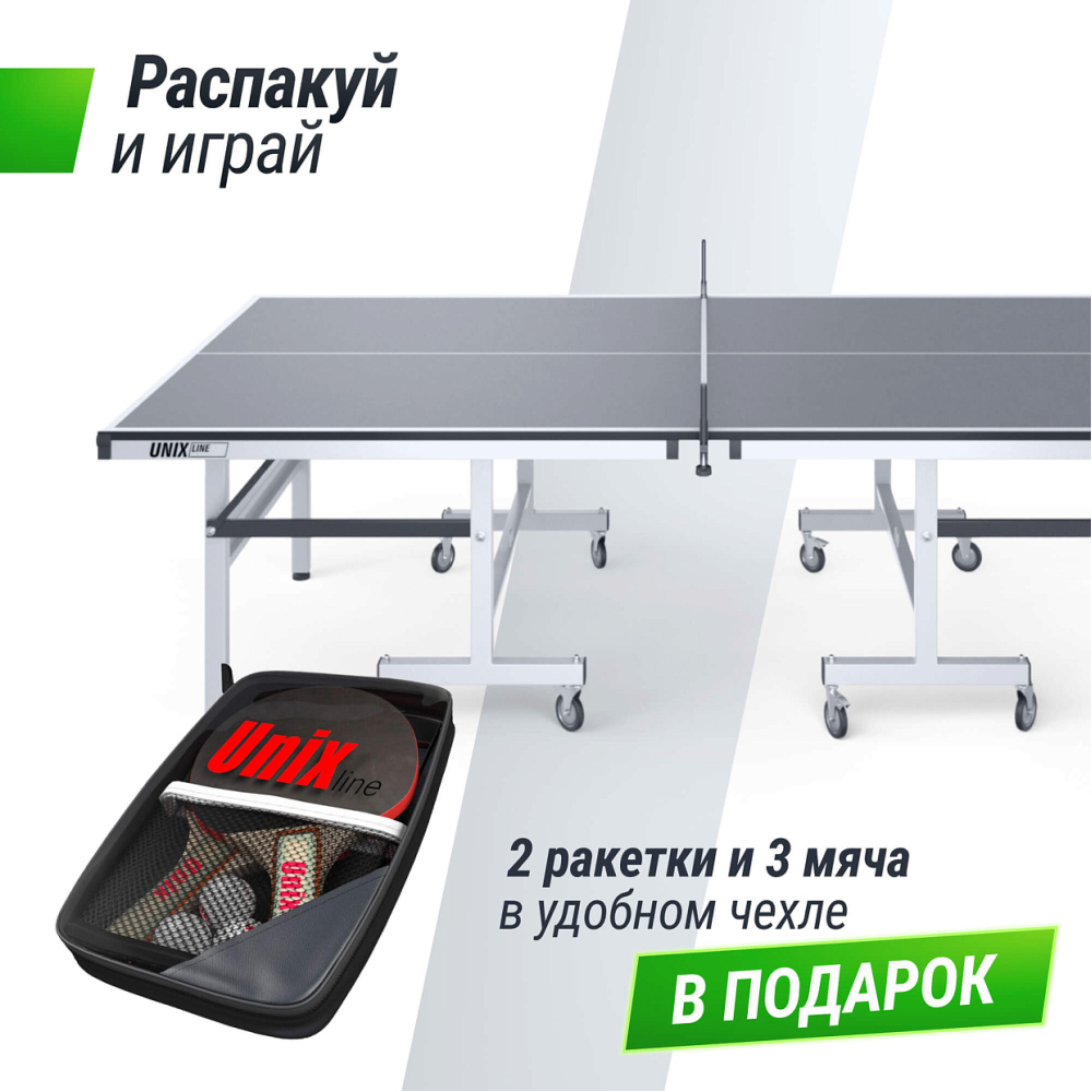 Профессиональный теннисный стол UNIX Line имеет игровую поверхность, сделанную из МДФ толщиной 25 мм, обеспечивающая отличный отскок мяча. Высокие игровые качества стола по достоинству оценят любители и профессиональные игроки. Конструкция состоит из двух отдельных половин для удобства перемещения и обеспечивает компактные размеры в сложенном состоянии. Вертикальное положение одной из сторон – отличный вариант для одиночной игры. Стол можно легко перемещать при помощи 8-ми прорезиненных колес диаметром 100 мм, на 4-х колесах установлены стопоры для повышения мобильности и устойчивости. Боковые опоры стола регулируются по высоте для установки на неровной поверхности. Несущая рама выполнена из стальных труб с профилем 50х50 и 50х25 мм. Стол поставляется полностью собранным, остаётся лишь установить колеса. Теннисный стол оснащен системой блокировки в сложенном состоянии для повышения безопасности во время хранения и транспортировки в помещении. Профессиональный теннисный стол UNIX Line обеспечивает отличное качество, комфорт и долговечность для множества часов активного отдыха и развлечения. Модель специально разработана для профессиональной игры в пинг-понг. В комплекте к столу поставляется сетка из нейлона с надежными винтовыми фиксаторами и набор для игры: 2 ракетки, 3 шарика в сумке. Укрывной универсальный чехол для стола не входит в комплект и приобретается отдельно. Защищает поверхность стола от пыли. .