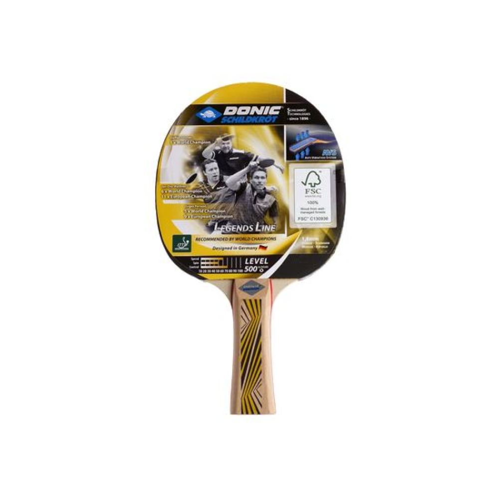 Ракетка DONIC "LEGENDS 500" рассчитана на тип игры Allround. Для покрытия используется накладка Elite, а толщина губки 1,8 мм. Форма ручки Concave - ручка, расширяющаяся к концу. Ракетка одобрена Международной федерацией настольного тенниса ITTF. AVSAnti-Vibration-System (AVS) — это амортизирующая система, разработанная Schildkröt. Благодаря AVS улучшается контроль мячика и снижаются вибрации, вызванные энергией удара. Два амортизирующих мягких слоя находятся между ручкой и её покрытием. В результате AVS повышает точность ударов как в оборонительном, так и в наступательном стиле игры.EliteУниверсальная резиновая накладка Elite создана из каучука. Она достаточно цепкая, что увеличивает контроль над мячиком во время игры, а также плотная, благодаря чему увеличивается и скорость. Эти свойства помогут комфортно играть как в атакующей позиции, так и в защитной.FSCФанера 6 мм, из которой сделана ручка имеет сертификат FSC (Лесной попечительский совет). Он является гарантом ответственного подхода к использованию лесных ресурсов и сохранения лесных экосистем в мировом масштабе.