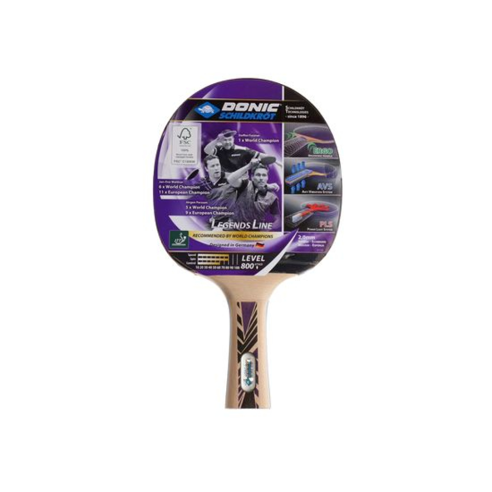 Ракетка DONIC "LEGENDS 800" рассчитана на тип игры Атака. Для покрытия используется накладка Energy, а толщина губки 2 мм. Форма ручки Concave - ручка, расширяющаяся к концу. Ракетка одобрена Международной федерацией настольного тенниса ITTF. AVSAnti-Vibration-System (AVS) — это амортизирующая система, разработанная Schildkröt. Благодаря AVS улучшается контроль мячика и снижаются вибрации, вызванные энергией удара. Два амортизирующих мягких слоя находятся между ручкой и её покрытием. В результате AVS повышает точность ударов как в оборонительном, так и в наступательном стиле игры.PLSPower Light System (PLS) - это система, снижающая общий вес рукоятки и переносящая центр тяжести на центральную часть благодаря полой конструкции. Таким образом, во время игры ваши удары будут гораздо быстрее и мощнее, а ощущение усталости придёт гораздо позже.ERGOРучка ERGO (эргономичная) анатомически точно прилегает к руке и помогает игроку чувствовать себя с ракеткой единым целым! Закругленная форма ручки позволяет избежать давления в руке и делает процесс игры более приятным и комфортным. ChampionУниверсальная резиновая накладка Champion создана по технологии SR (Starter Technology) из каучука. Она достаточно цепкая, что увеличивает контроль над мячиком во время игры, а также долговечная из-за прочности материала. Благодаря свойствам накладки, вы сможете эффективно играть как в атакующей позиции, так и в защитной.FSCФанера 6 мм, из которой сделана ручка имеет сертификат FSC (Лесной попечительский совет). Он является гарантом ответственного подхода к использованию лесных ресурсов и сохранения лесных экосистем в мировом масштабе.