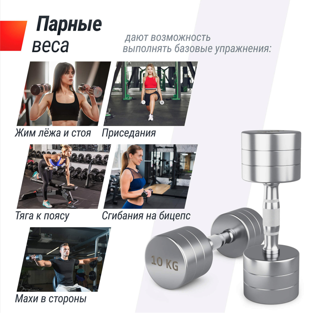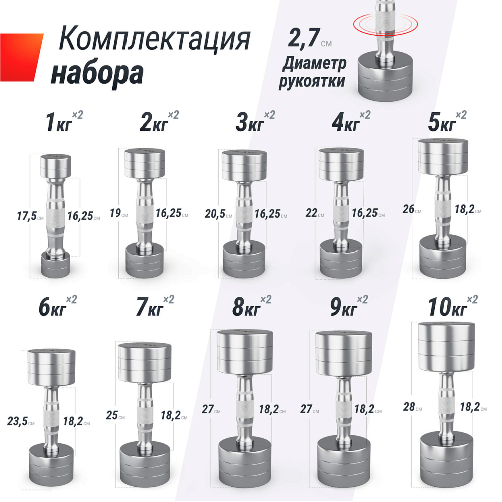 | Комплектация | гантели: 1 кг - 2 шт, 2 кг - 2 шт, 3 кг - 2 шт, 4 кг - 2 шт, 5 кг - 2 шт, 6 кг - 2 шт, 7 кг - 2 шт, 8 кг - 2 шт, 9 кг - 2 шт, 10 кг - 2 шт |