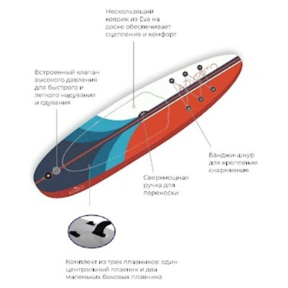 | Комплектация | доска, насос, весло, плавник, ремкомплект, ручка для воздушного клапана, страховочный лиш, сумка, водонепроницаемый чехол |