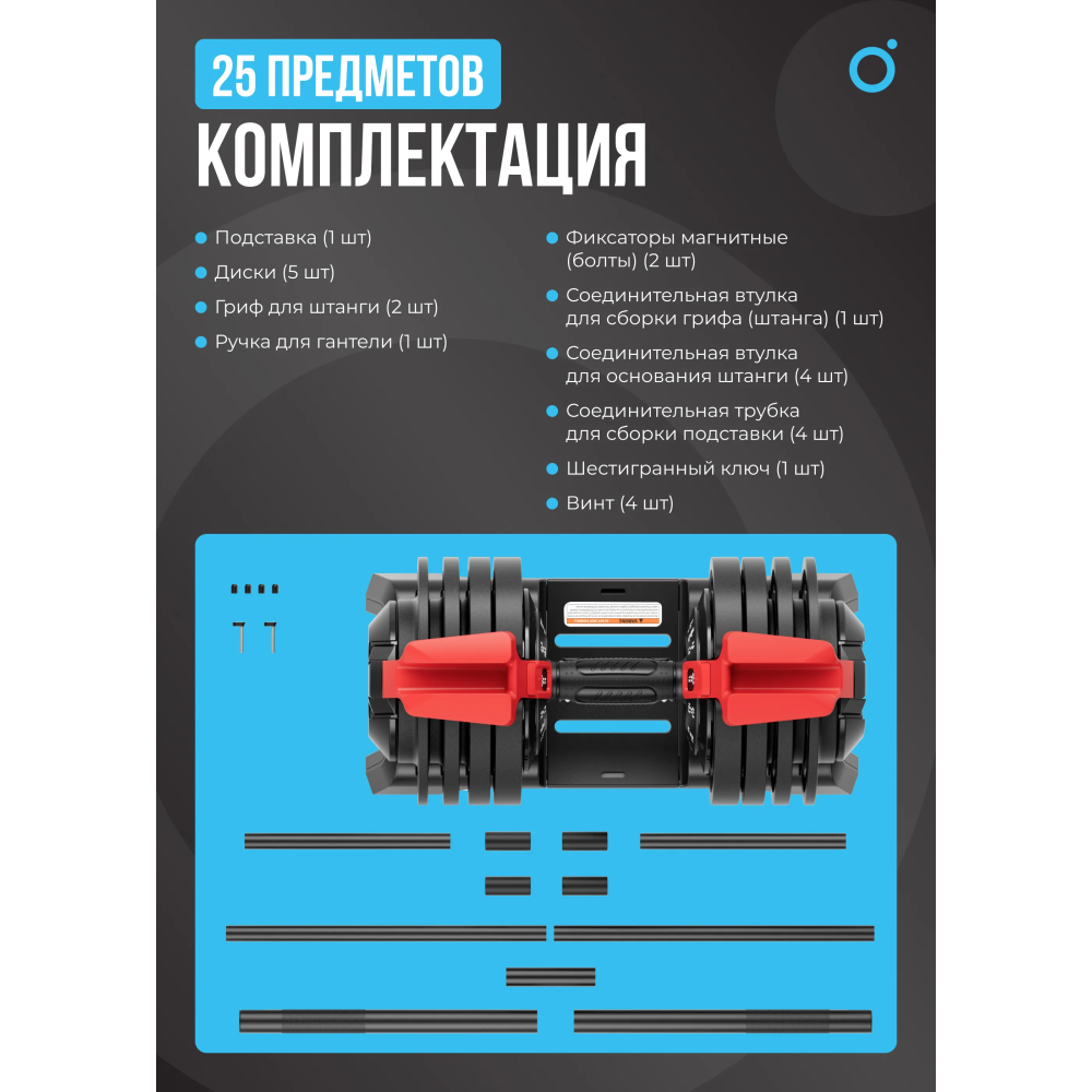 Разборная конструкция штанги легко трансформируется в гантель. Сборная штанга с общим весом конструкции 40 кг является неотъемлемой частью тренировок с отягощением.