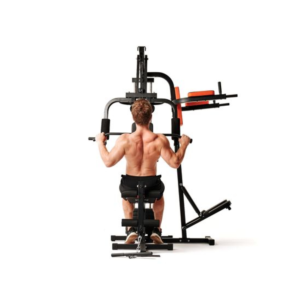 Силовой комплекс DFC из серии HomeGym D7002-60 предназначен для прокачки всех групп мышц: рук и верхнего плечевого пояса, спины, грудных мышц, пресса, ног. Позволяет выполнять силовые упражнения с разным функционалом для наилучшей эффективности тренировки. Сиденье и спинка с плотной обивкой чёрного цвета с оранжевыми вставками зафиксированны для комфортного выполнения упражнений. Парта для бицепса из той же ткани регулируется по высоте на 3 уровня. Степпер с гидроцилиндрами для дополнительной нагрузки. Максимальный вес пользователя — 120 килограмм.Комплекс не требует дополнительных снарядов - он полностью автономный. В комплект входит весовой стек массой 60 кг: 12 пластин по 4,6 кг и 1 верхняя пластина 4,4 кг. Ролики на подшипниках обеспечивают плавное движение. Стальной трос толщиной 5 мм в защитной оплетке так же гарантирует безопасность при выполнении упражнений.Опции силового тренажёра:Парта для бицепсаВ комплект силового комплекса входит регулируемая по высоте на 3 уровня парта для бицепса. С её помощью вы сможете прокачивать мышцы рук: бицепса и трицепса. Допустимо использование как входящей в комплект рукоятки, так и гантелей, приобретаемых отдельно. Размер парты 40,5 х 29 х 5-7,5 см.Верхняя тяга (гриф)Ручки грифа с нескользящей поверхностью. Используется для тренировки мышц рук (бицепс, трицепс) и спины. Для удобства перед упражнением снимите парту для бицепса. Длина грифа 98 см.БаттерфляйИспользуется для тренировки большой грудной мышцы (в том числе стернального участка), малой грудной и мышц ключичного отдела, а также мышц рук: бицепс, трицепс, брахиалис и лучевой разгибатель кисти. Валики у баттерфляя длиной 22 см и диаметром 8,5 см.Брусья для отжиманийОтжимания на брусьях стимулируют развитие мышц всего тела. Они расположены таким образом, чтобы пользователь смог выполнять упражнения в зависимости от собственных потребностей: стандартные отжимания, с акцентом на трицепс, поднятие ног и прочие. Поручни брусьев находятся на высоте 163 см от пола, их размер составляет 28 х 12 х 5 см. Спинка размерами 43 х 25 х 5 см.Скамья со спинкой и валикиУдобное расположение скамьи гарантирует правильное положение тела во время тренировок и эффективность выполнения упражнений. Размер спинки скамьи 67,5 х 23 х 5 см, а сиденья - 38,5 х 26-30 х 4,5 см. Валики для экстензии ног прокачивают все мышцы бедра. Их длина 15 см, а диаметр - 7 см.СтепперСтеппер с гидравлическими цилиндрами служит не только для поддержки перед упражнениями на брусьях, но и для разогрева икроножных мышц. Размер педалей степпера составляет 33,5 х 11,5 см, расстояние между педалями 10,5 см.Тяга снизуИспользуется для силовых упражнений на мышцы спины, бицепса, ног. Для комфорта и безопасности предусмотрена платформа толщиной 3 мм с рифлёной поверхностью. Общая длина платформы 31 см.Тяга сверхуПерецепив рукоятку, вы сможете выполнять упражнения на мышцы не только спины, но и трицепса. Рукоятка длиной 38,5 см входит в комплектацию.