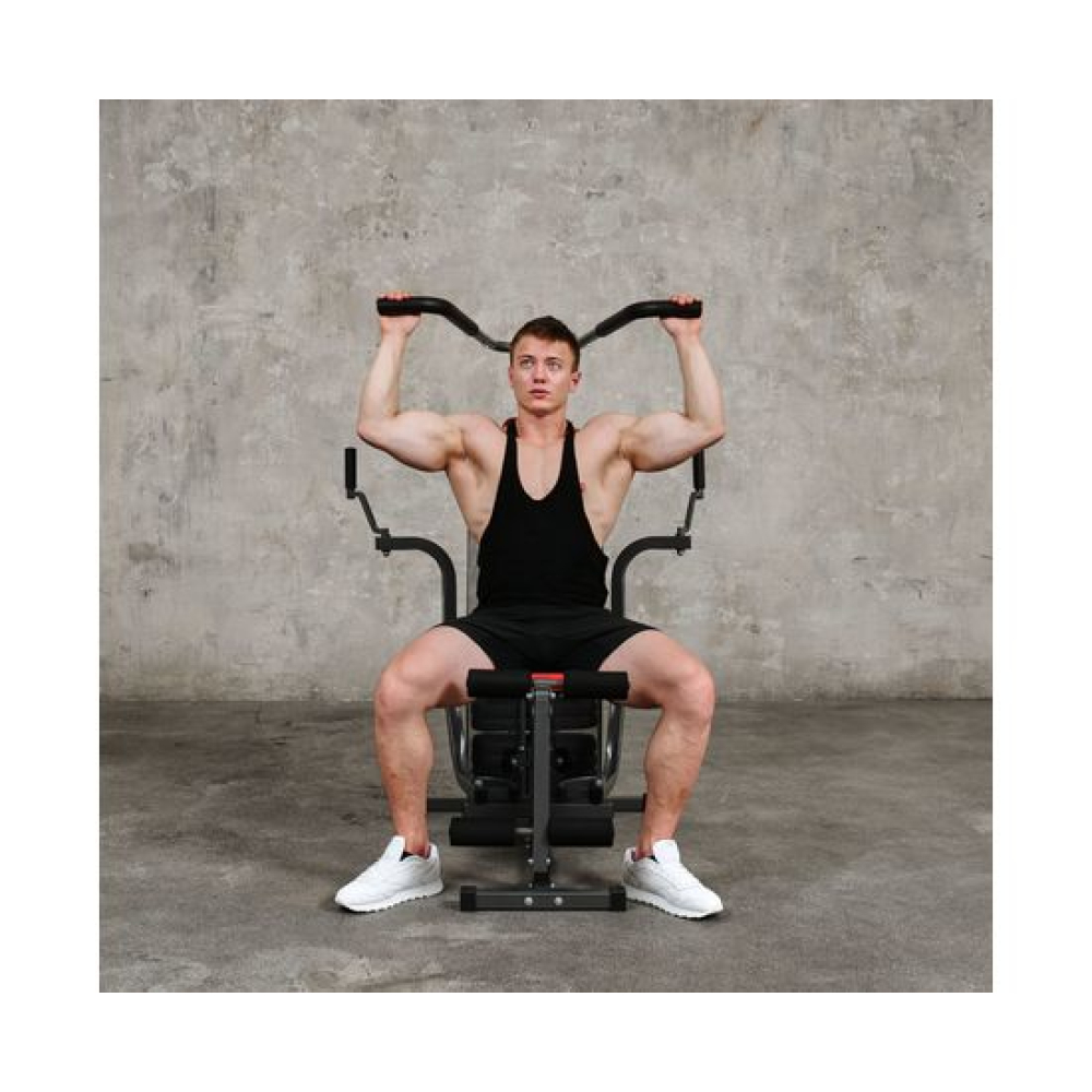 Силовой комплекс DFC Kondition 6000 – это многофункциональный тренажер, предназначенный для силовых тренировок в домашних условиях. Он включает в себя несколько различных упражнений, которые помогут укрепить мышцы всего тела.Вес стека составляет 45 килограмм, что позволяет регулировать нагрузку в процессе тренировки. Максимальный вес пользователя, которого способен выдержать тренажер, составляет 110 килограмм.В комплекте с тренажером идут следующие аксессуары: Тяга сверху/снизу: позволяет выполнять упражнения на мышцы спины, груди и рук. В зависимости от положения верхней ручки, можно выполнять разные упражнения. Боковая тяга: предназначена для проработки мышц спины и рук. Валики для ног: используются для выполнения упражнений на мышцы ног и ягодиц. Сиденье и спинка: обеспечивают комфорт во время тренировки. Весовой стек: состоит из 7 пластин, с помощью которых можно регулировать нагрузку.На силовом комплексе Kondition 6000 можно выполнять множество различных упражнений. Вот некоторые из них: Упражнения на мышцы груди: жим сидя, сведение боковых поручней, жим от себя верхней тяги. Упражнения на мышцы спины: тяга поручня от себя, тяга вертикального блока. Упражнения для мышц ног: разгибание ног на тренажере.Силовой комплекс DFC Kondition 6000 обеспечивает качественную тренировку всего тела, позволяя вам достичь желаемых результатов в домашних условиях без необходимости посещения тренажерного зала.
