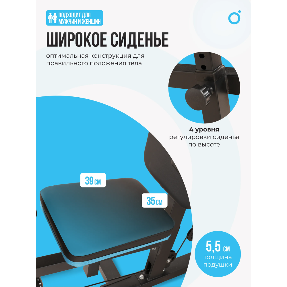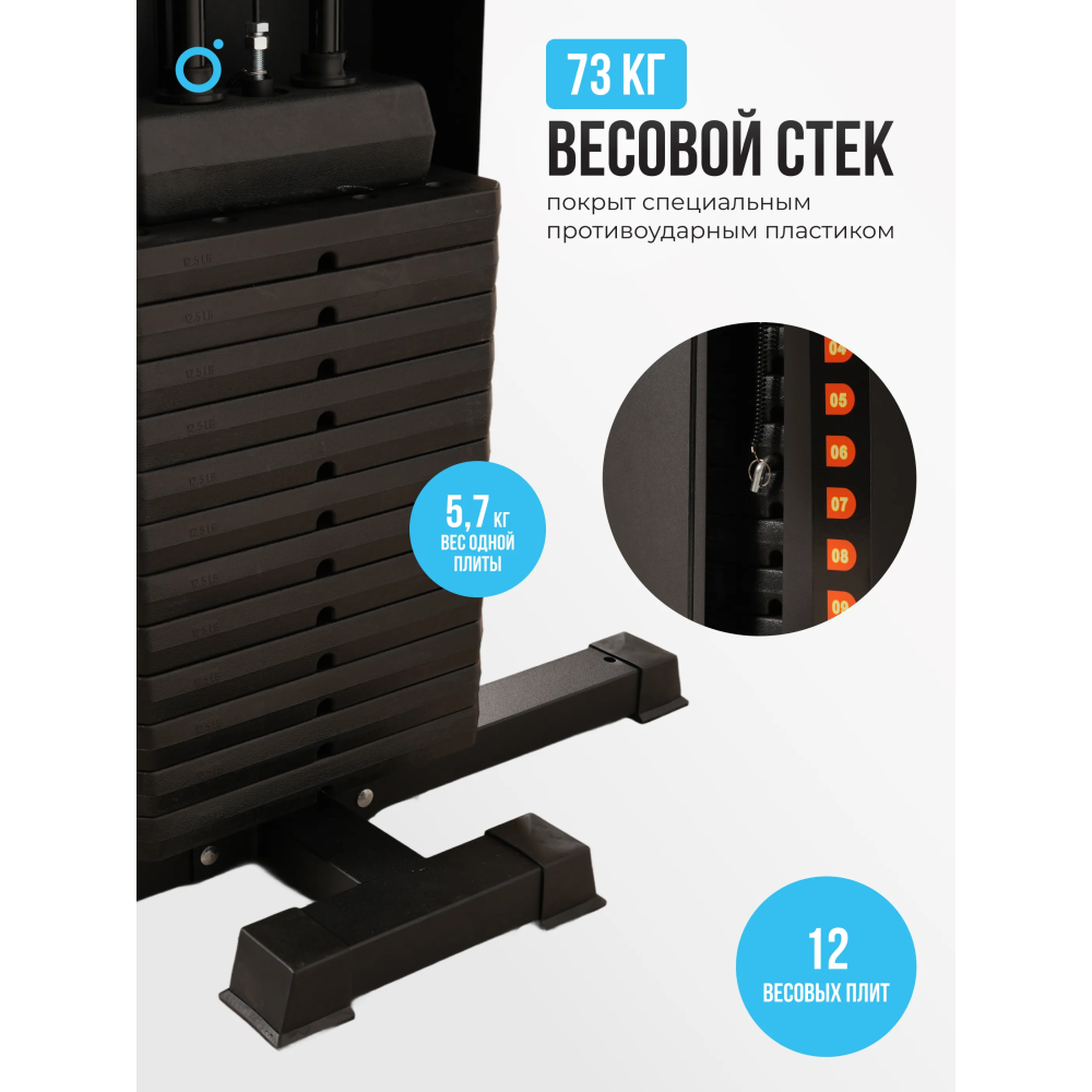 Комплекс позволяет выполнять разнообразные упражнения для всех групп мышц благодаря наличию 12 плит стека весом 5.7 кг каждая, что дает возможность легко настраивать уровень нагрузки. С системой тросов диаметром 6 мм и прочной стальной конструкции, вы можете быть уверены в безопасности и эффективности тренировок. Регулируемое сиденье с 4 уровнями высоты позволяет адаптировать тренажер под рост пользователя, что делает его подходящим для людей разного телосложения.