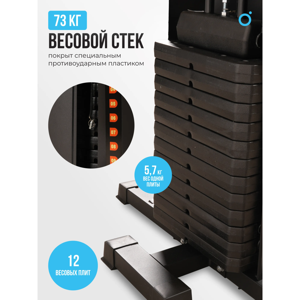 Комплекс позволяет выполнять разнообразные упражнения для всех групп мышц благодаря наличию 12 плит стека весом 5.7 кг каждая, что дает возможность легко настраивать уровень нагрузки. С системой тросов диаметром 6 мм и прочной стальной конструкции, вы можете быть уверены в безопасности и эффективности тренировок. Регулируемое сиденье с 4 уровнями высоты позволяет адаптировать тренажер под рост пользователя, что делает его подходящим для людей разного телосложения.