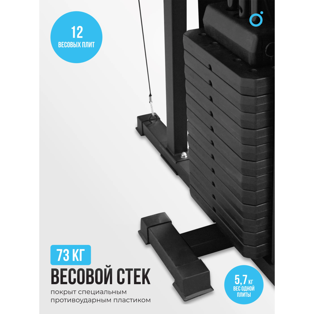 • высокая нагрузка: вес стека в 73 кг с 12 плитами по 5.7 кг каждая.