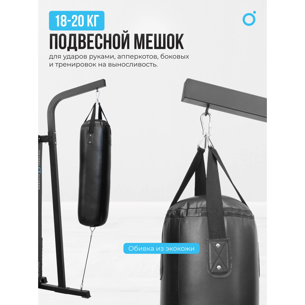 В OXYGEN FITNESS SITKOR предусмотрено использование качественных материалов. Подвесной мешок, выполненный из экокожи, весит 18-20 кг и дает новые возможности для кардио тренировок. Подушки и сиденья имеют оптимальные размеры для удобства: спинка — 22.5х39х6 см, подлокотники — 34.5х1х56 см, а скамья для пресса — 42х32х6 см. Наличие неопреновых валиков гарантирует дополнительный комфорт и защиту.
