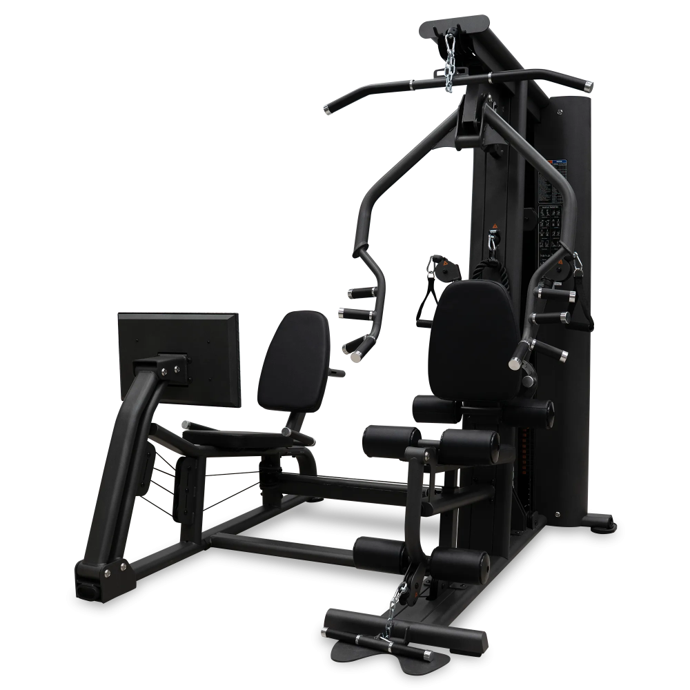 Комплекс оснащен грузоблочным стеком весом 60 кг, состоящим из 12 стальных плит по 5 кг каждая, что позволяет регулировать нагрузку до 60 кг. В комплект входят регулируемые по высоте элементы: тяга (кроссовер) — 7 уровней, спинка — 5 уровней, сиденье — 4 уровня, а также регулировка для жима от груди — 11 уровней. Эргономичное сиденье с наполнителем из PU-поролона и обивкой из искусственной кожи обеспечивает комфорт и поддержку во время тренировки. Для упражнений жим ногами предусмотрено 6 позиций регулировки спинки, а размеры подушек и валиков — оптимальны для комфортного выполнения различных упражнений.