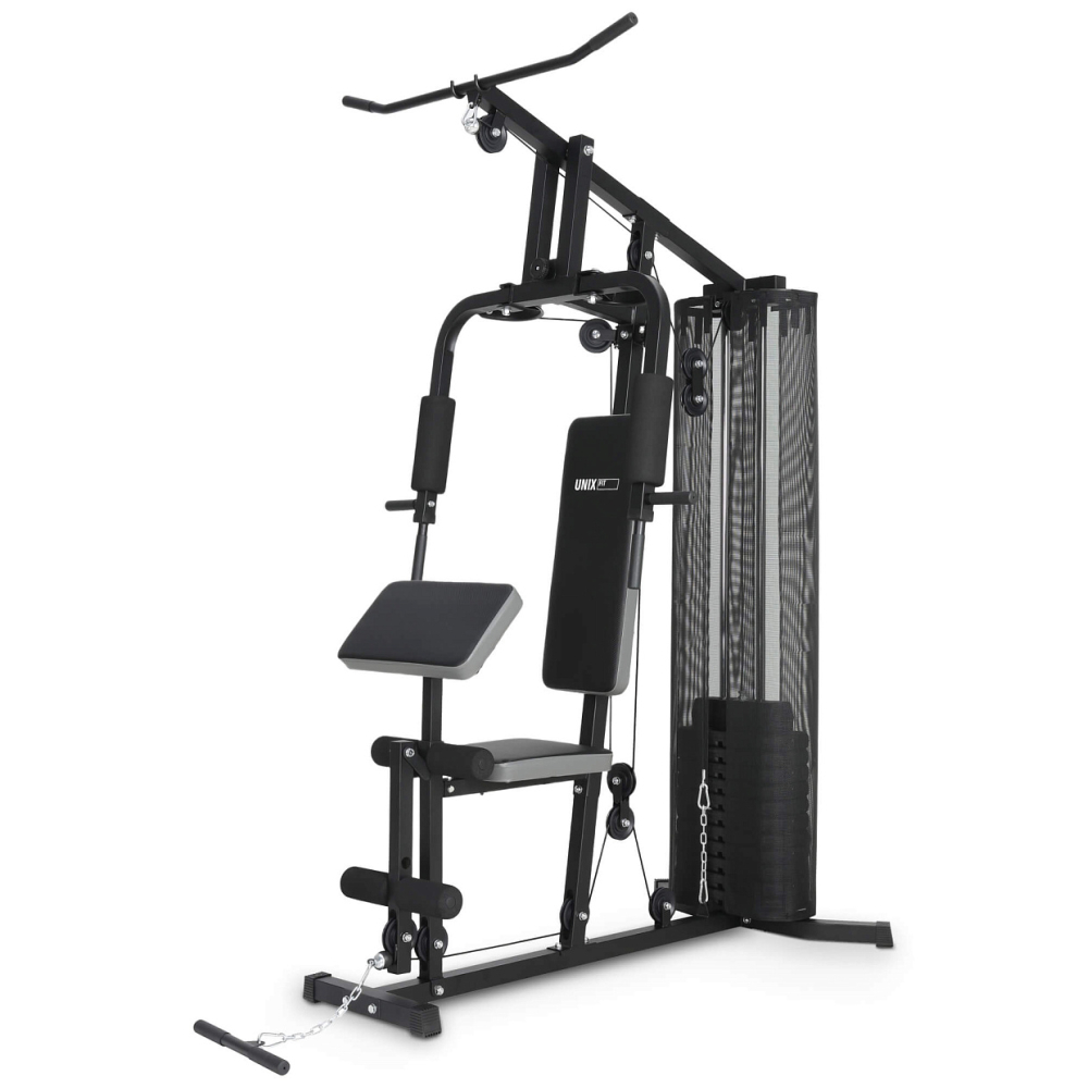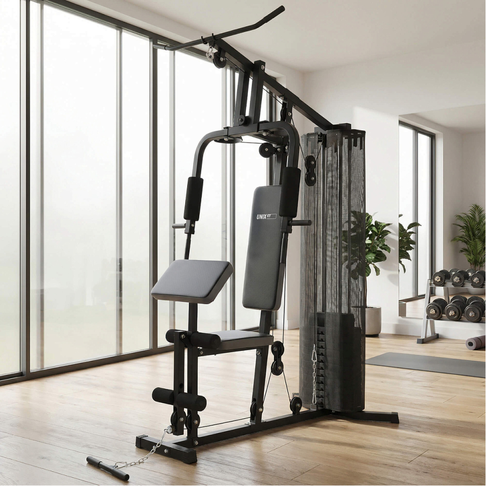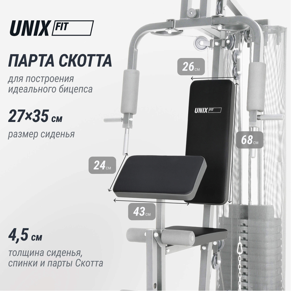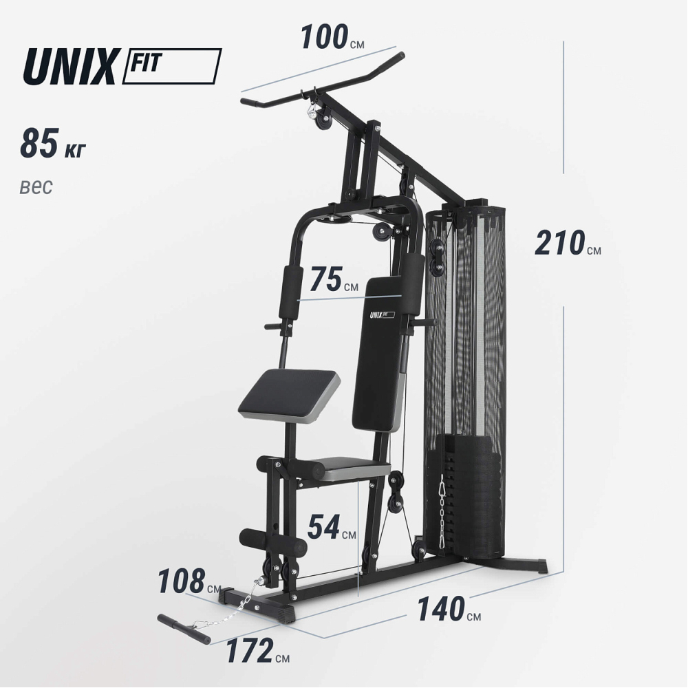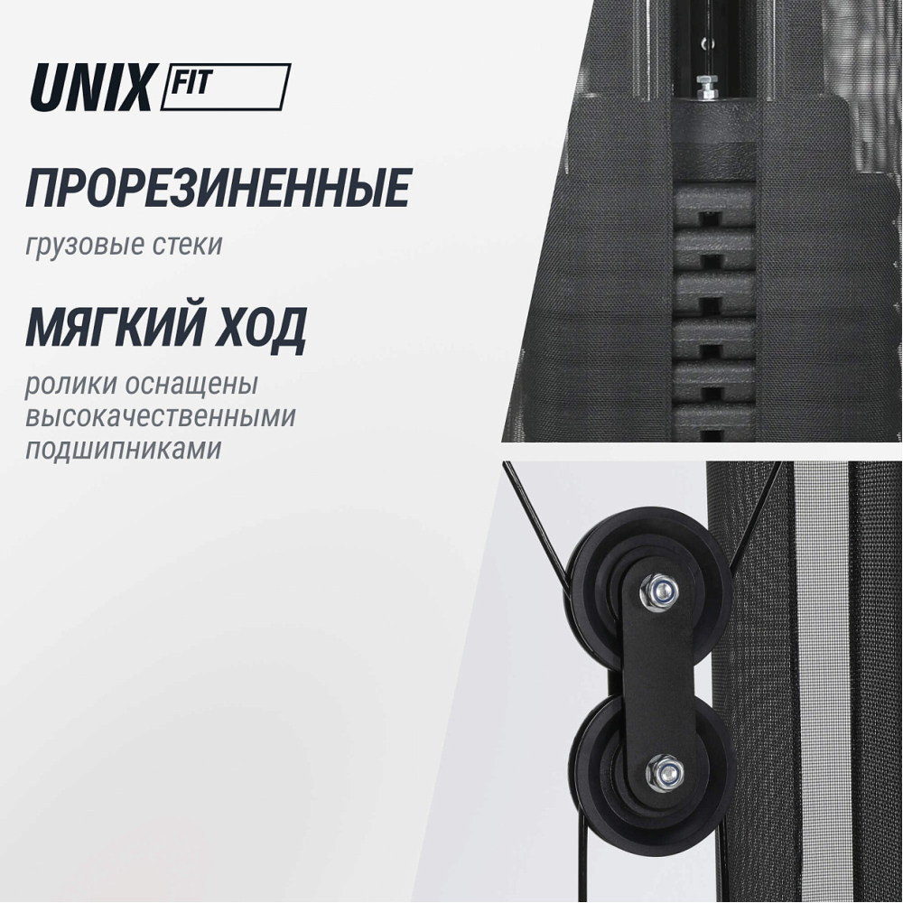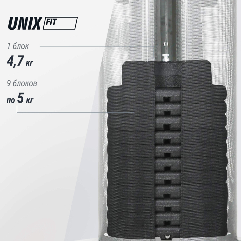 Силовой комплекс UNIX Fit BLOCK 50 представляет собой уникальный домашний тренажёр, предназначенный для эффективных силовых тренировок, позволяющих качественно прокачать основные мышечные группы. Этот домашний силовой комплекс заменит целый спортзал и станет незаменимым в формировании красивого тела и крепкого здоровья.. . Возможности для вашего здоровья. Тренажер для мужчин и женщин BLOCK 50 позволяет выполнять следующие виды упражнений:. . - Жим от груди: укрепляет грудные мышцы и плечи;. - Жим от плеч: развивает дельтовидные мышцы и трицепсы;. - Баттерфляй: формирует рельеф грудной клетки и улучшает осанку;. - Верхняя и нижняя тяги: укрепляют широчайшие мышцы спины и бицепсы;. - Приведение и отведение ног: позволяют подтянуть ягодицы и укрепить ноги;. - Пресс-спина: способствуют развитию брюшного пресса и стабилизирующих мышц корпуса;. - Разгибание и сгибание ног: помогают развить силу квадрицепсов и двуглавых мышц бедер;. - Сгибание на бицепс: эффективно наращивает объем бицепсов.. . Благодаря разнообразному функционалу и рабочему весу блоков 50 кг, многофункциональный силовой домашний тренажер подходит как начинающим спортсменам, так и опытным атлетам, стремящимся поддерживать отличную физическую форму.. . Надежность и комфорт. Мягкая спинка и эргономичное сидение обеспечивают максимальный комфорт во время тренировки. Ручки покрыты резиной, предотвращающей соскальзывания ладоней даже при интенсивных тренировках. Неопреновые мягкие валики повышают удобство выполнения упражнений. Надежные крепления гарантируют устойчивость и долговечность оборудования. Высококачественные стальные тросы, покрытые прочной оболочкой из ПВХ, обладают повышенной прочностью и долговечностью благодаря усиленным сварочным соединениям. Специальные ограничители движения троса защищают руки от травмирования. Рамная конструкция покрыта двухслойной порошковой краской, надежно защищающей поверхность от механических повреждений и коррозии.. . Премиальные материалы. Каркас домашнего спортивного тренажера выполнен из качественной стали, покрытой специальной двухслойной порошковой краской, способствующей длительному сохранению привлекательного вида изделия. Оборудование оснащено покрытием из экокожи премиум-класса с плетеной структурой Carbon TX, которое обеспечивает эстетичный внешний вид и защищает конструкцию от износа и загрязнений. . . Высокое качество материалов гарантирует продолжительный срок службы и сохранение превосходного внешнего вида тренажера для спины, рук, ног, пресса на протяжении многих лет активного использования.. Силовой спорт комплекс UNIX Fit BLOCK 50 является идеальным решением для тех, кто хочет проводить эффективные тренировки прямо у себя дома.. . Тренируйтесь с удовольствием вместе с UNIX Fit!. .