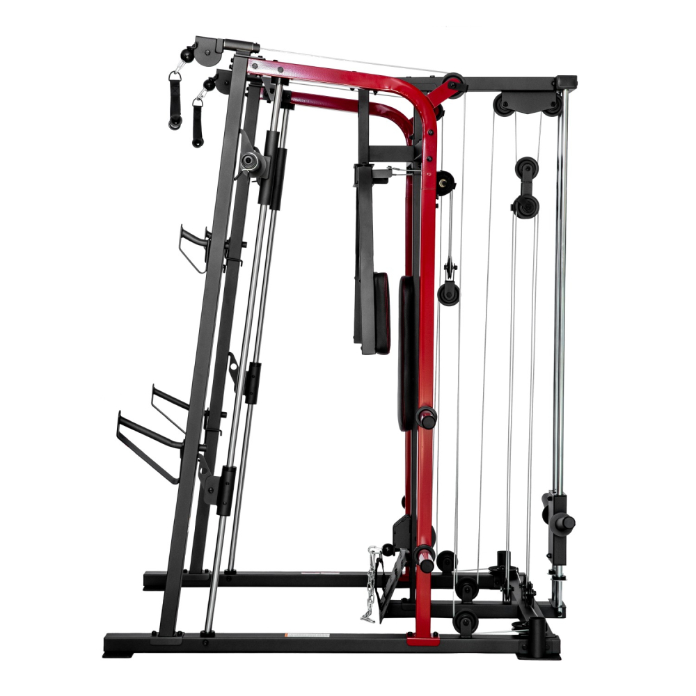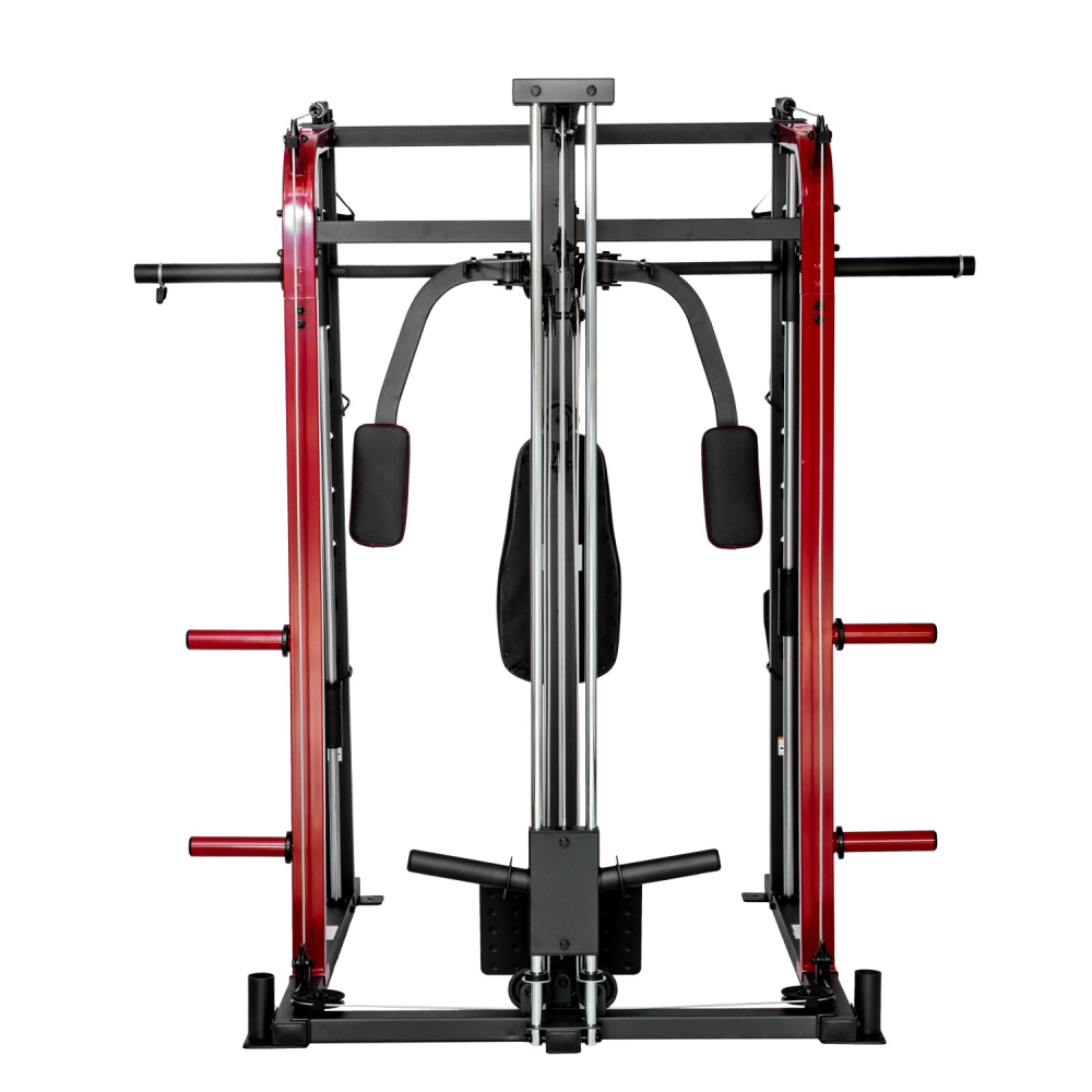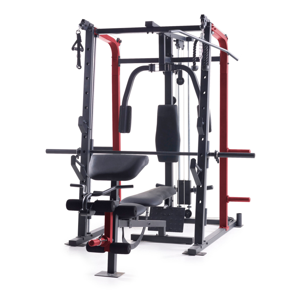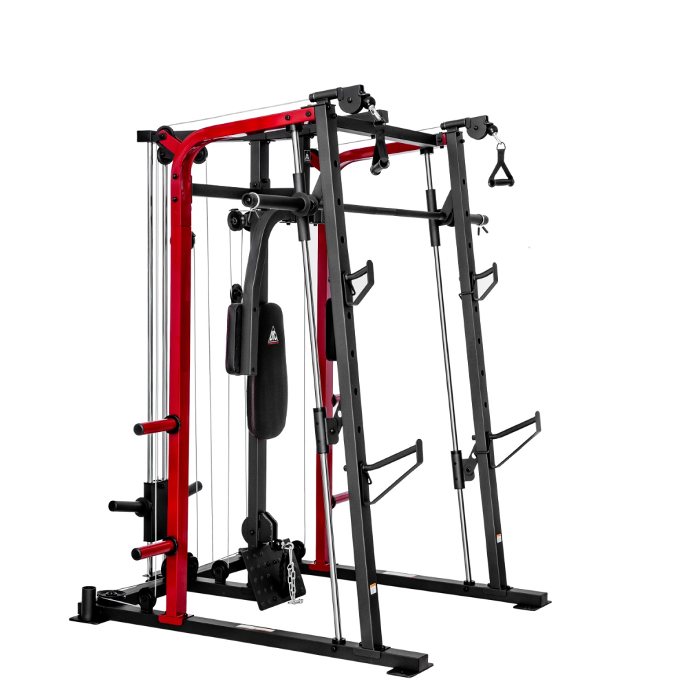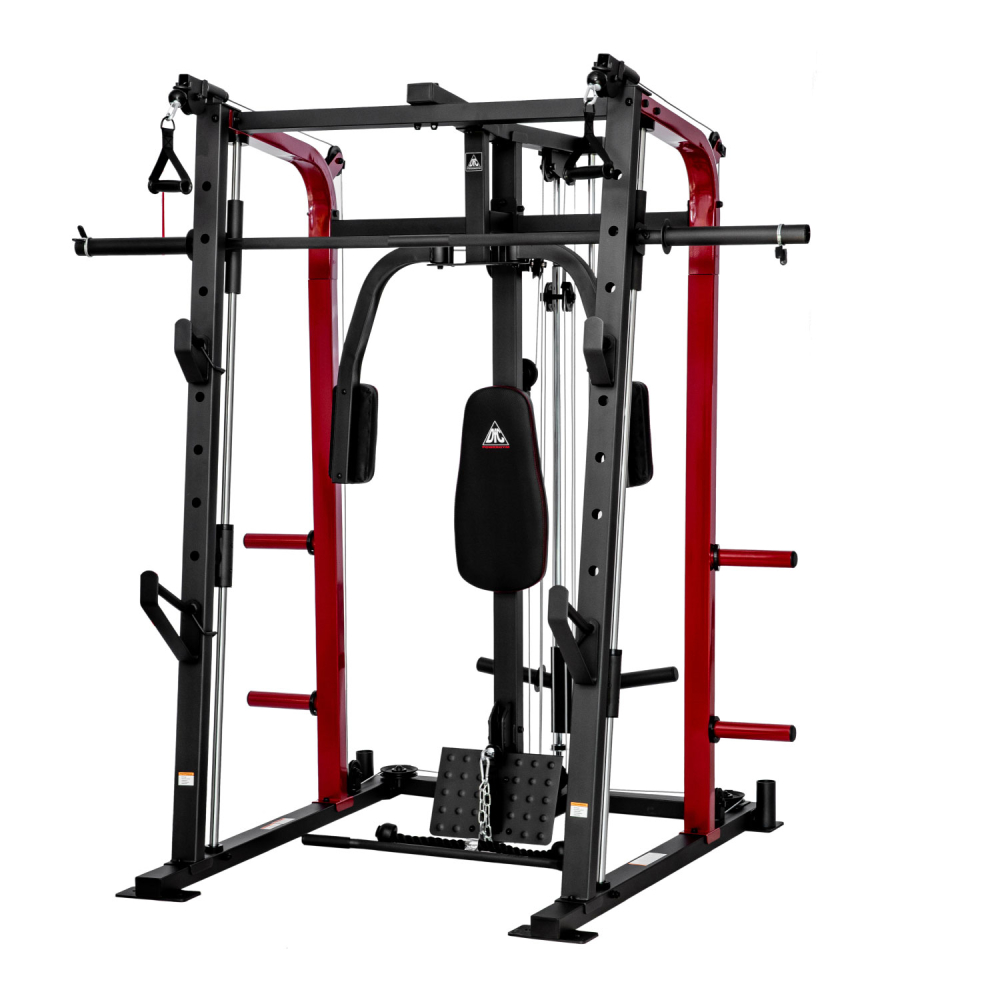 Силовая станция со скамьей на базе Машины Смита DFC 8500 - премиальное исполнение популярного силового тренажера Weider 8500. Комплект состоит из Машины Смита DFC D3022SM и скамьи с опциями DFC D3023B. Тренажер предназначен для выполнения различных силовых упражнений: Машина Смита, тяга сверху / снизу, баттерфляй, парта для бицепса, сгибание / разгибание, жим лежа на скамье дополнительной штанги (штанга и диски опция). Отдельно стоящая скамья с партой для бицепса и рычагом для тренировки ног (сгибание / разгибание). Спинка скамьи позволяет отрегулировать угол наклона. Изготовлена из прочного стального профиля. В комплекте: гриф, 2 рукоятки для тяги, ремень на лодыжку, гибкая тяга для трицепса, замки-пружины для фиксации дисков. В качестве нагрузки используются диски Ø51 мм (опция, приобретаются отдельно). Кронштейны для установки штанги и предохранители регулируются по высоте. Для хранения весов (дисков) предусмотрены 4 держателя, посадочный размер 51 мм.