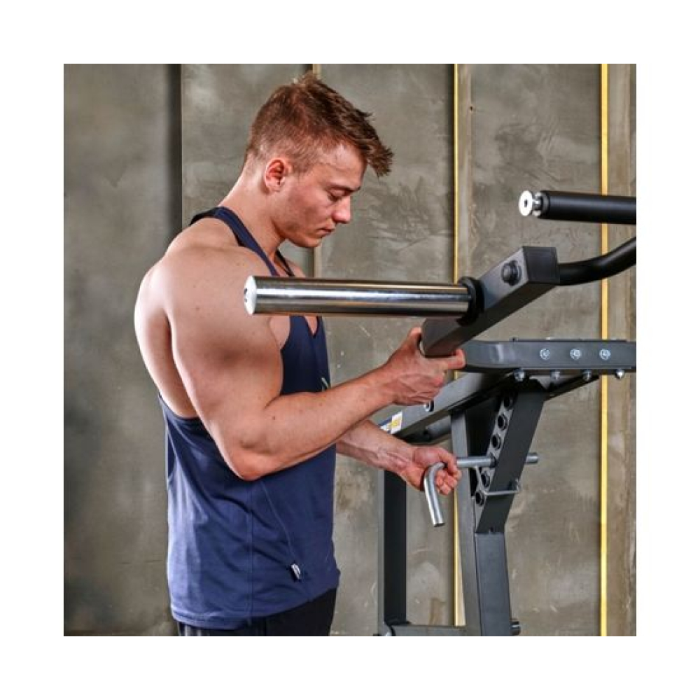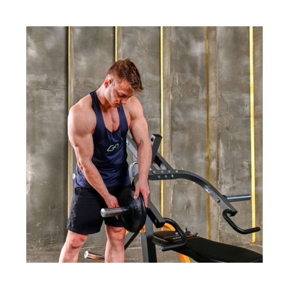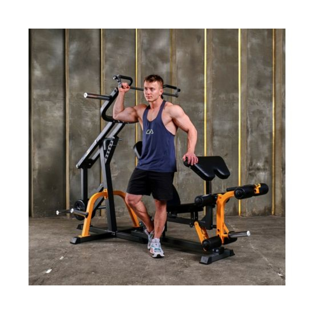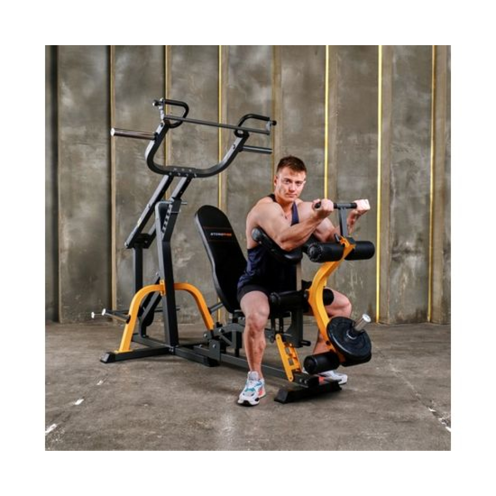 Скамья с опциями STONERISE D2015 UltraShape. Предназначена для развития мышц всего тела благодаря большому количеству снарядов, поставляющихся в комплекте.Сиденье регулируется на 4 уровня по углу наклона, спинка – на 8 уровней. Турник регулируется по высоте на 5 уровней. Парта для бицепса регулируется по высоте на 7 уровней.Доступно 2 посадочных места для хранения дисков.В комплекте: Турник для жима от груди и тяги к груди Рукоятка для гребли Парта для бицепса Валики для ног Гриф для тяги сверху