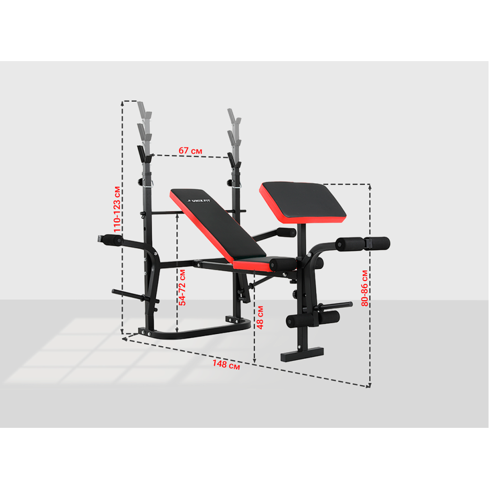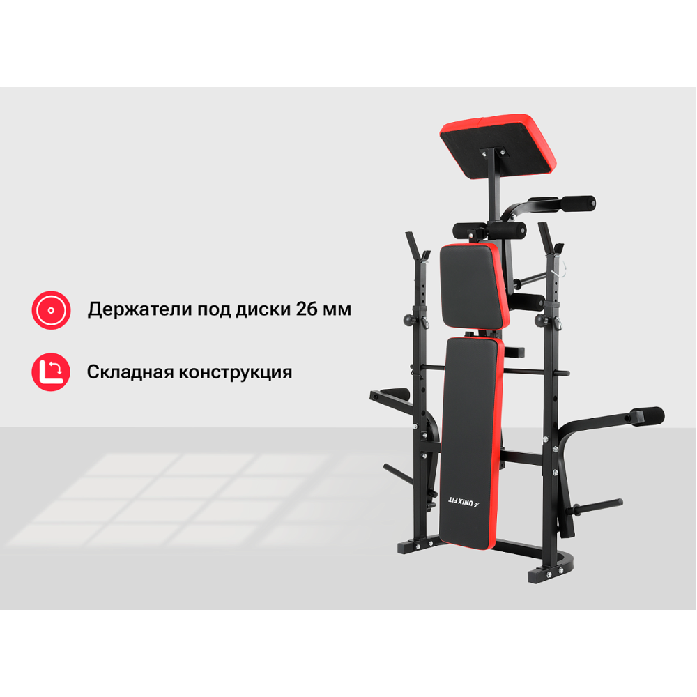 Скамья силовая со стойками UNIX Fit BENCH 120P предназначена для выполнения упражнений со штангой и гантелями. Идеально подходит для домашних тренировок и позволяет прокачать следующие группы мышц:. - мышцы кора;. - мышцы спины;. - мышцы грудного отдела;. - мышцы плечевого пояса и рук;. - мышцы бедра и голени;. - ягодичные мышцы Плюсы универсальной силовой скамьи со стойками UNIX Fit BENCH 120P:. - Регулировка уровня штанги по высоте от 110 см до 123 см (5 уровней);. - Спинка регулируется по углу наклона, доступны 3 положения;. - Силовые стойки с прорезиненными ложементами под штангу уменьшают шум во время тренировки и не дают поцарапаться рукояткам. Снаряд надежно зафиксирован;. - Быстрая и интуитивно понятная сборка;. - Надежность. Высококачественная сталь и усиленные сварные швы обеспечат безопасность во время тренировки;. - Складная конструкция скамьи с опциями для хранения после тренировки. Для проведения эффективной тренировки рекомендуем приобрести дополнительно:. - Грифы и диски UNIX Fit;. - Гантели с регулировкой веса UNIX Fit;. - В качестве нагрузки для баттерфляй и жим ногами подходят диски UNIX Fit Ø26мм Товар поставляется в разобранном виде. Мы с удовольствием предоставим услугу по сборке тренажера за дополнительную плату. Организуем доставку по РФ и странам СНГ. Регулярные тренировки помогут вам обрести хорошую физическую форму, получить заряд энергии и позитивное настроение! С UNIX Fit жизнь ярче!